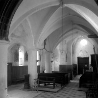 La nef, assez atypique, garde peut-être le souvenir de celle du 12ème siècle, à laquelle un bas-côté a été ajouté par la suite au sud. On peut voir dans ce dernier une cuve baptismale du 16ème siècle (1996).