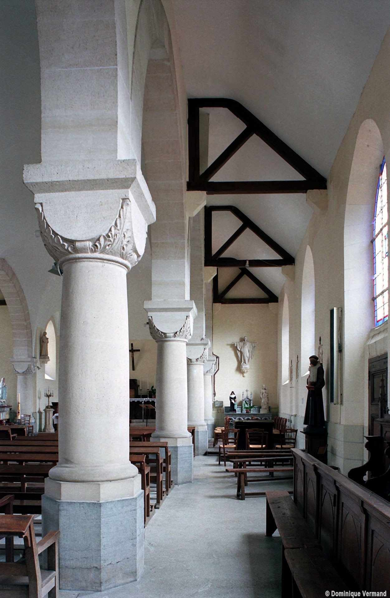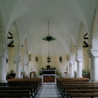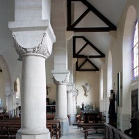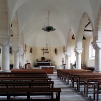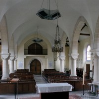 Le premier, qui joue dans un sens vertical, est la hauteur identique donnée aux bas-côtés et au vaisseau central, les voûtes d’arêtes dont est couvert celui-ci retombant directement sur les arcades. Le second, qui joue dans un sens transversal, est l’utilisation de piles circulaires pour les arcades, une forme qui permet au regard de glisser plus naturellement vers les murs périphériques. Le troisième enfin, qui joue dans un sens longitudinal, est l’absence d’arcs-doubleaux entre les travées, qui se succèdent ainsi visuellement sans interruption jusqu’au choeur, lui-même privé d’arc triomphal. La seule touche décorative de cet édifice traité avec une sobriété extrême réside dans le décor de feuilles sculptées aux angles et à la base des chapiteaux cubiques, les faces de la corbeille restant nues (2008).