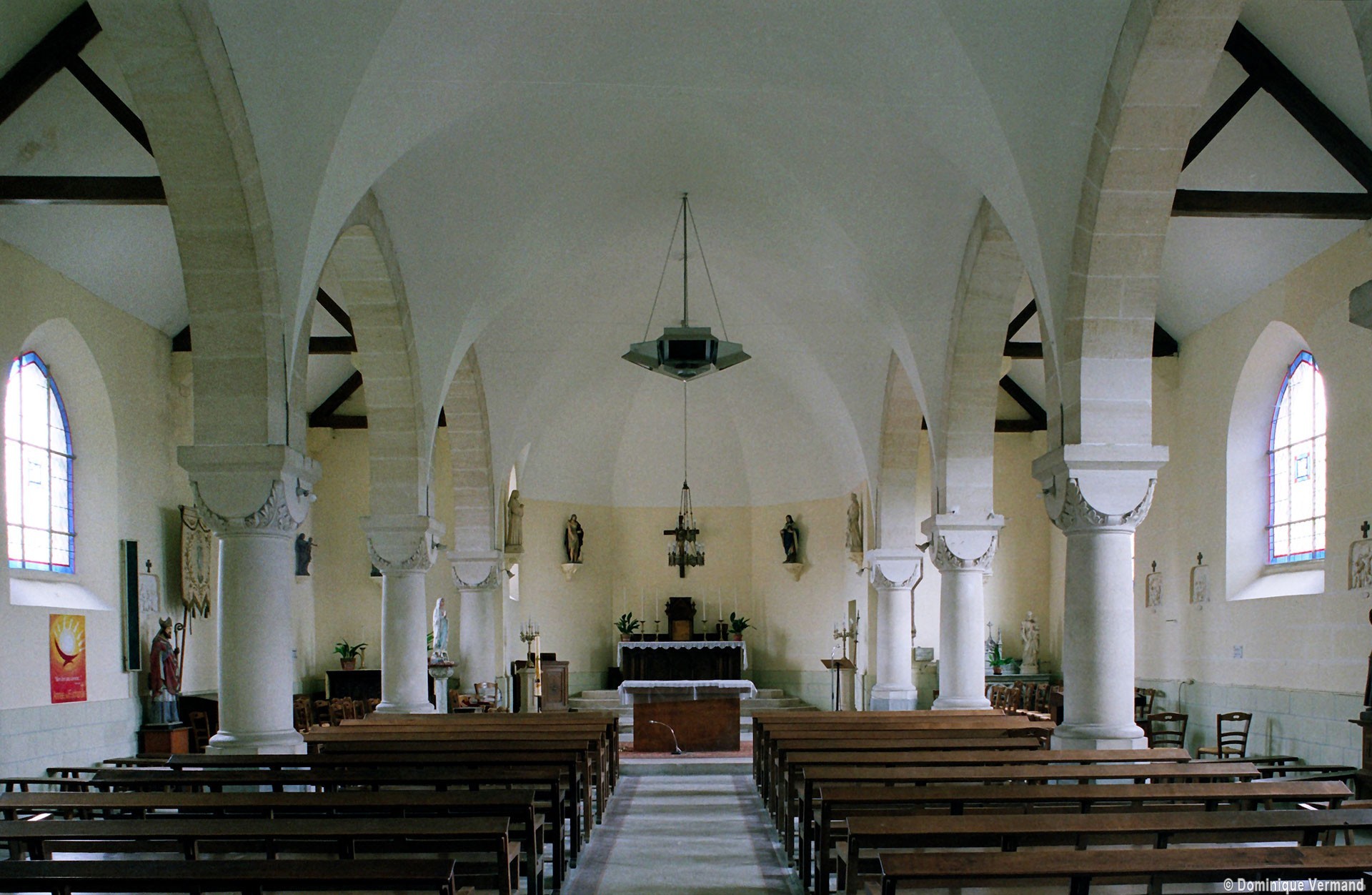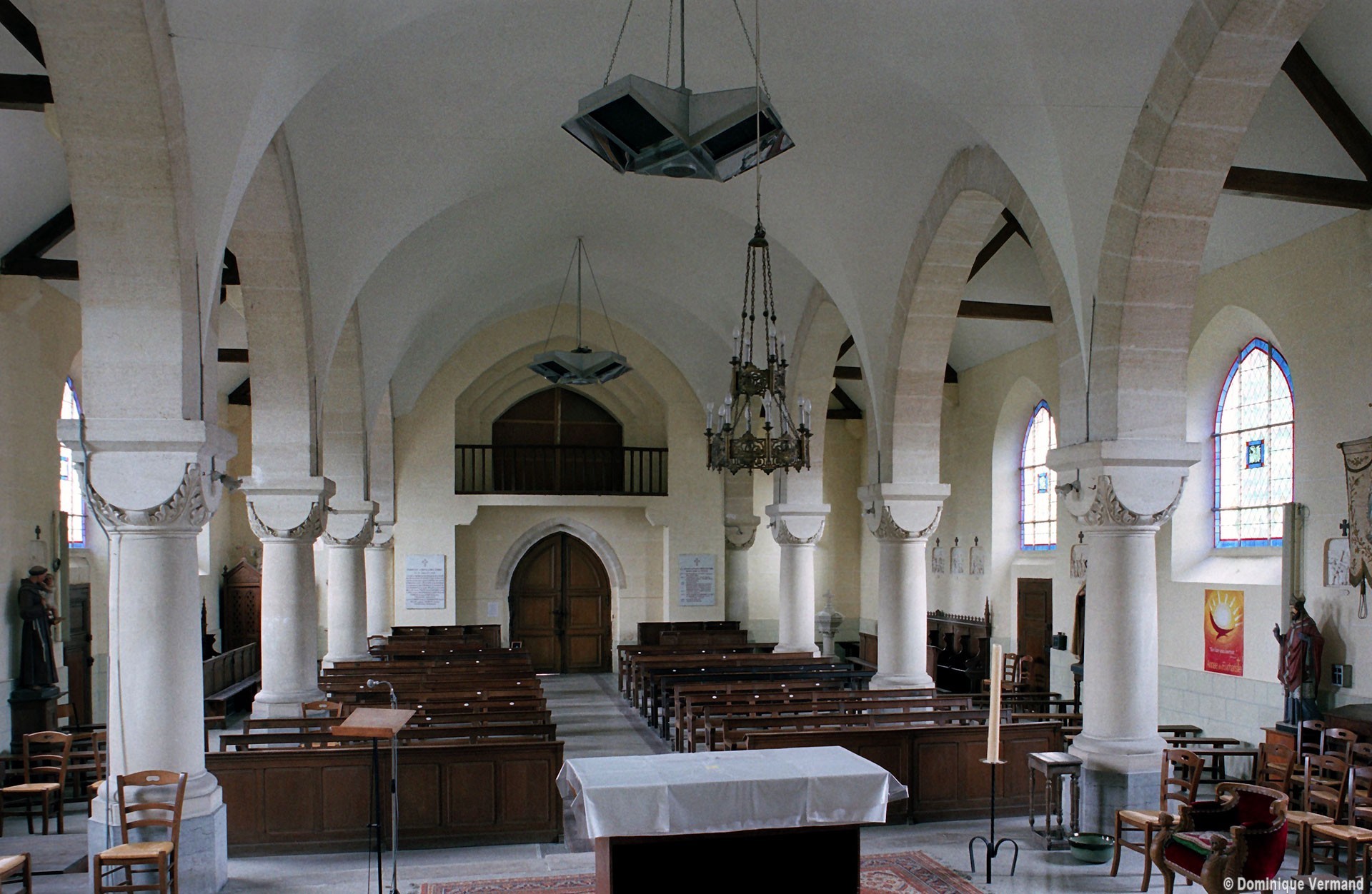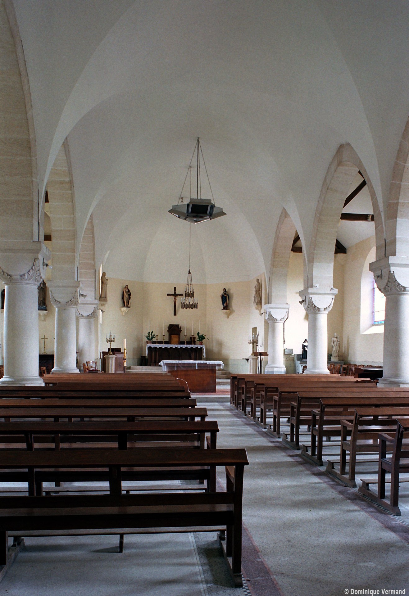 Derrière le clocher, doté d’une tribune, l’édifice comprend une nef de quatre travées avec bas-côtés et un choeur pentagonal. Peu original dans son vocabulaire architectural emprunté aux styles roman et gothique (voûtes d’arêtes, arcades brisées, chapiteaux cubiques, piles circulaires…), l’ensemble vaut surtout pour son unité spatiale, à laquelle concourent trois éléments.