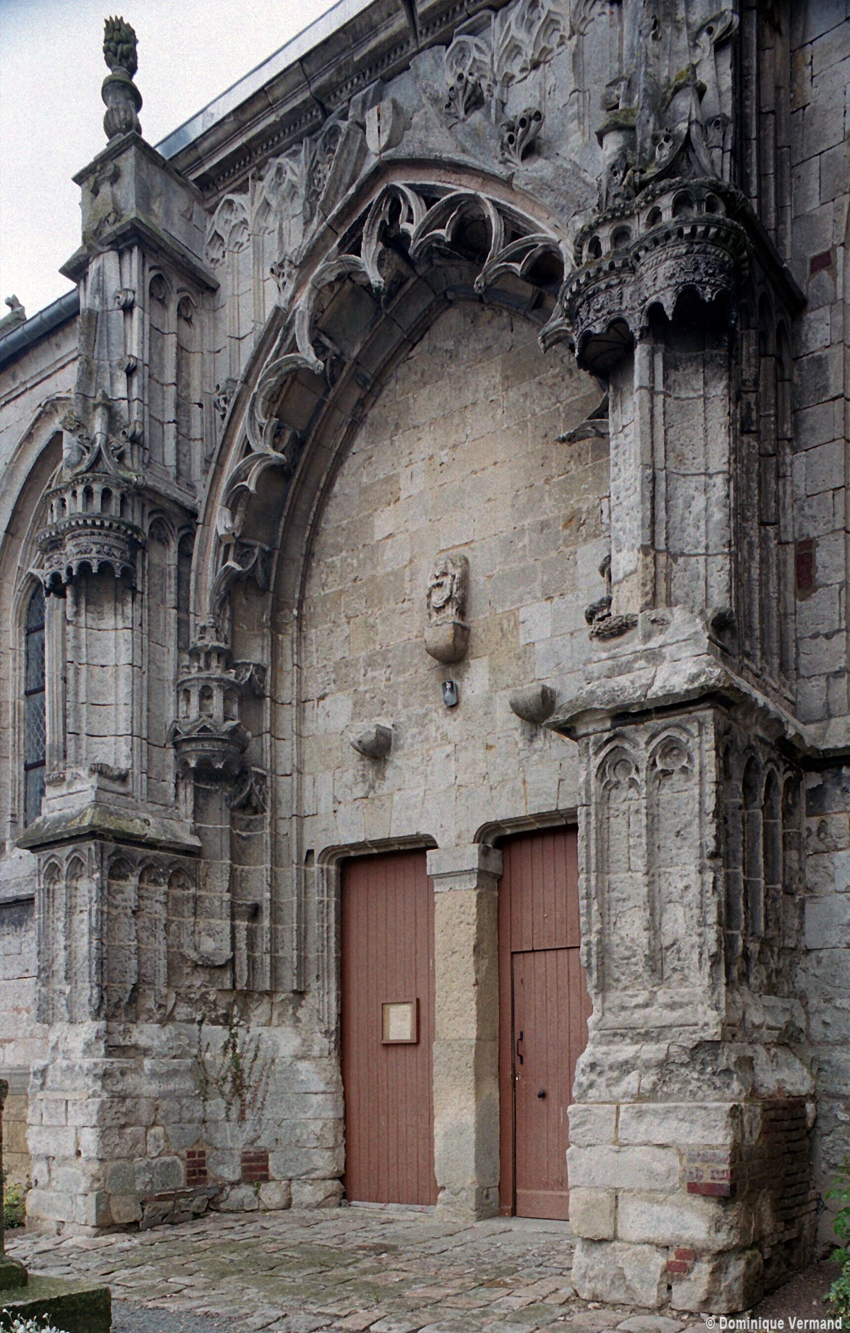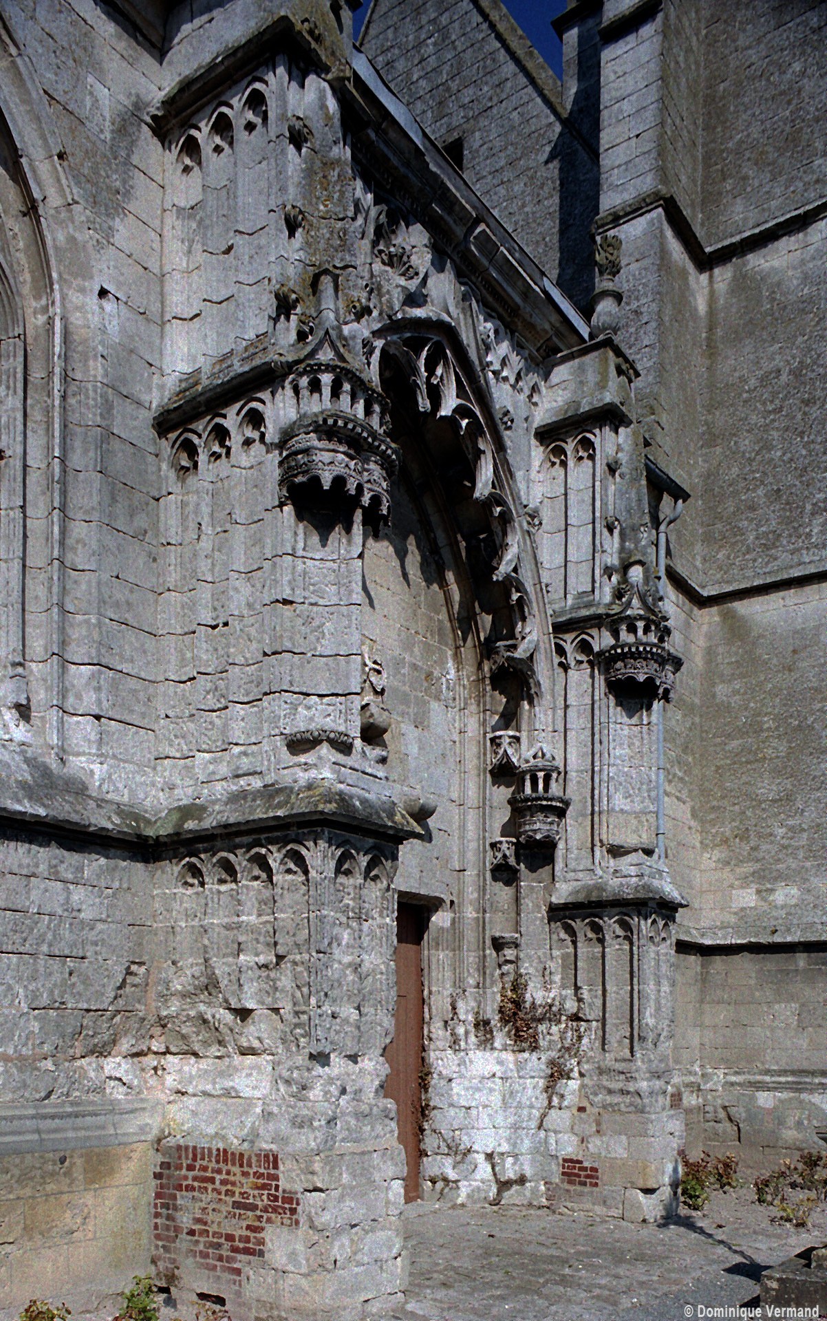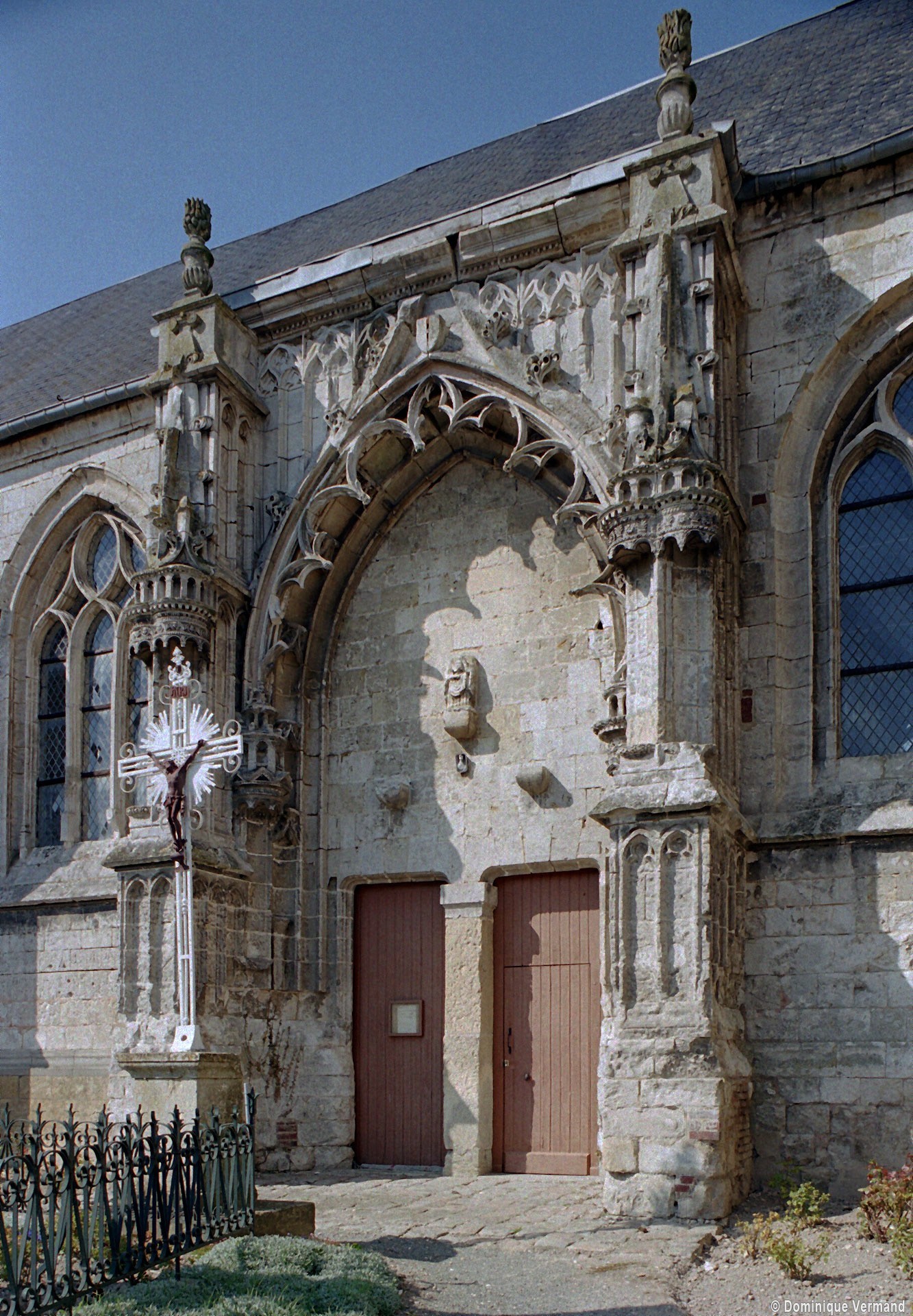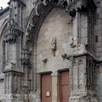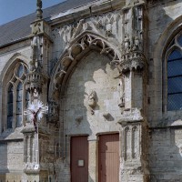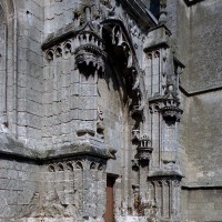 A l’extérieur, l’attention se porte sur le magnifique portail méridional, ouvert au droit de la troisième travée de la nef. D’une composition très monumentale et d’une ornementation très riche, il associe intimement les styles gothique flamboyant (arcade polylobée, arcatures aveugles du soubassement et de la partie supérieure) et de la Renaissance (niches avec dais des deux contreforts). Ce mélange des styles est également perceptible dans le réseau des fenêtres, flamboyant au chœur et Renaissance à la nef, une différence qui indique que celle-ci est légèrement plus tardive.
