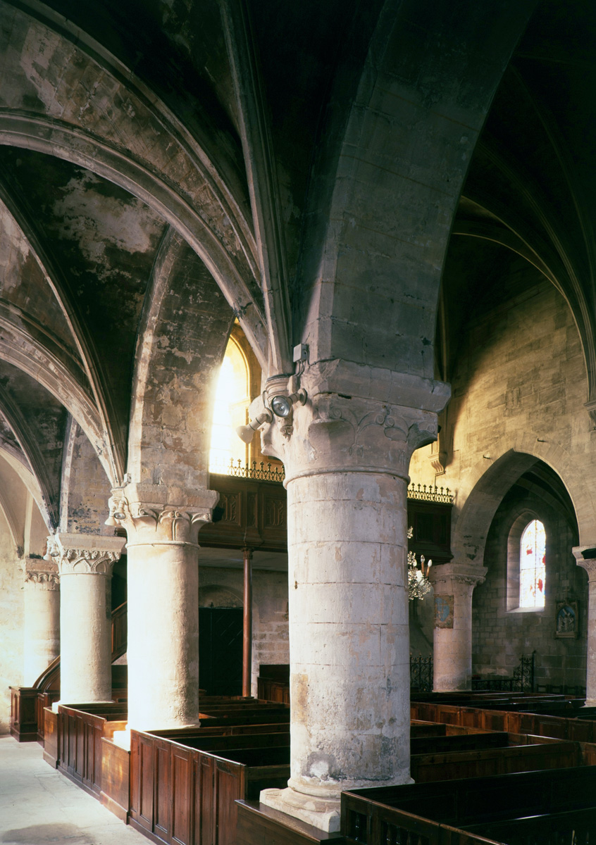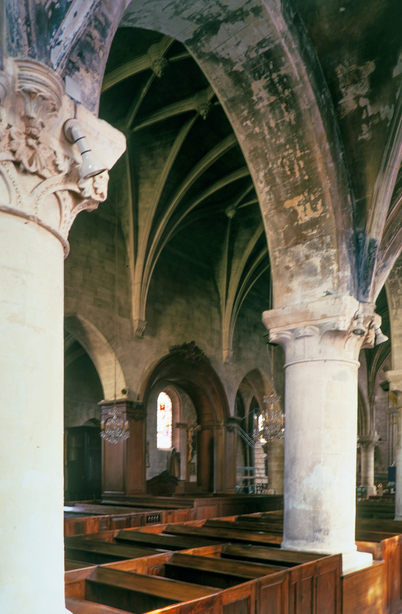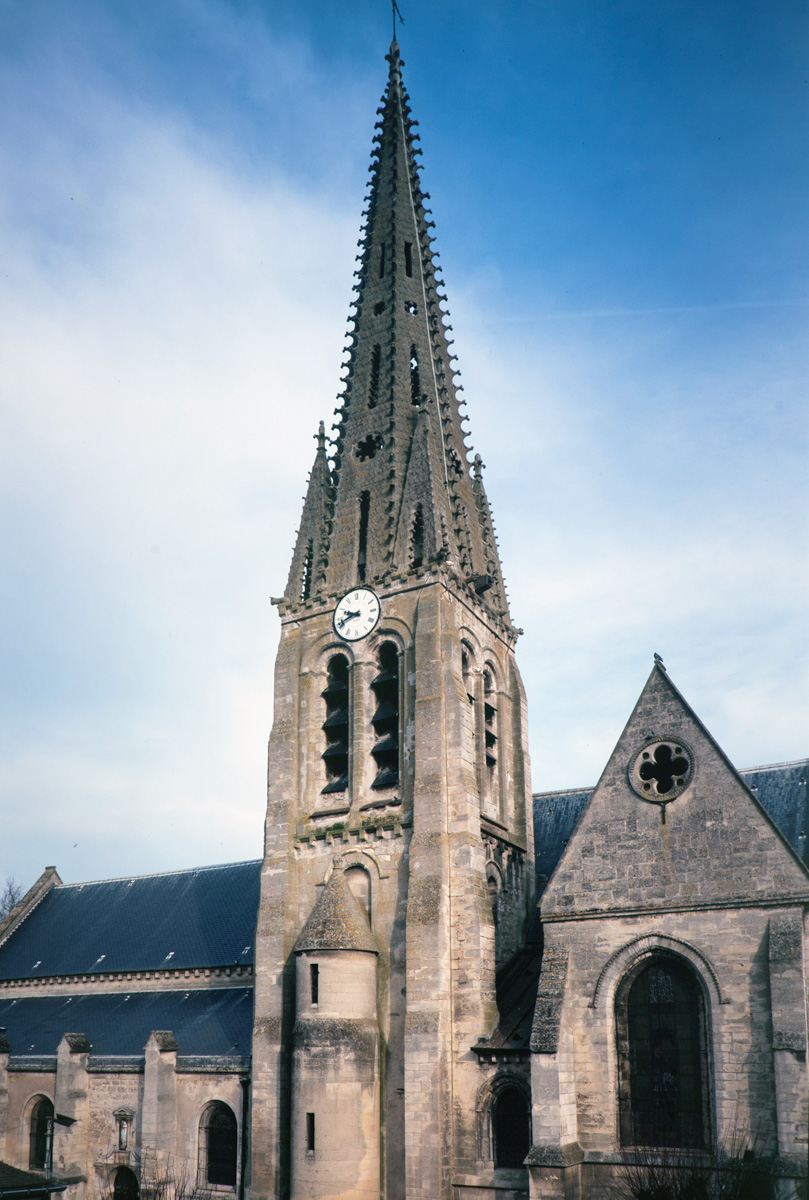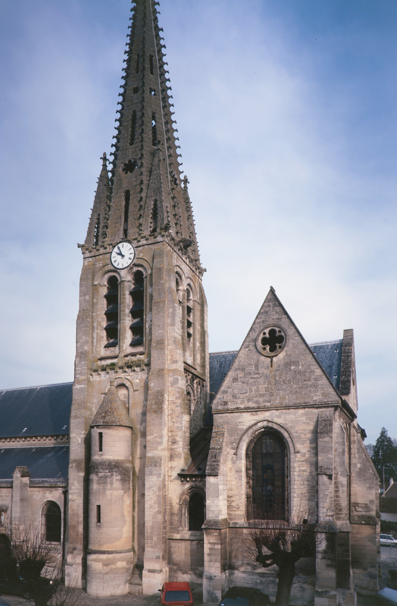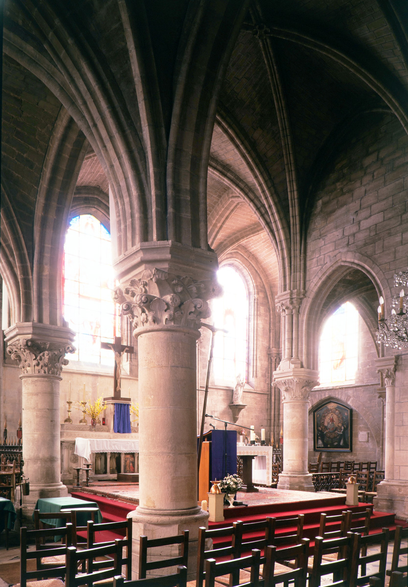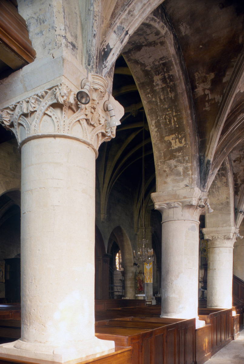 De l’église construite dans la seconde moitié du 12ème siècle restent la nef, la partie ouest du transept et le clocher. Couverte de voûtes d’ogives avec liernes et tiercerons au 17ème siècle, la nef ne comportait à l’origine q’une simple charpente. Ses cinq travées communiquent avec les bas-côtés par des arcades brisées retombant sur des piles circulaires, une véritable rareté dans la région à cette époque. Il faut y voir l’influence de la cathédrale de Senlis, également présente dans le décor des chapiteaux (feuilles d’acanthe, feuilles plates s’enroulant en boule, tiges perlées…) Aujourd’hui bouchées, les fenêtres s’ouvraient dans l’axe des piles et non des arcades. Fréquent dans la région, ce parti évitait de monter trop haut les murs gouttereaux, fortement sollicités par le poids de la charpente.