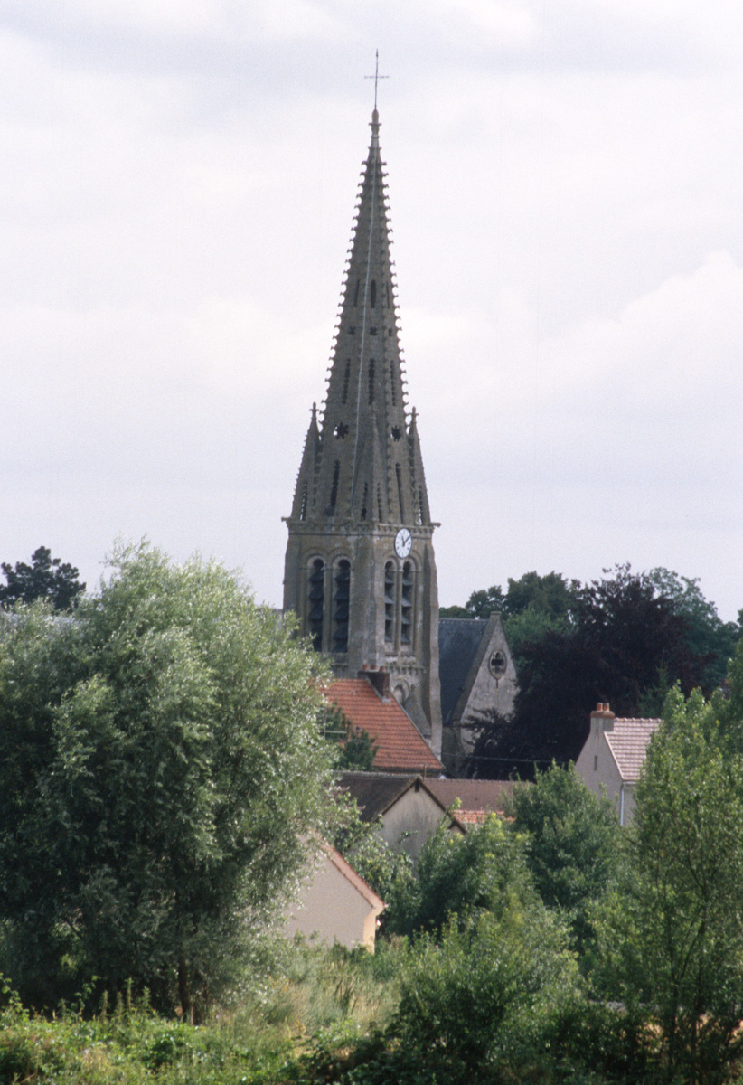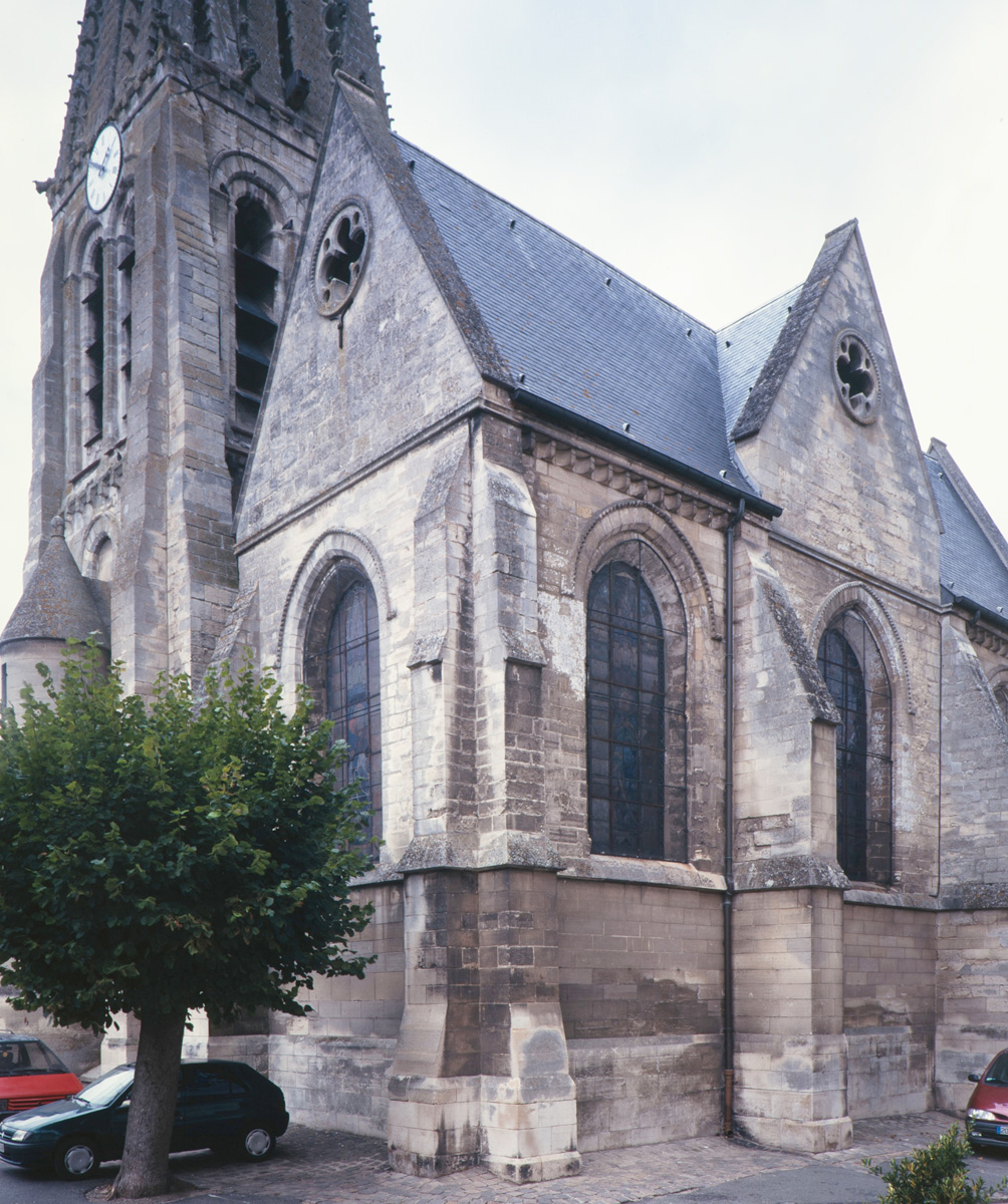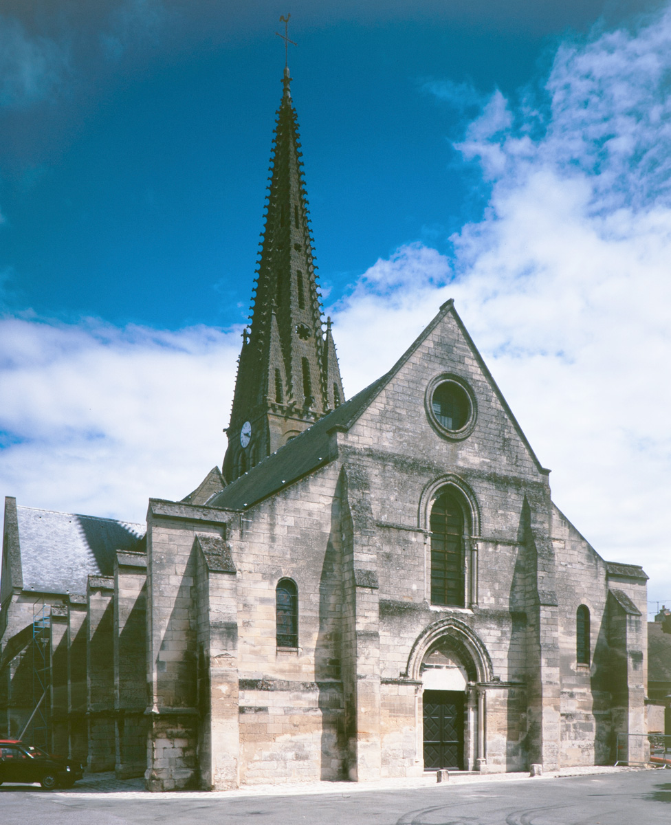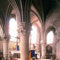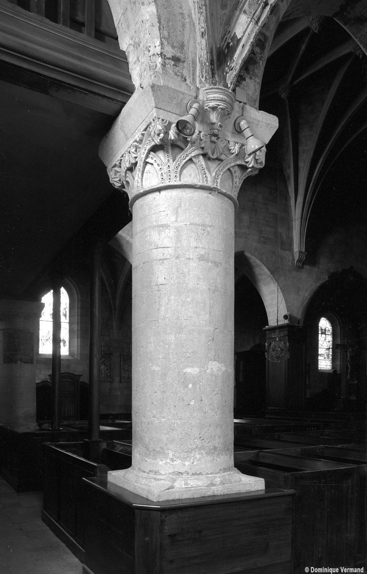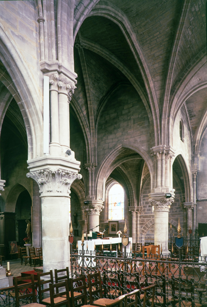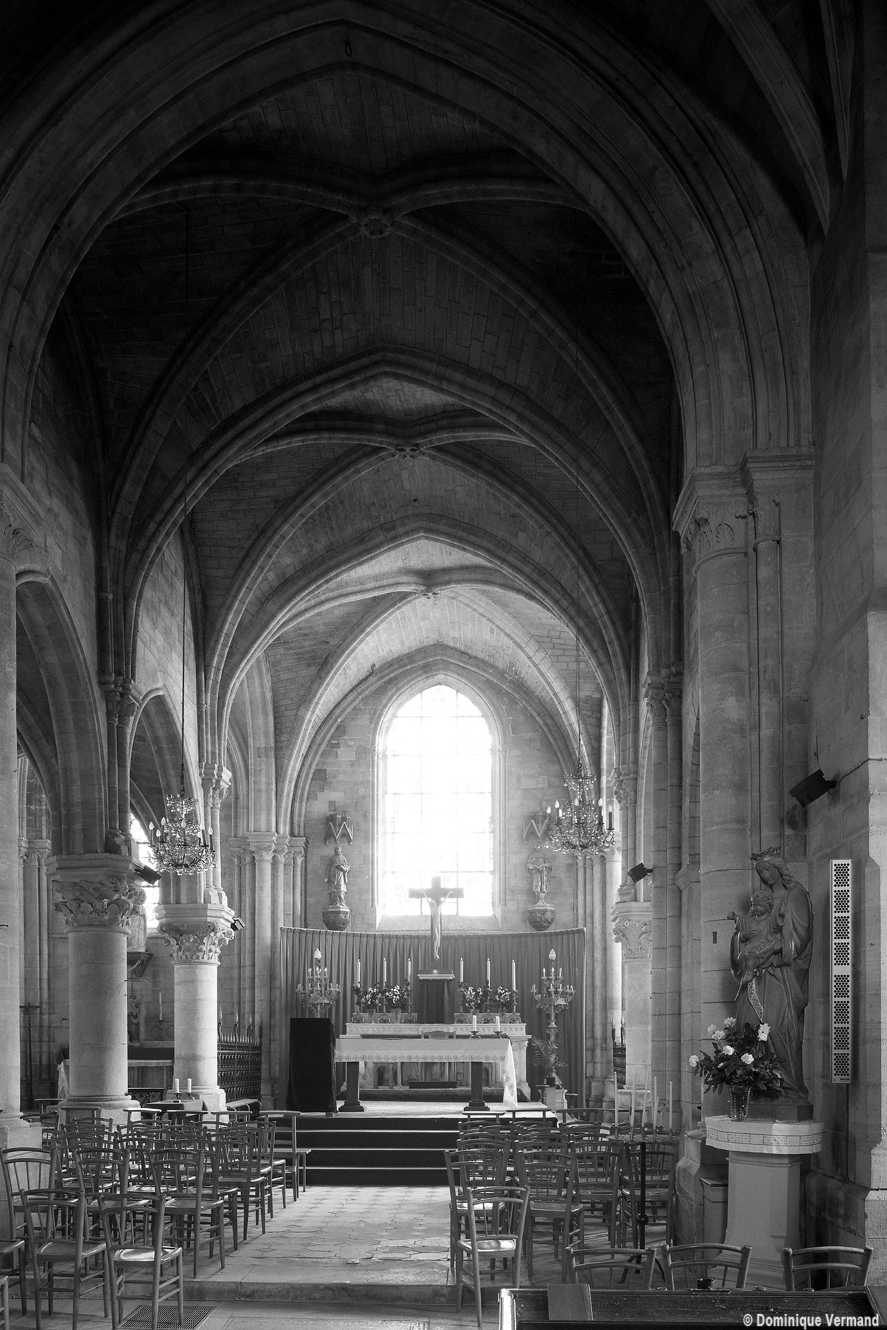 De l’église construite dans la seconde moitié du 12ème siècle restent la nef, la partie ouest du transept et le clocher. Couverte de voûtes d’ogives avec liernes et tiercerons au 17ème siècle, la nef ne comportait à l’origine q’une simple charpente. Ses cinq travées communiquent avec les bas-côtés par des arcades brisées retombant sur des piles circulaires, une véritable rareté dans la région à cette époque. Il faut y voir l’influence de la cathédrale de Senlis, également présente dans le décor des chapiteaux (feuilles d’acanthe, feuilles plates s’enroulant en boule, tiges perlées…) Aujourd’hui bouchées, les fenêtres s’ouvraient dans l’axe des piles et non des arcades. Fréquent dans la région, ce parti évitait de monter trop haut les murs gouttereaux, fortement sollicités par le poids de la charpente.
