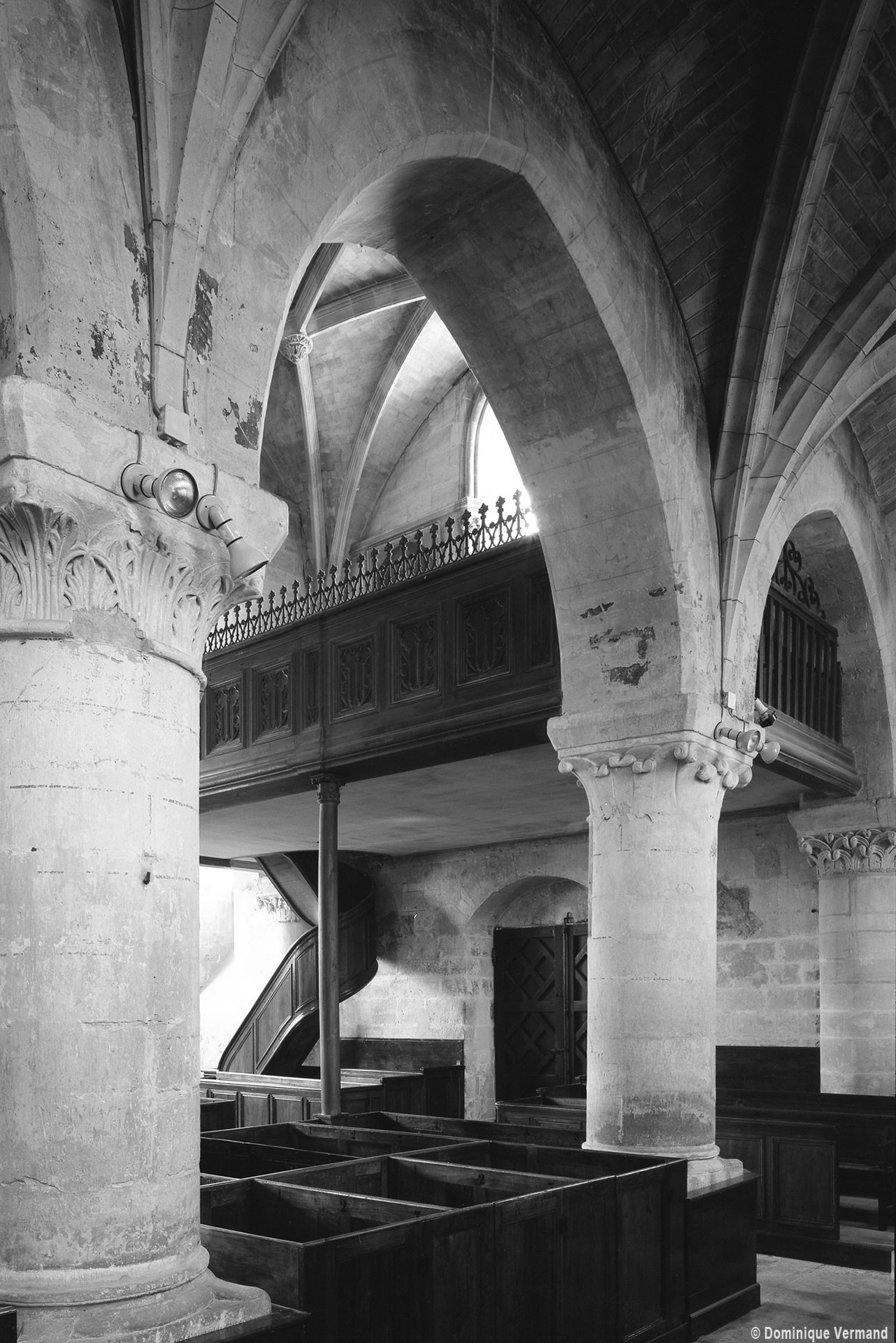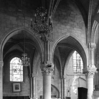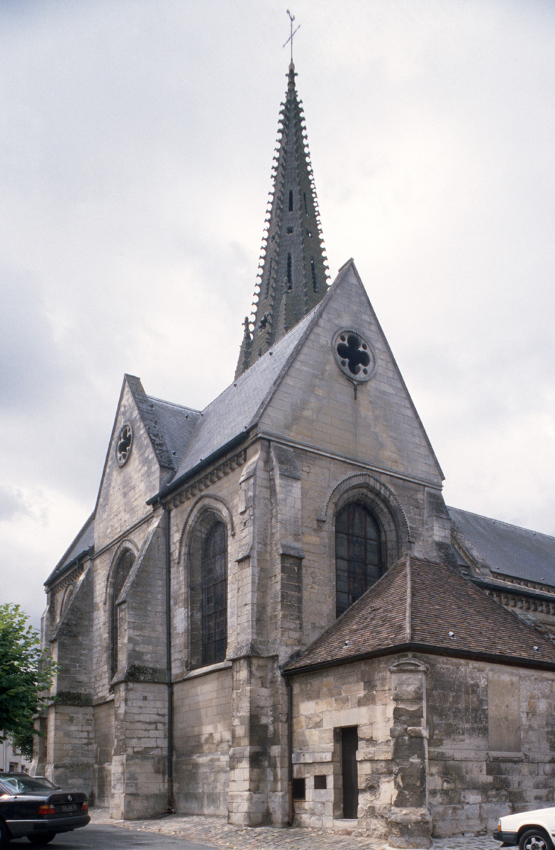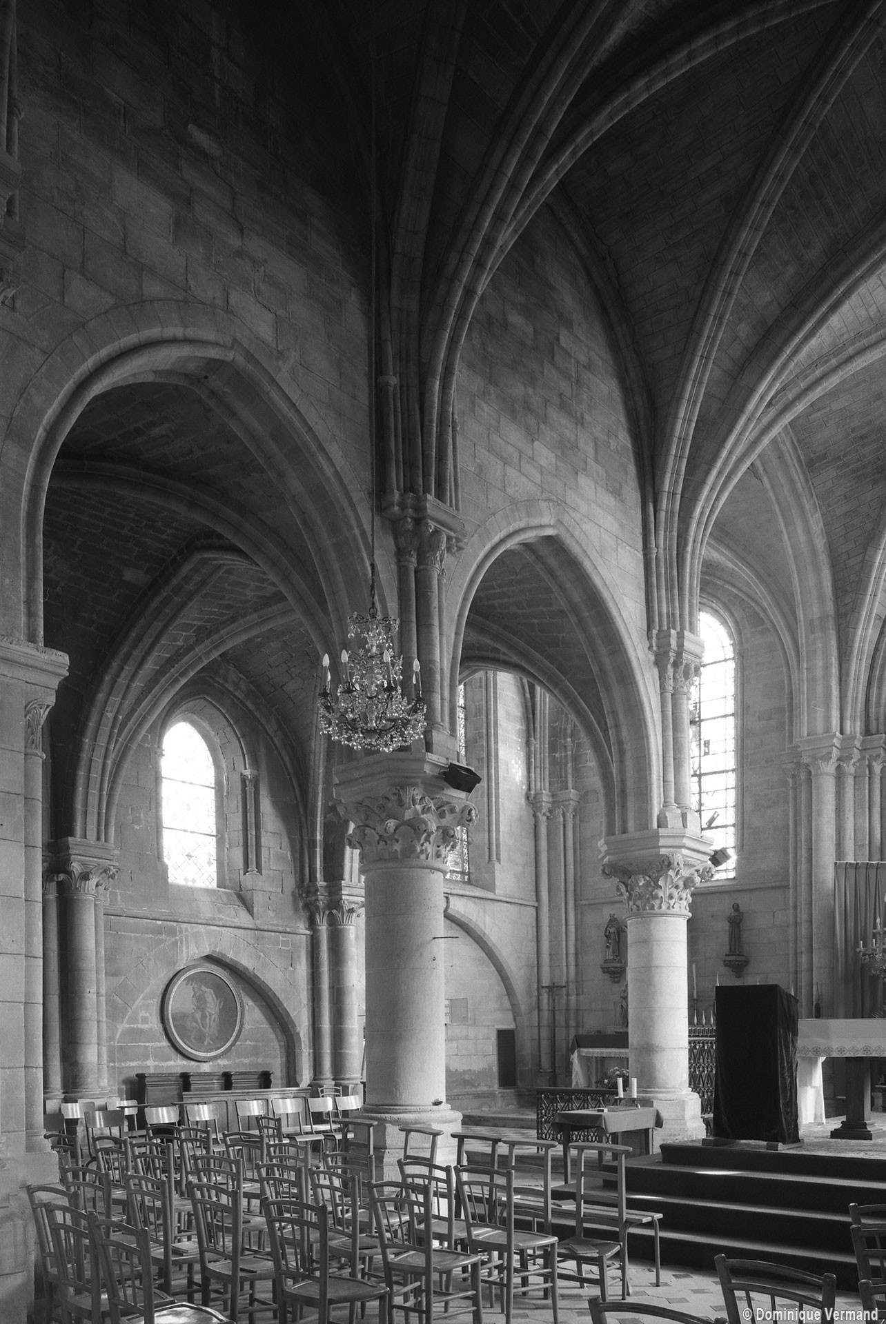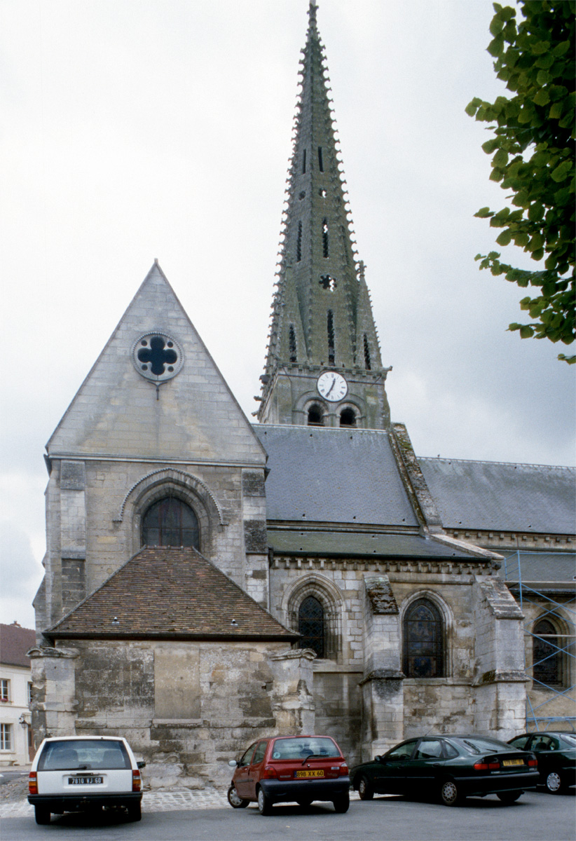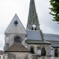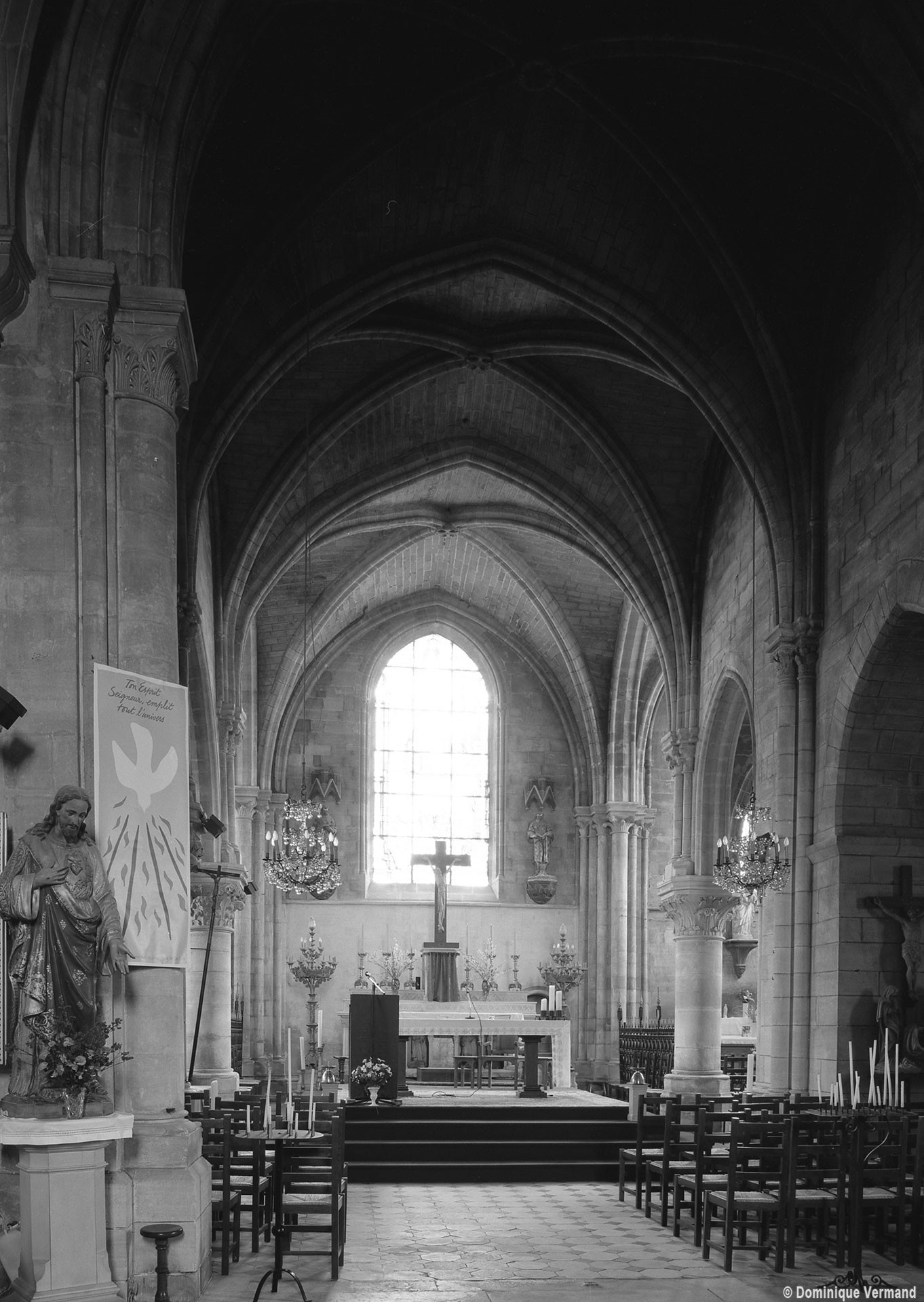 De l’église construite dans la seconde moitié du 12ème siècle restent la nef, la partie ouest du transept et le clocher. Couverte de voûtes d’ogives avec liernes et tiercerons au 17ème siècle, la nef ne comportait à l’origine q’une simple charpente. Ses cinq travées communiquent avec les bas-côtés par des arcades brisées retombant sur des piles circulaires, une véritable rareté dans la région à cette époque. Il faut y voir l’influence de la cathédrale de Senlis, également présente dans le décor des chapiteaux (feuilles d’acanthe, feuilles plates s’enroulant en boule, tiges perlées…) Aujourd’hui bouchées, les fenêtres s’ouvraient dans l’axe des piles et non des arcades. Fréquent dans la région, ce parti évitait de monter trop haut les murs gouttereaux, fortement sollicités par le poids de la charpente.
