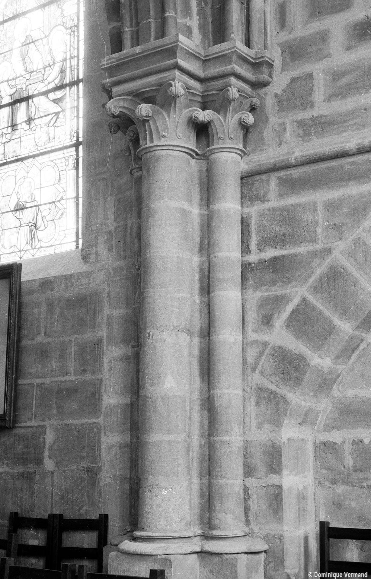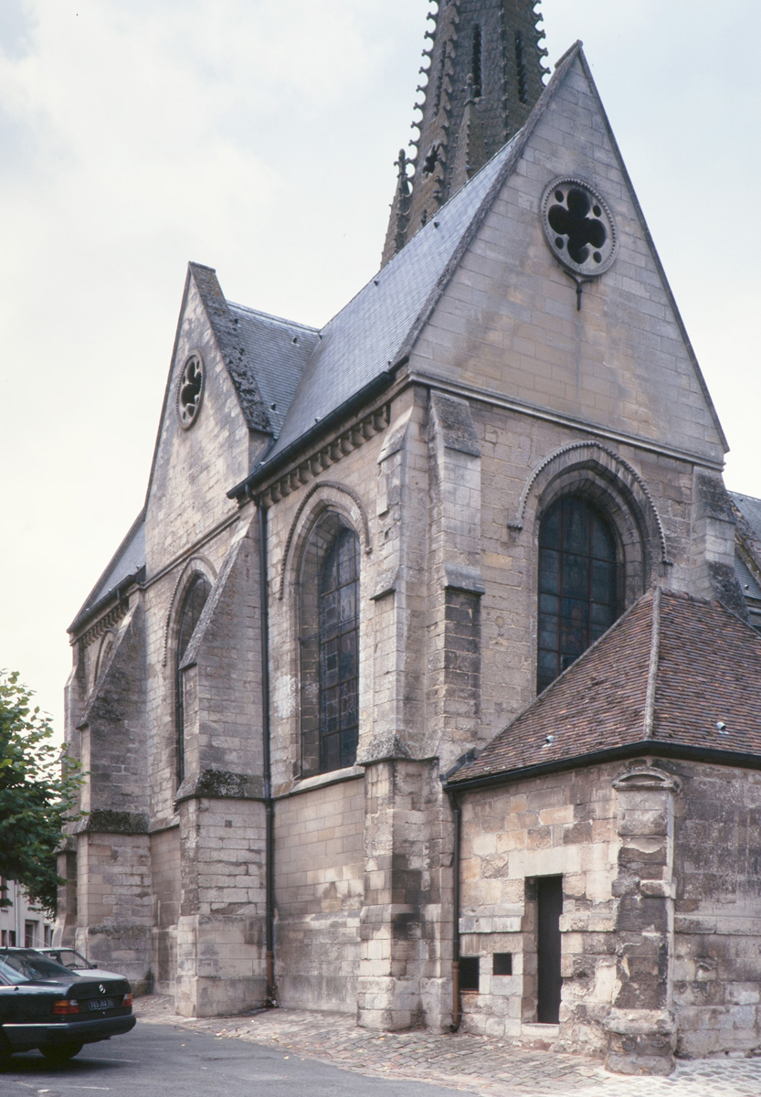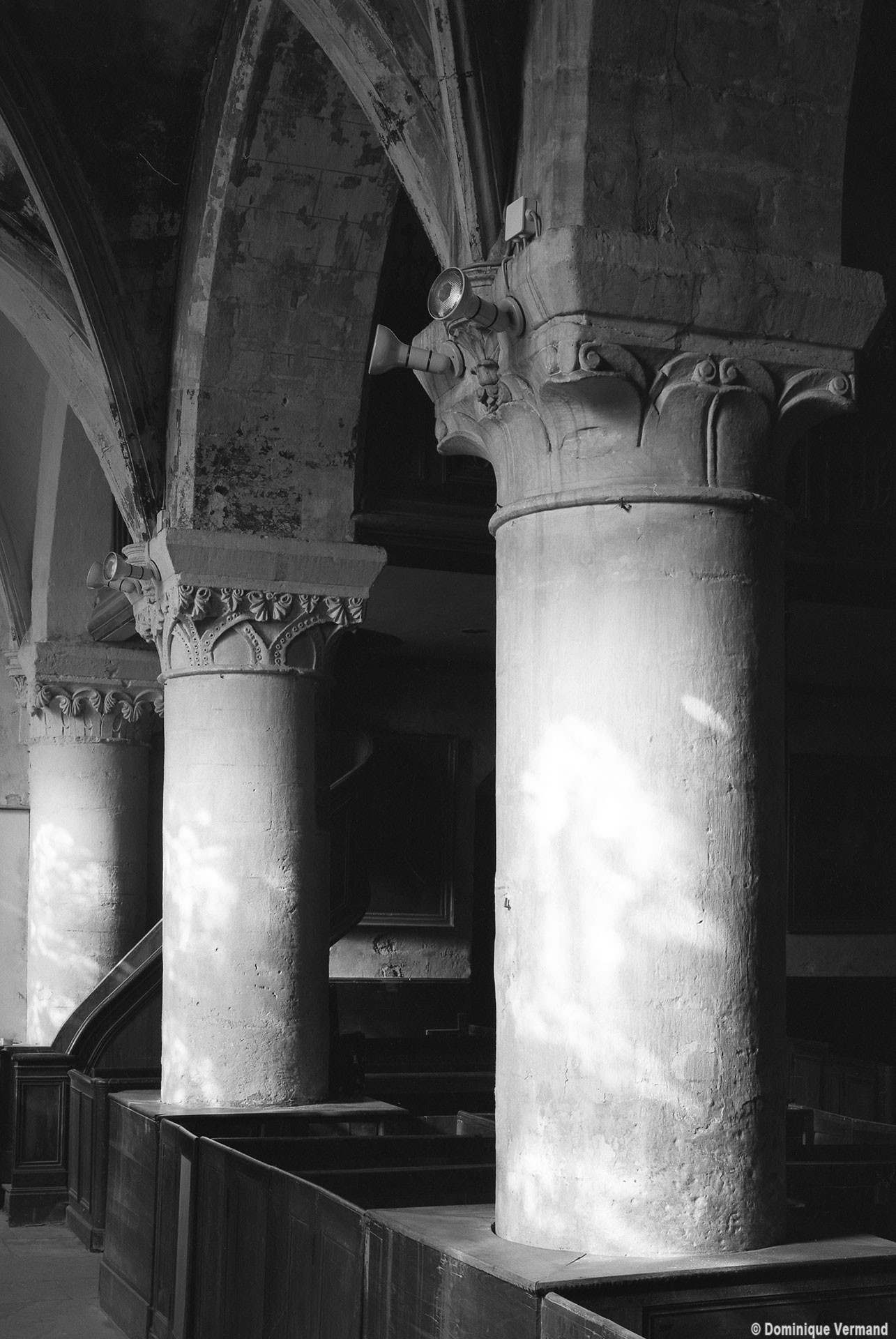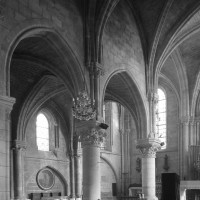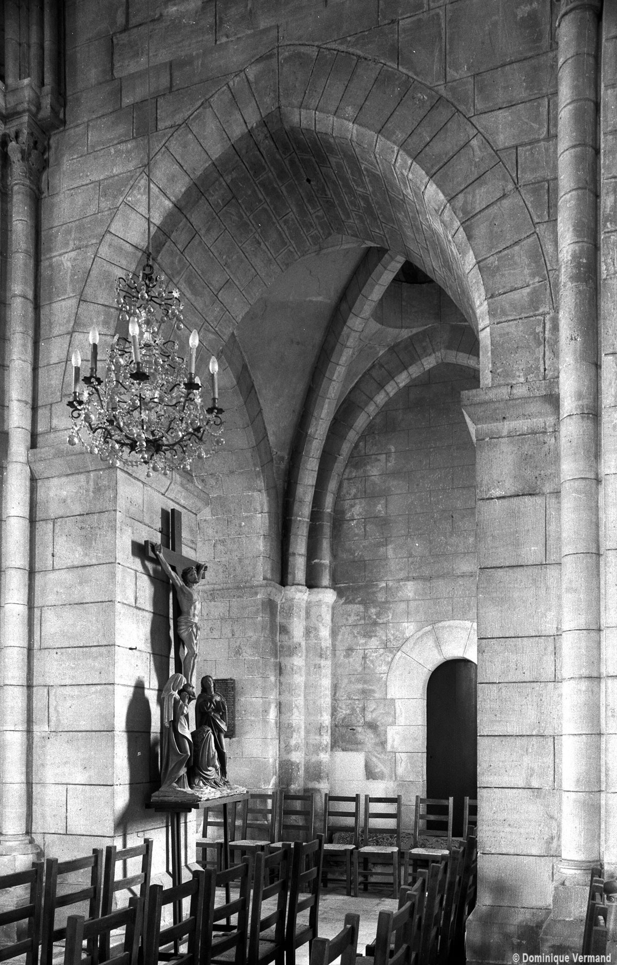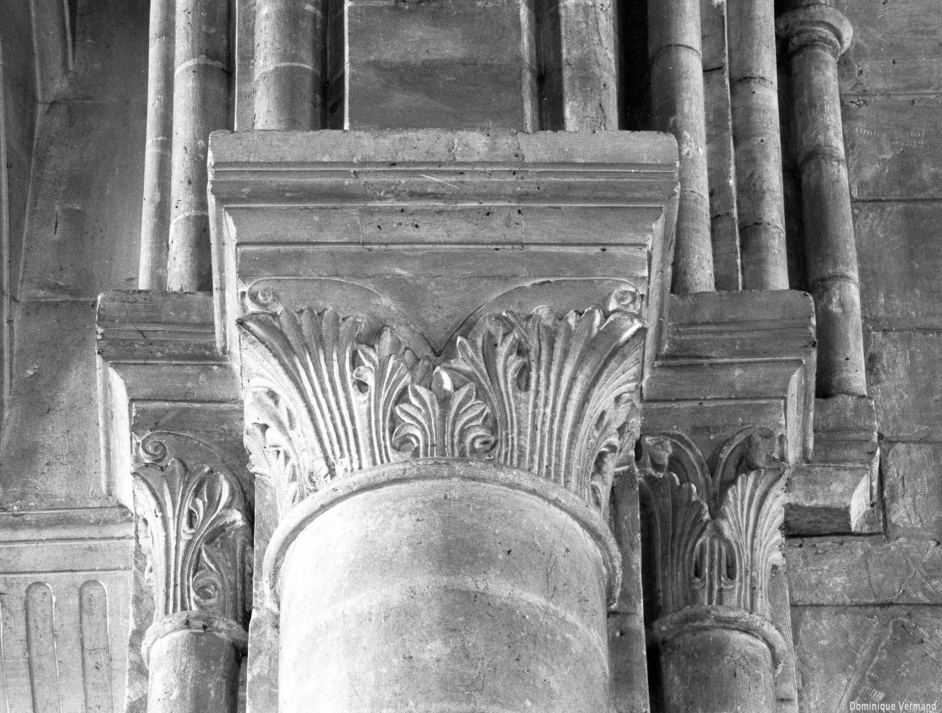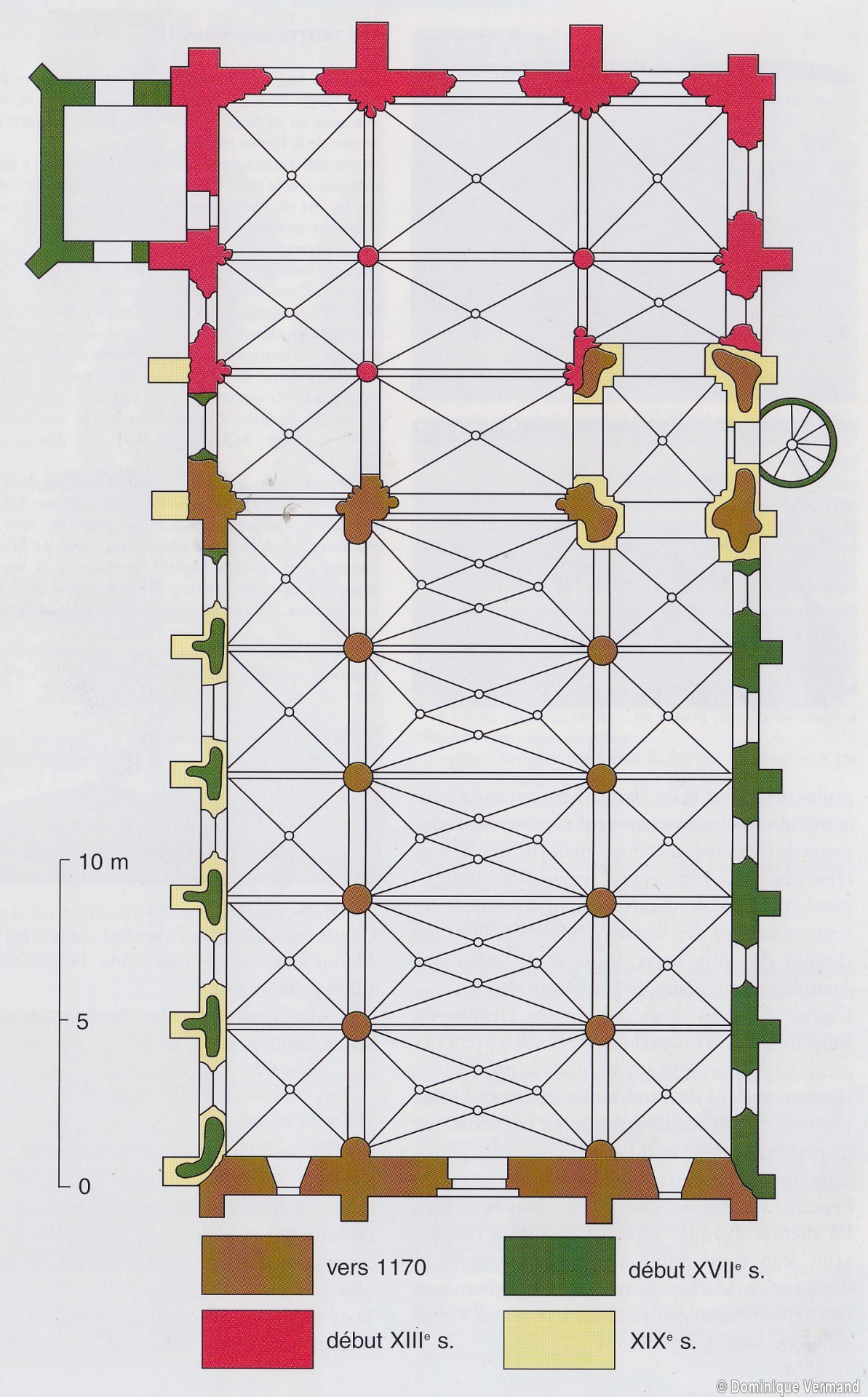 De l’église construite dans la seconde moitié du 12ème siècle restent la nef, la partie ouest du transept et le clocher. Couverte de voûtes d’ogives avec liernes et tiercerons au 17ème siècle, la nef ne comportait à l’origine q’une simple charpente. Ses cinq travées communiquent avec les bas-côtés par des arcades brisées retombant sur des piles circulaires, une véritable rareté dans la région à cette époque. Il faut y voir l’influence de la cathédrale de Senlis, également présente dans le décor des chapiteaux (feuilles d’acanthe, feuilles plates s’enroulant en boule, tiges perlées…) Aujourd’hui bouchées, les fenêtres s’ouvraient dans l’axe des piles et non des arcades. Fréquent dans la région, ce parti évitait de monter trop haut les murs gouttereaux, fortement sollicités par le poids de la charpente.