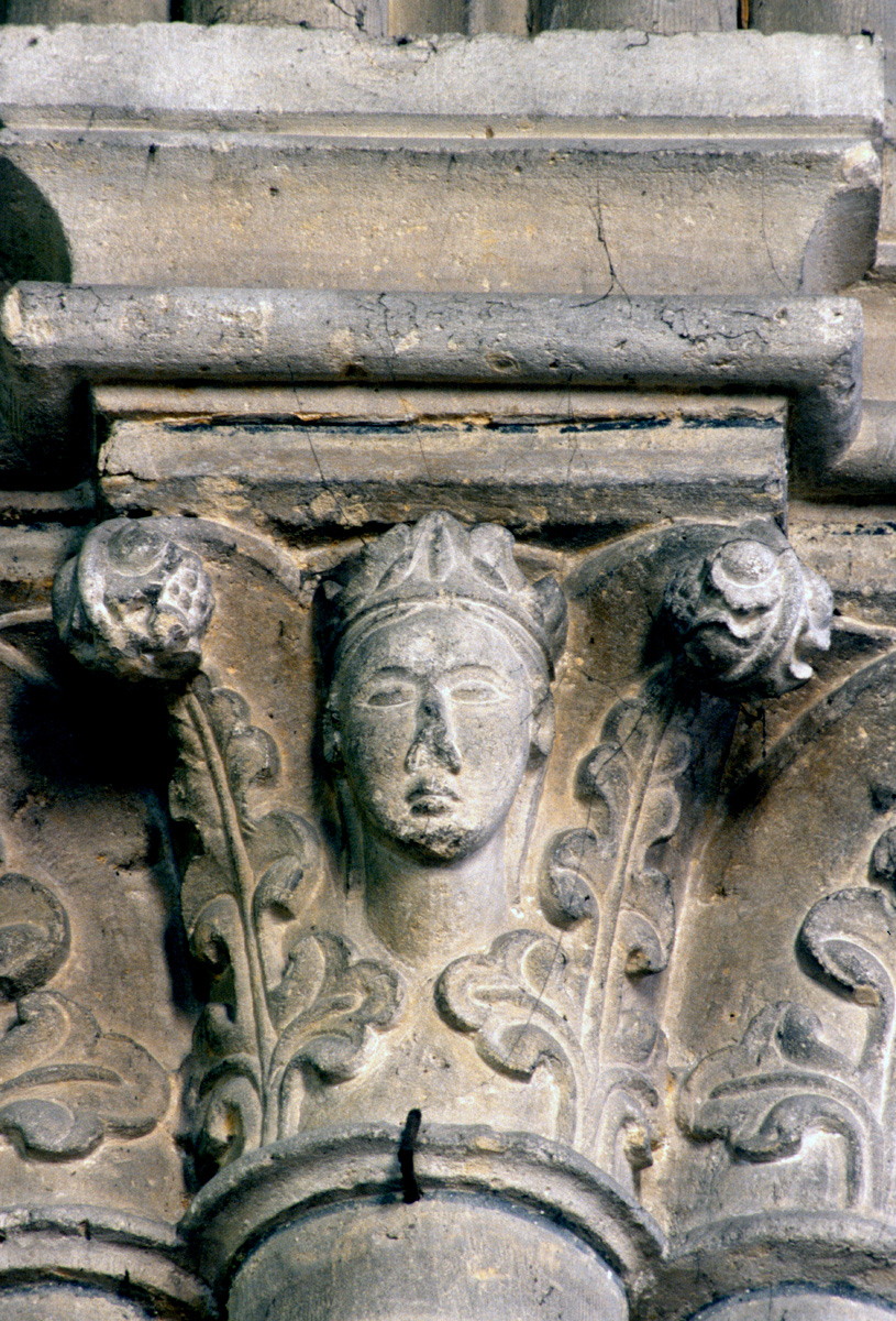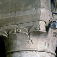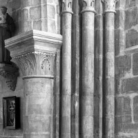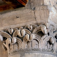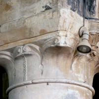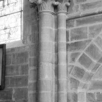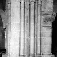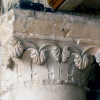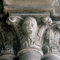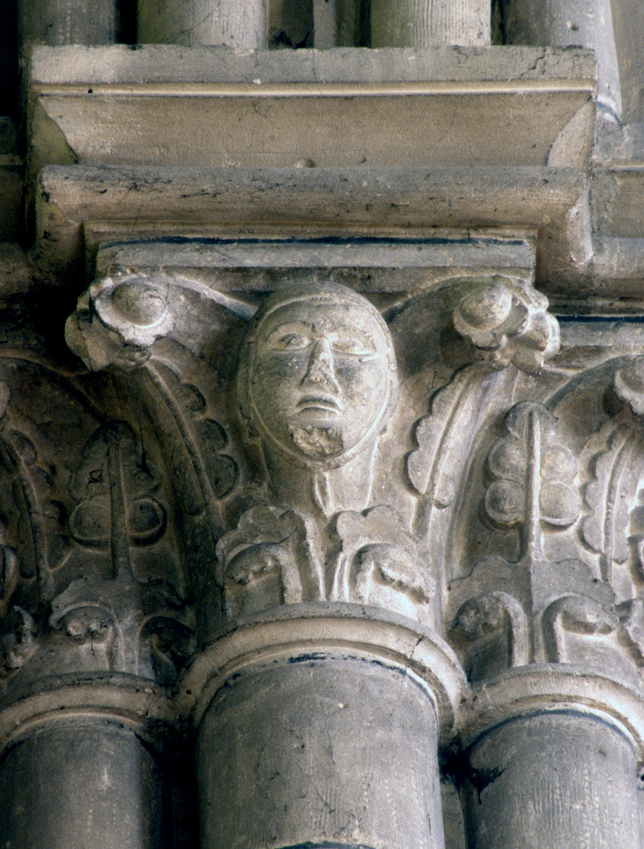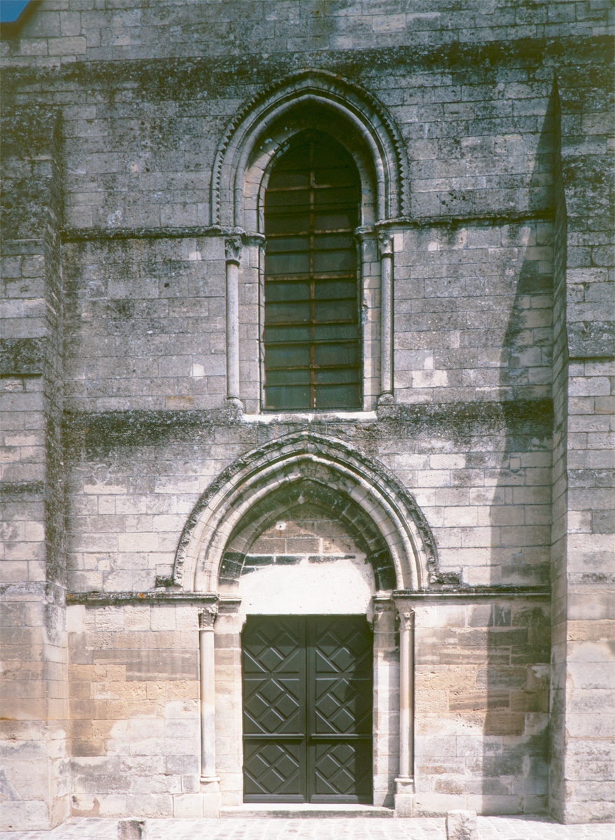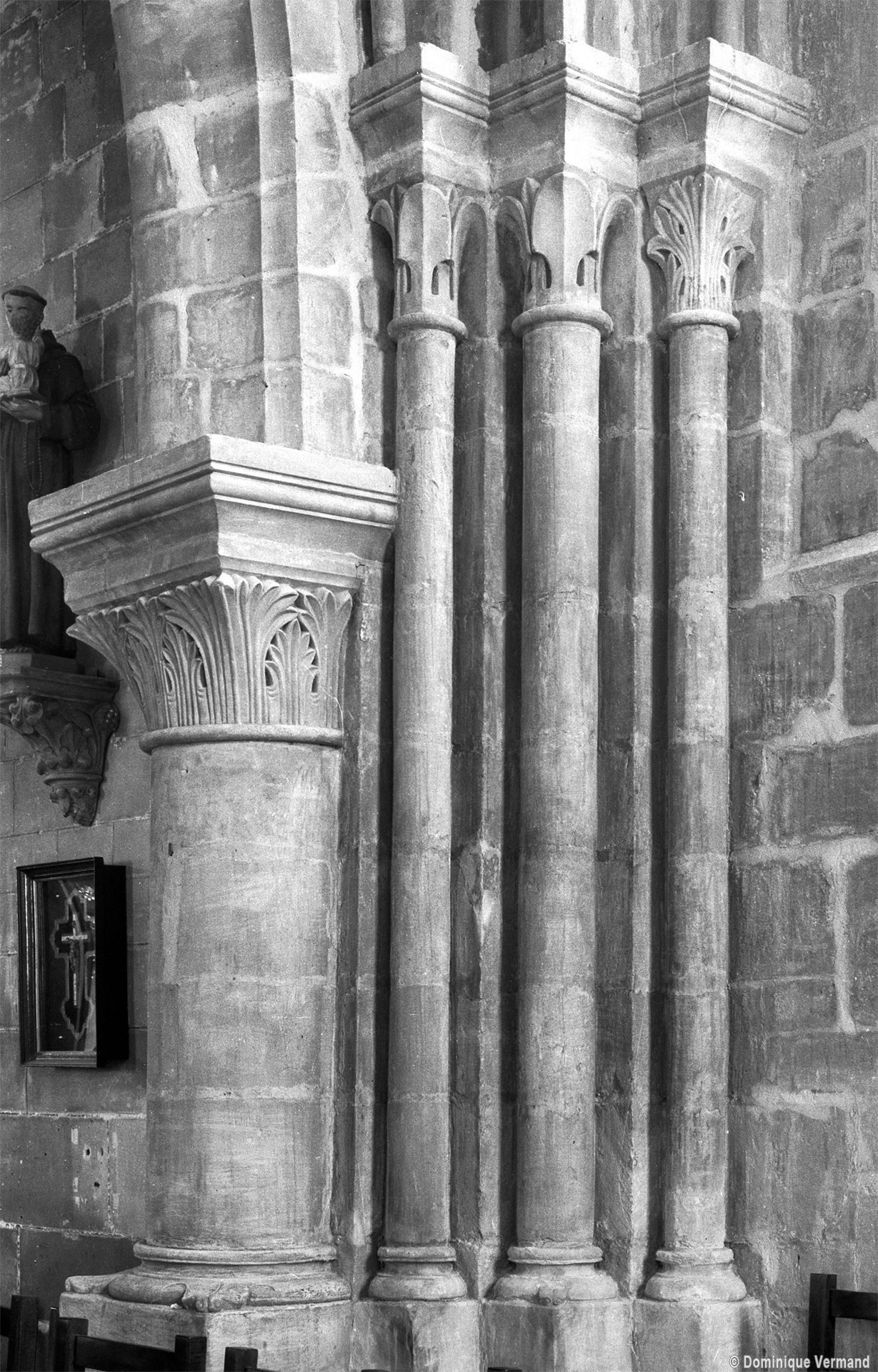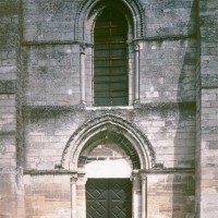 Bâti latéralement, le clocher est une tour assez austère dont le beffroi est percé de baies géminées en plein cintre sans décor. Sa base a été totalement reprise au 19ème siècle, comme la façade, bien composée mais authentique seulement dans sa partie centrale, qui superpose un portail et une grande fenêtre, tous deux garnis de colonnettes aux piédroits.