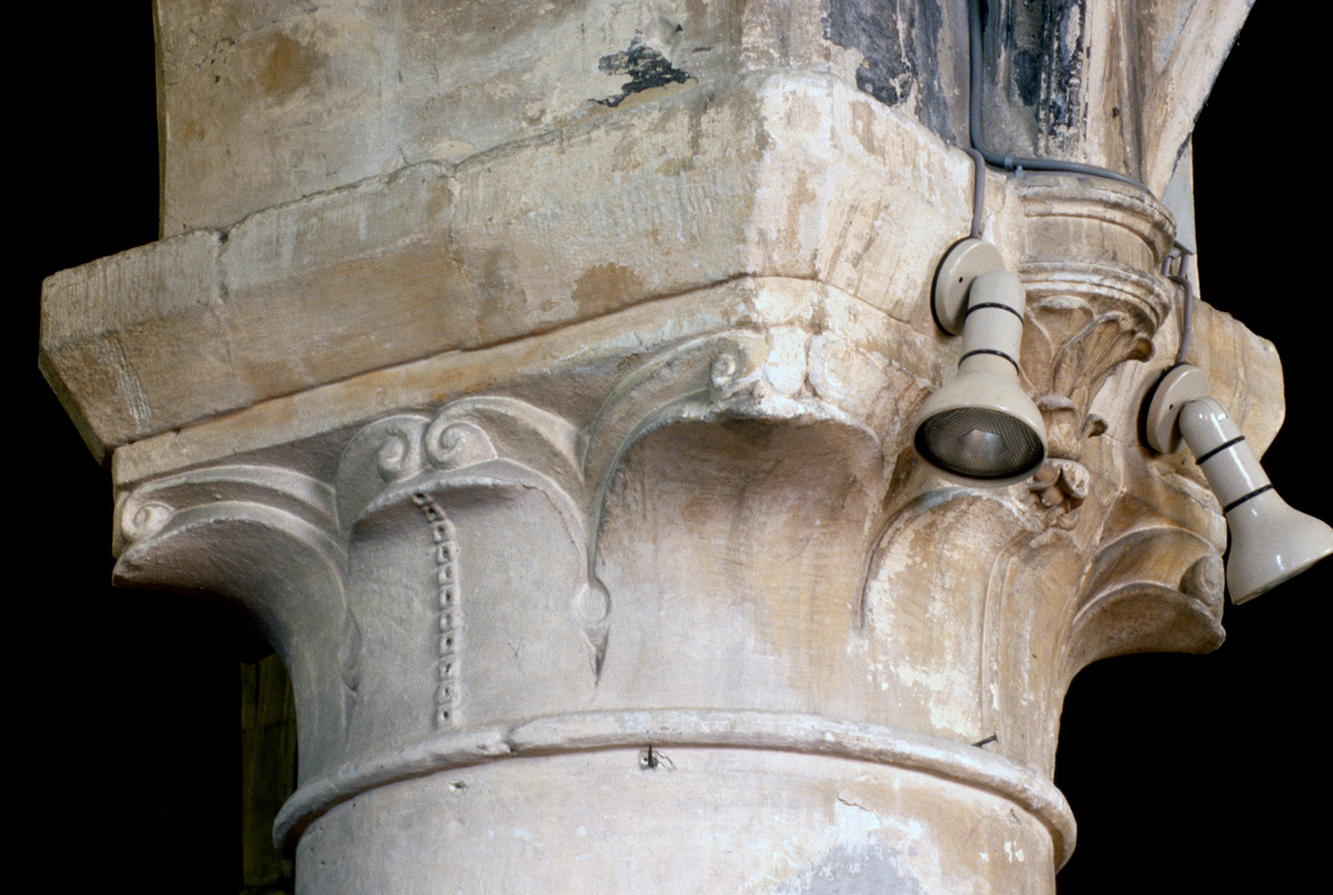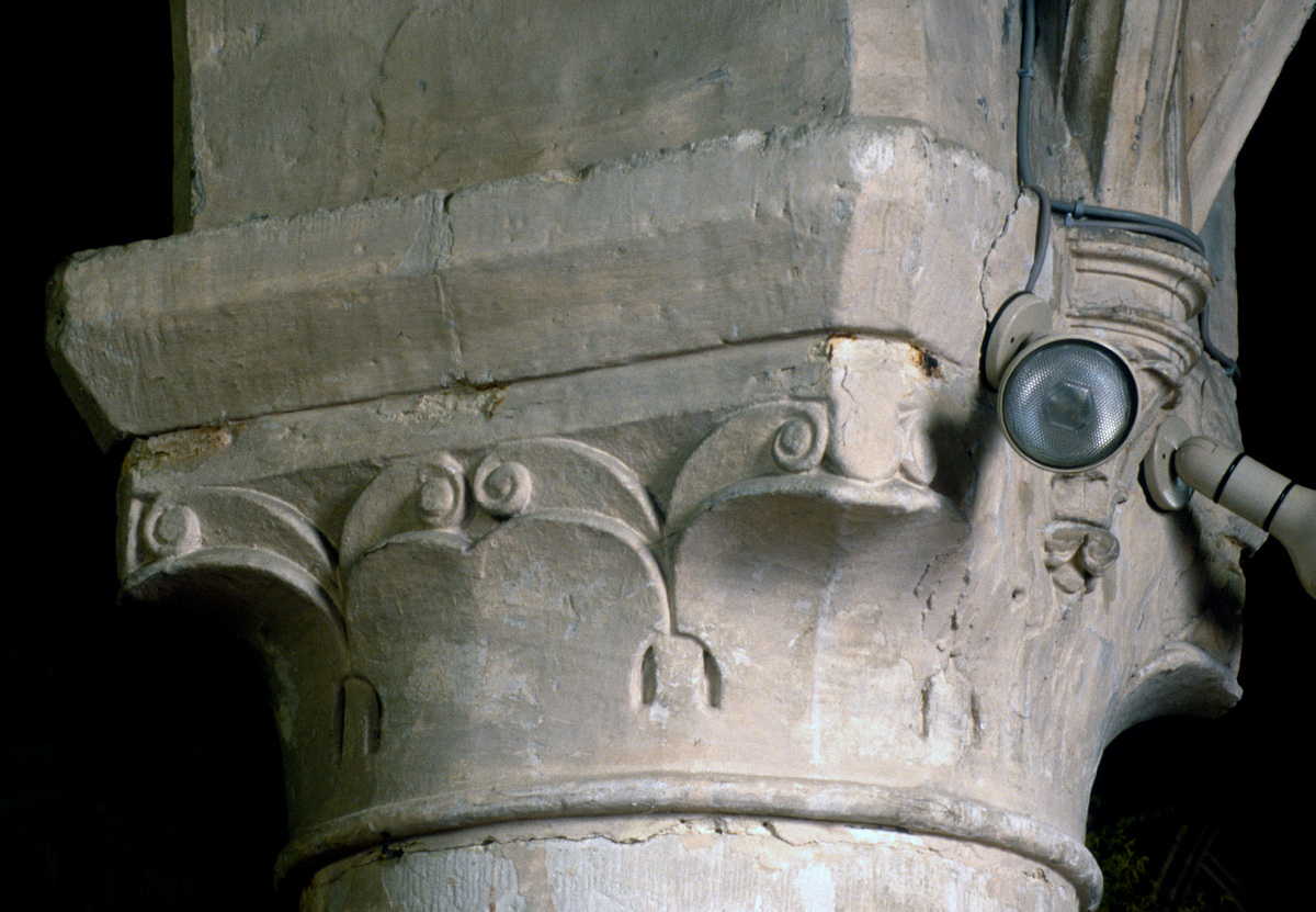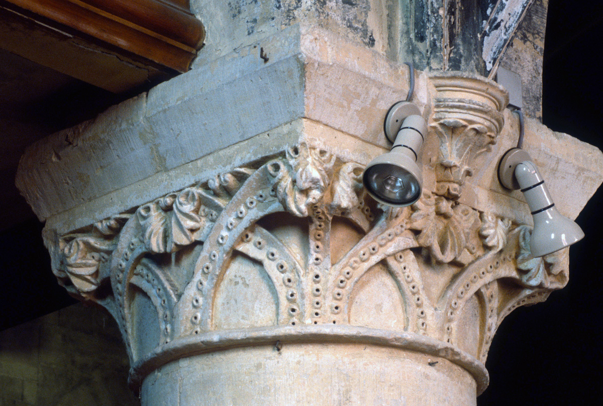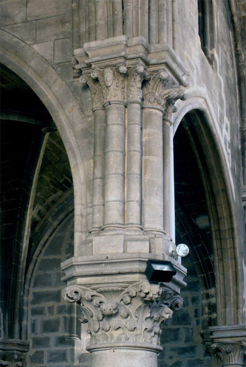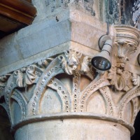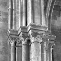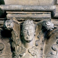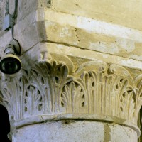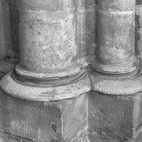 Bâti latéralement, le clocher est une tour assez austère dont le beffroi est percé de baies géminées en plein cintre sans décor. Sa base a été totalement reprise au 19ème siècle, comme la façade, bien composée mais authentique seulement dans sa partie centrale, qui superpose un portail et une grande fenêtre, tous deux garnis de colonnettes aux piédroits.
