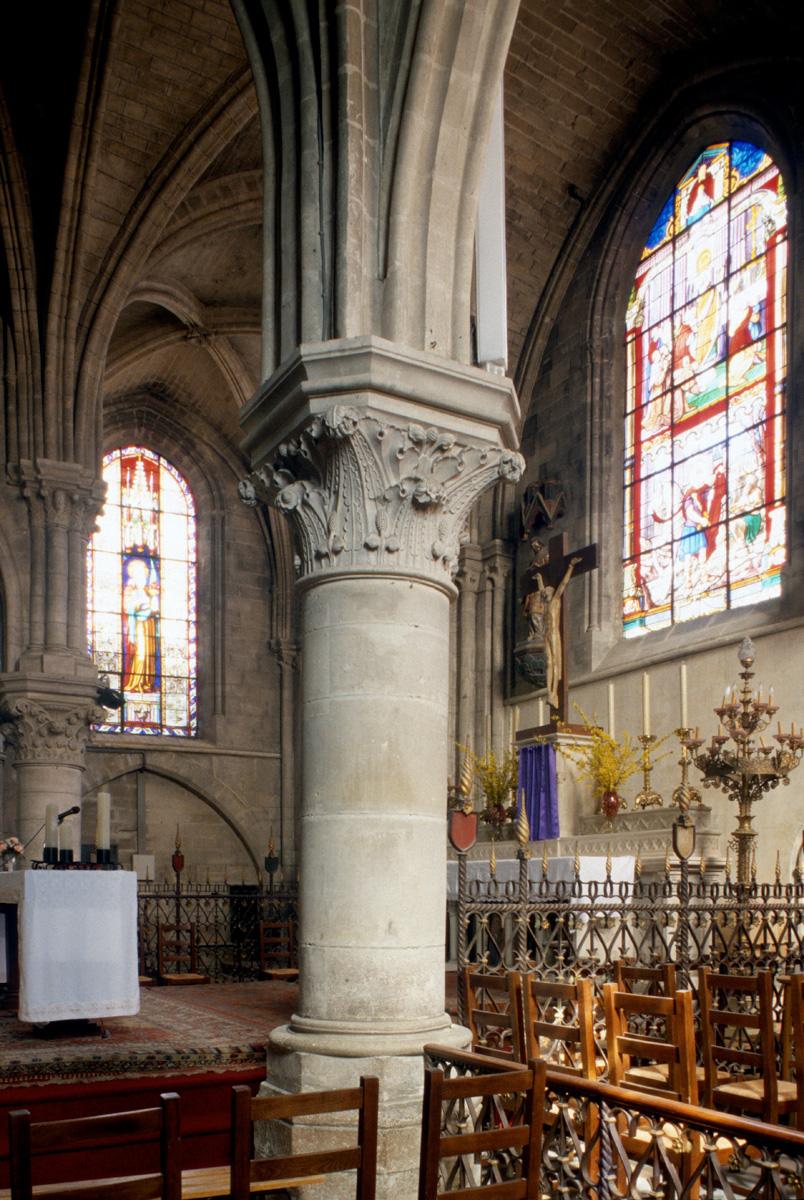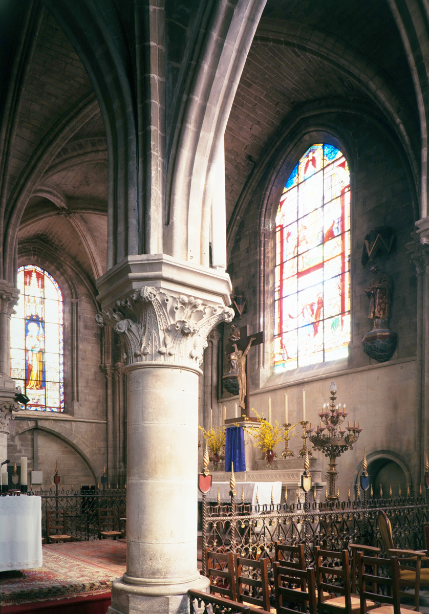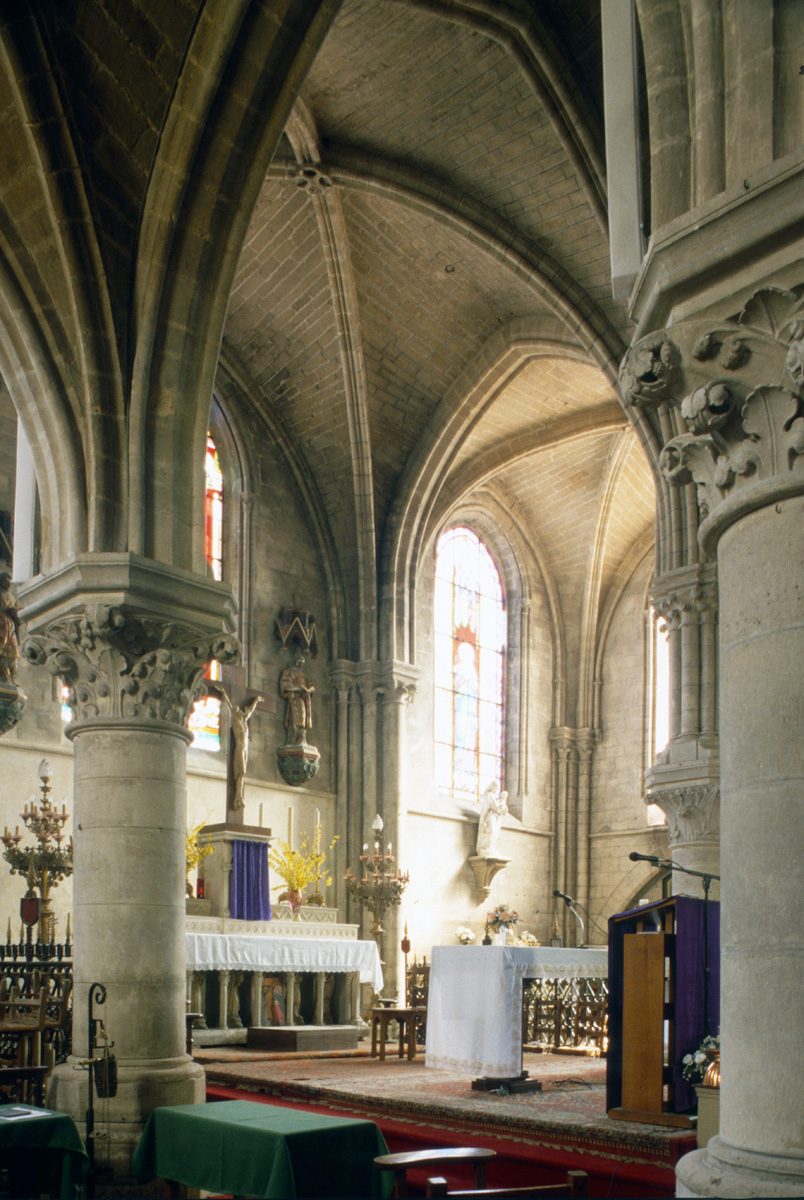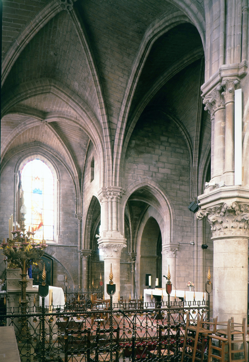 Terminé par un imposant chevet plat, le choeur est un authentique chef-d’oeuvre. L’accent est mis sur la seconde travée, dont les trois vaisseaux sont portés à la même hauteur, formant comme une nef transversale. Les voûtes retombent au centre sur trois piles circulaires par l’intermédiaire d’un faisceau de colonnettes, la quatrième retombée se confondant avec la base du clocher. Les trois chapiteaux associés aux piles sont d’une qualité exceptionnelle et leur sculpture comme la mise en oeuvre de l’ensemble des éléments associés au voûtement renvoient incontestablement à Notre-Dame de Paris, alors en cours d’achèvement.