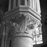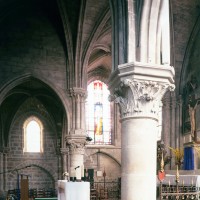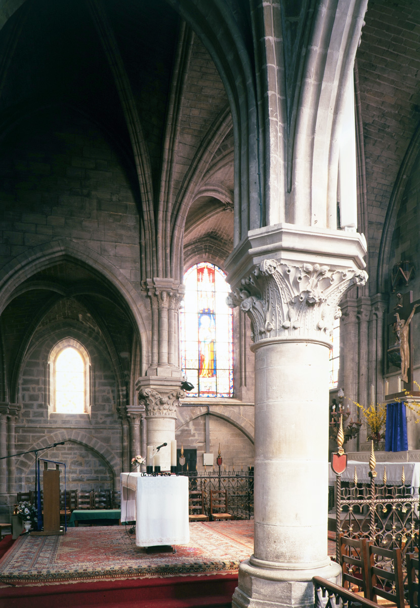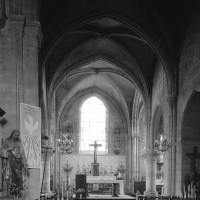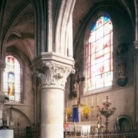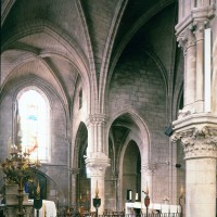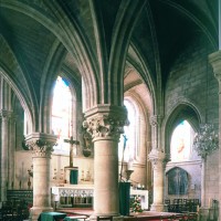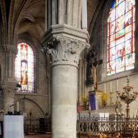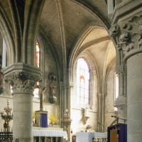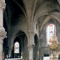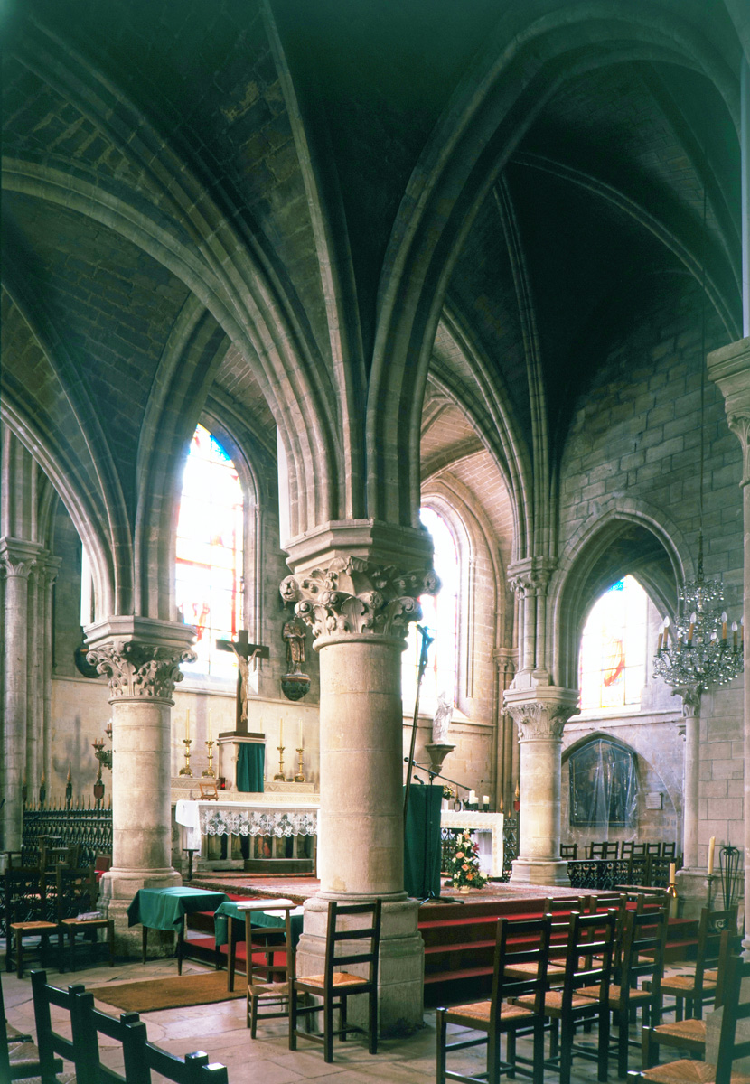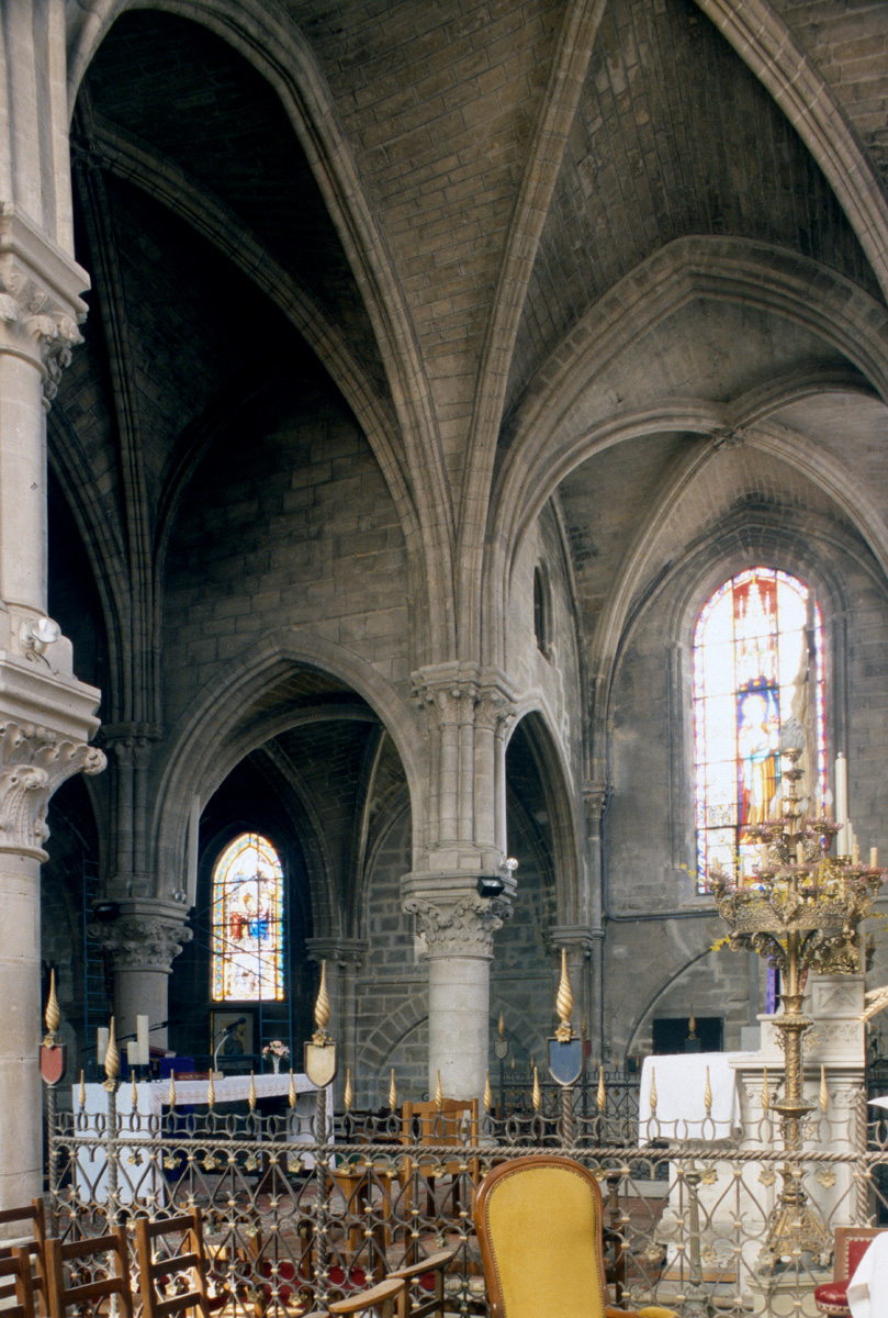 Terminé par un imposant chevet plat, le choeur est un authentique chef-d’oeuvre. L’accent est mis sur la seconde travée, dont les trois vaisseaux sont portés à la même hauteur, formant comme une nef transversale. Les voûtes retombent au centre sur trois piles circulaires par l’intermédiaire d’un faisceau de colonnettes, la quatrième retombée se confondant avec la base du clocher. Les trois chapiteaux associés aux piles sont d’une qualité exceptionnelle et leur sculpture comme la mise en oeuvre de l’ensemble des éléments associés au voûtement renvoient incontestablement à Notre-Dame de Paris, alors en cours d’achèvement.
