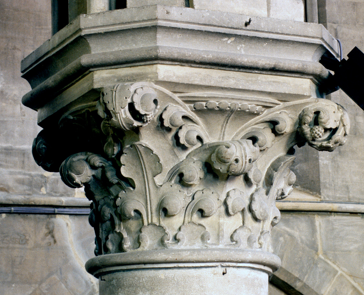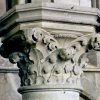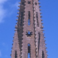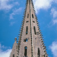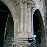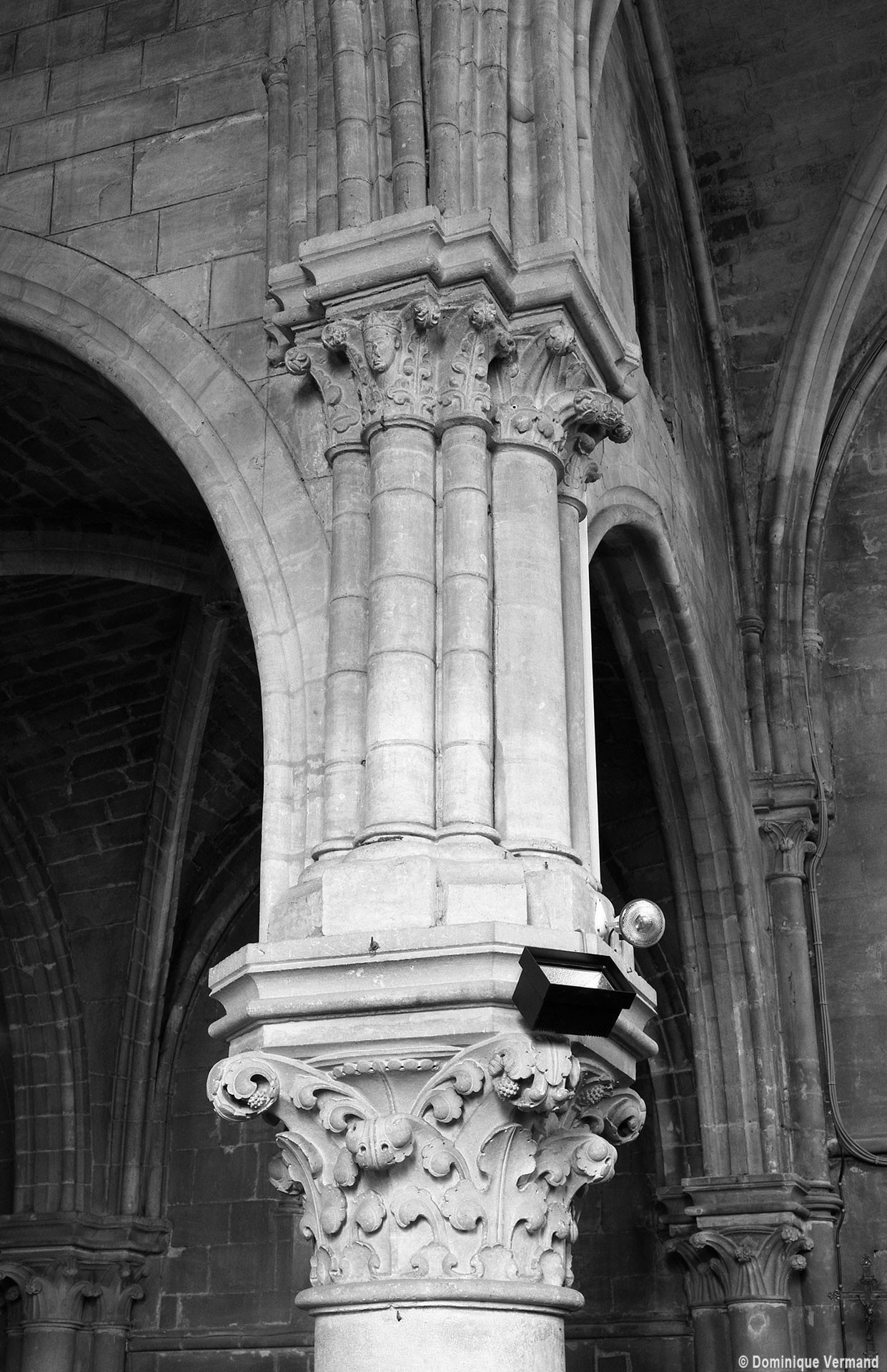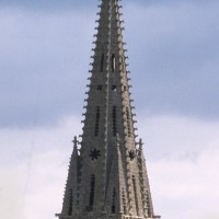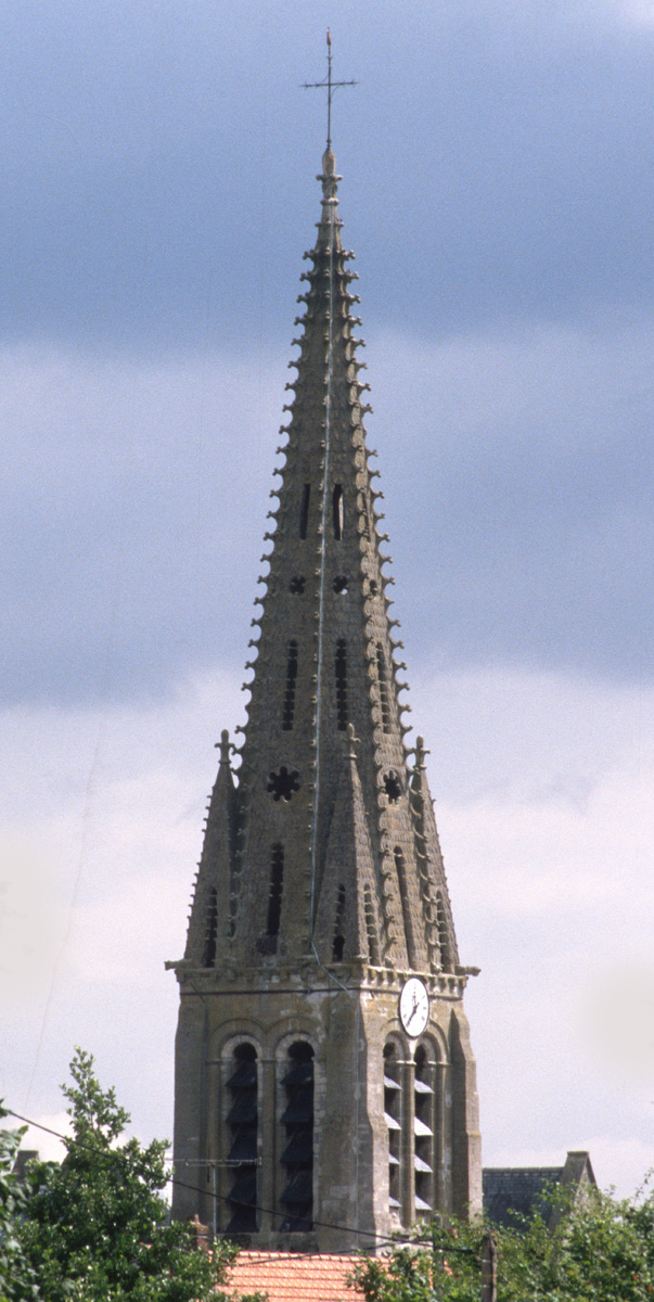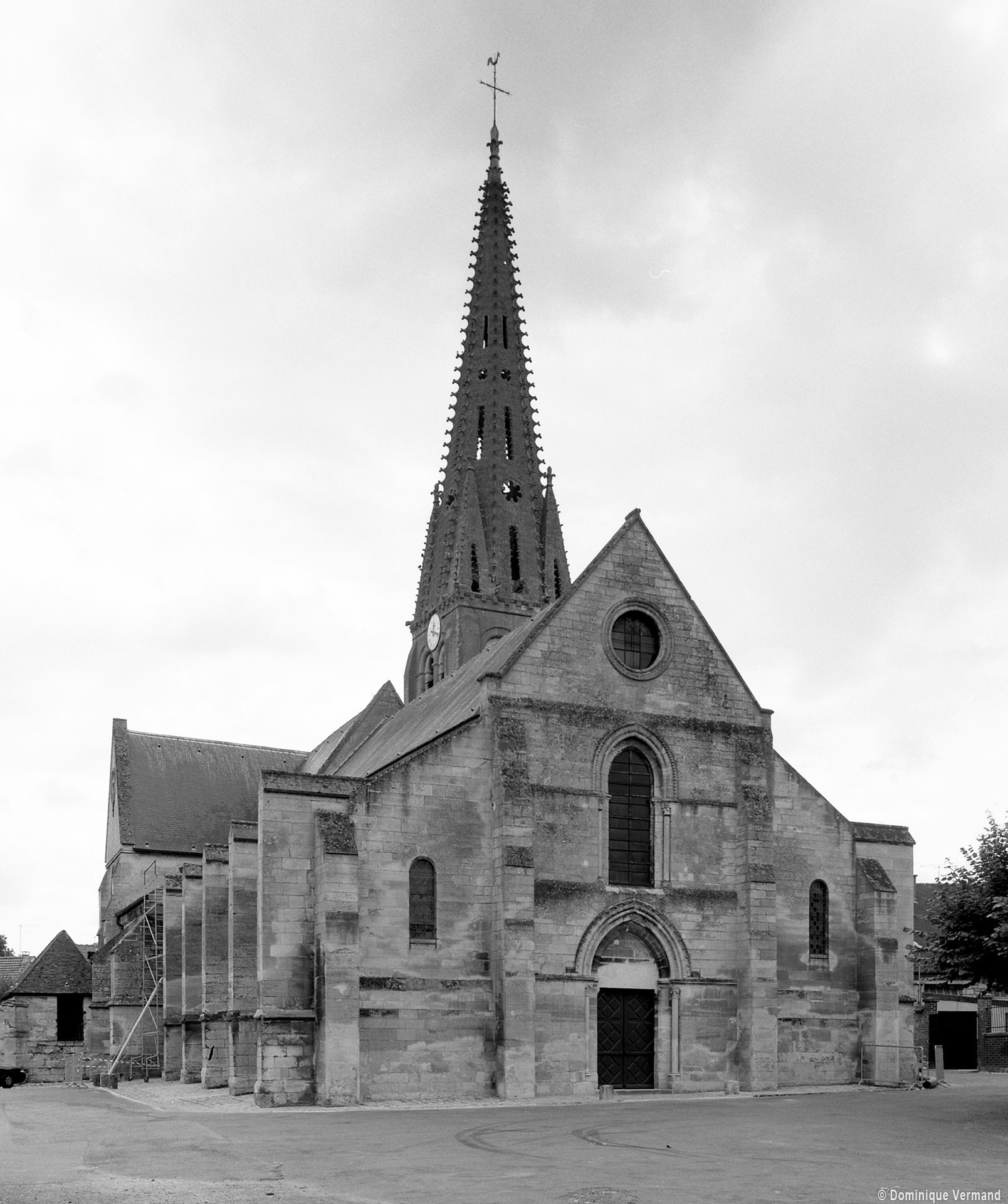 C’est au 16ème siècle enfin, si l’on excepte les importantes restaurations du 19ème, que sera montée la flèche, très élégante construction octogonale en pierre flanquée de pyramides d’angle. Les crochets garnissant les arêtes, les ouvertures rectangulaires ou polylobées ajourant les faces garnies d’écailles font si directement référence à ce chef d’oeuvre de l’architecture gothique qu’est la flèche de la cathédrale de Senlis que la datation a pu – l’auteur de la notice y compris – en situer la construction au 13ème siècle. Il est par ailleurs tentant de l’attribuer a l’atelier qui a bâti les flèches voisines de Versigny et d’Eve tant le vocabulaire stylistique leur est commun.