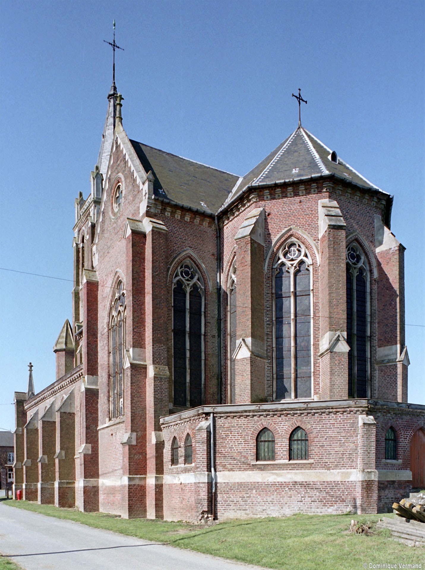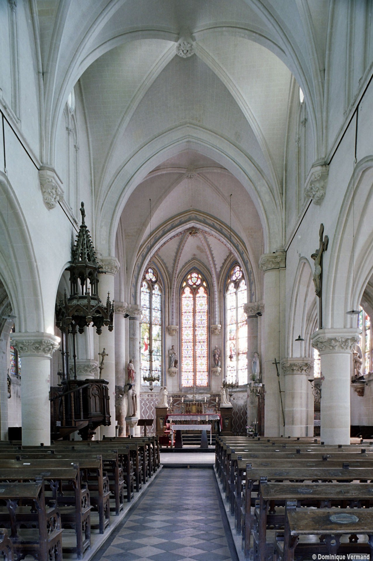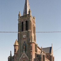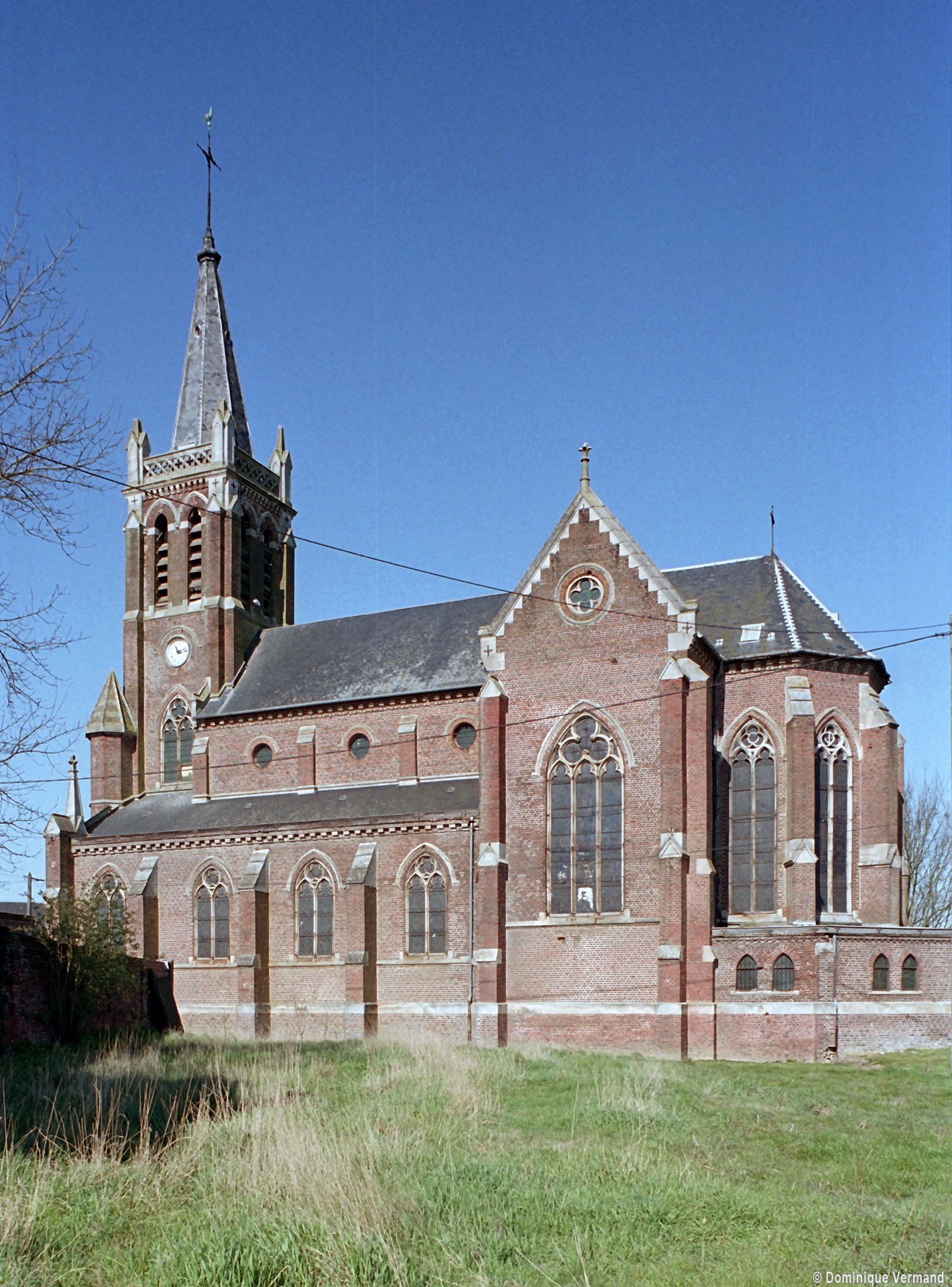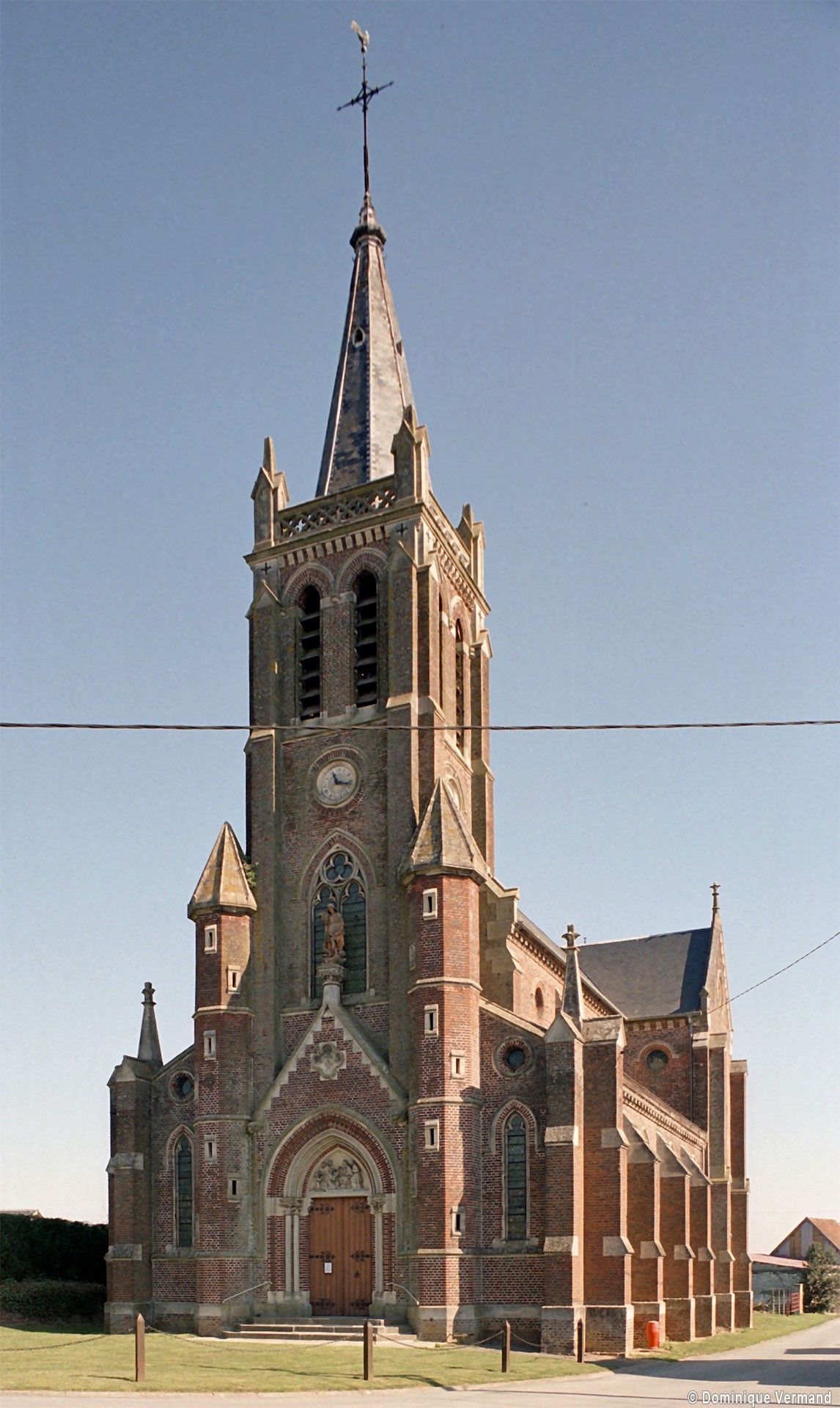 Réalisé par l’architecte Jean Herbault entre 1866 et 1870, l’édifice comprend une nef de quatre travées avec bas-côtés, un transept non saillant et un chœur à cinq pans, tous voûtés d’ogives. Un important clocher avec tribune est assis sur la première travée, à laquelle introduit un portail dont le tympan illustre symboliquement l’action de l’abbé Sterlin. La brique est largement utilisée comme il est presque toujours de règle à l’époque et le style des chapiteaux ainsi que le dessin des réseaux des fenêtres s’inspirent du gothique rayonnant (13ème siècle). La réalisation de l’ensemble est très soignée et le chœur, qui a conservé son décor peint, comme la chaire à prêcher, sont un bon exemple de l’idée que l’on se faisait alors du Moyen Age. Les deux grandes verrières du transept sont consacrées à saint Michel et celles du chœur à sainte Bernadette et à sainte Thérèse (2005).
