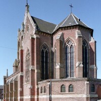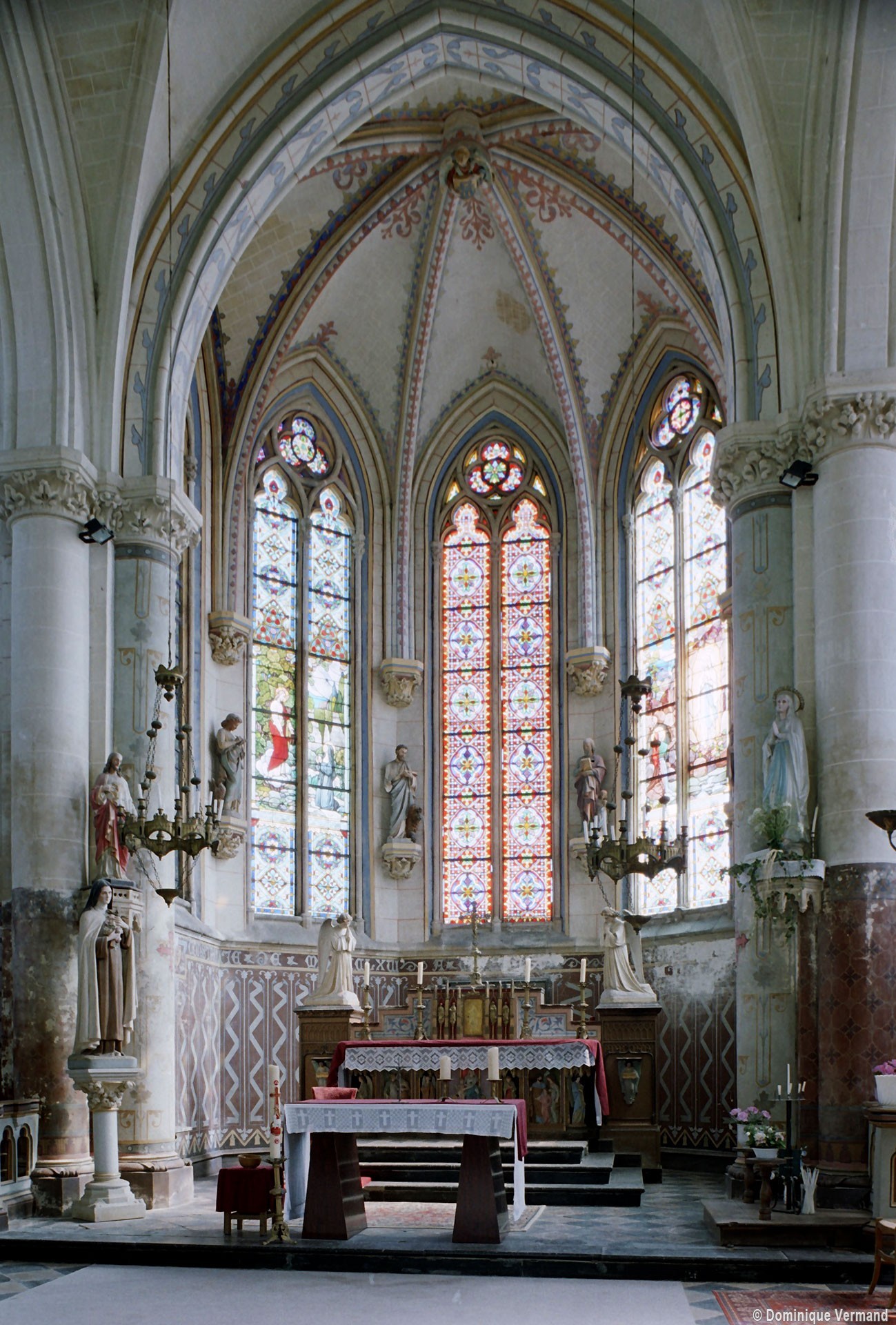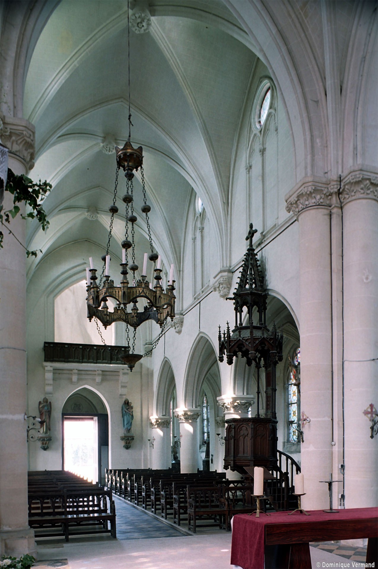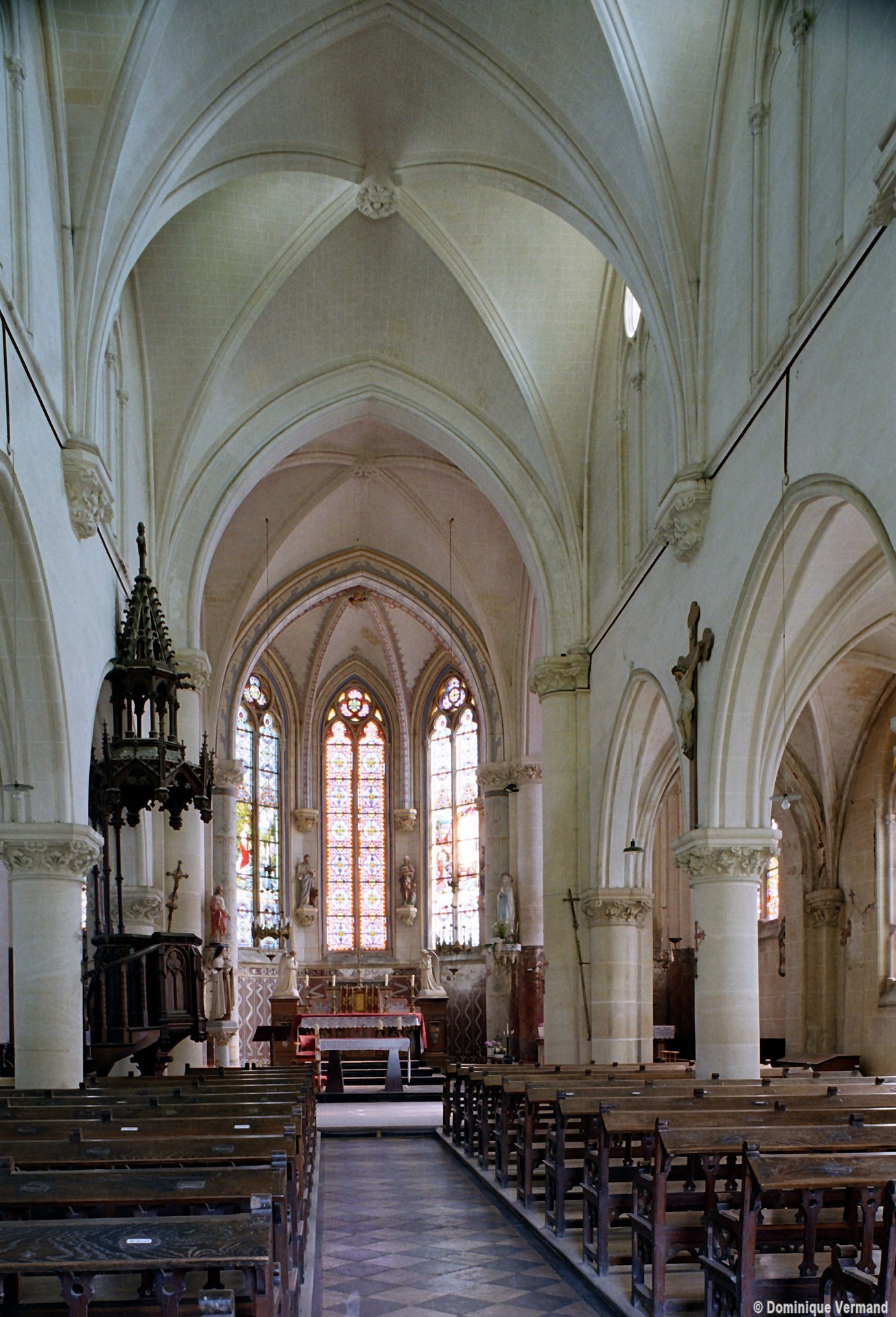 Réalisé par l’architecte Jean Herbault entre 1866 et 1870, l’édifice comprend une nef de quatre travées avec bas-côtés, un transept non saillant et un chœur à cinq pans, tous voûtés d’ogives. Un important clocher avec tribune est assis sur la première travée, à laquelle introduit un portail dont le tympan illustre symboliquement l’action de l’abbé Sterlin. La brique est largement utilisée comme il est presque toujours de règle à l’époque et le style des chapiteaux ainsi que le dessin des réseaux des fenêtres s’inspirent du gothique rayonnant (13ème siècle). La réalisation de l’ensemble est très soignée et le chœur, qui a conservé son décor peint, comme la chaire à prêcher, sont un bon exemple de l’idée que l’on se faisait alors du Moyen Age. Les deux grandes verrières du transept sont consacrées à saint Michel et celles du chœur à sainte Bernadette et à sainte Thérèse (2005).