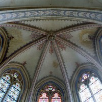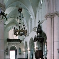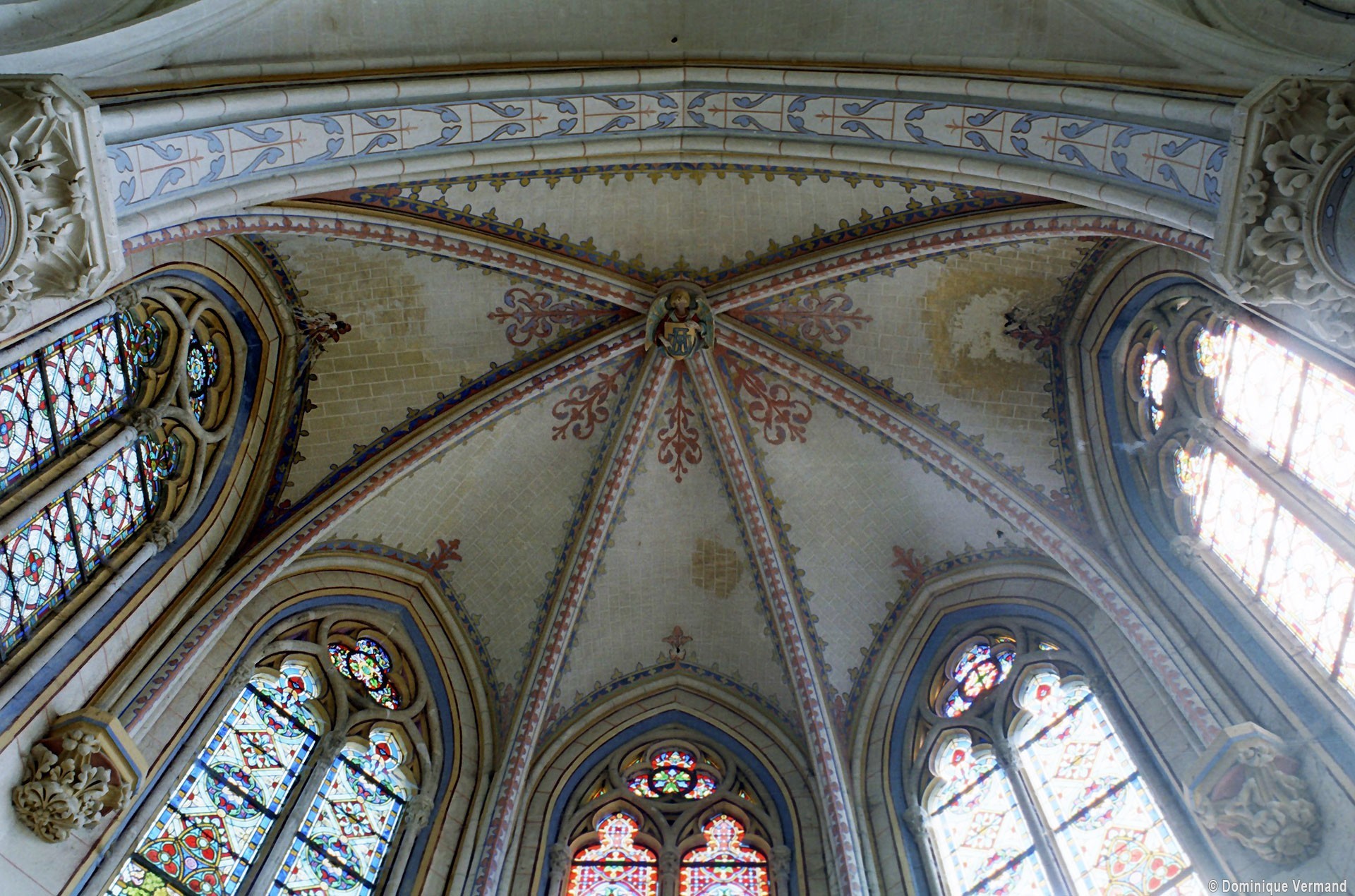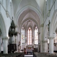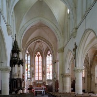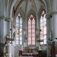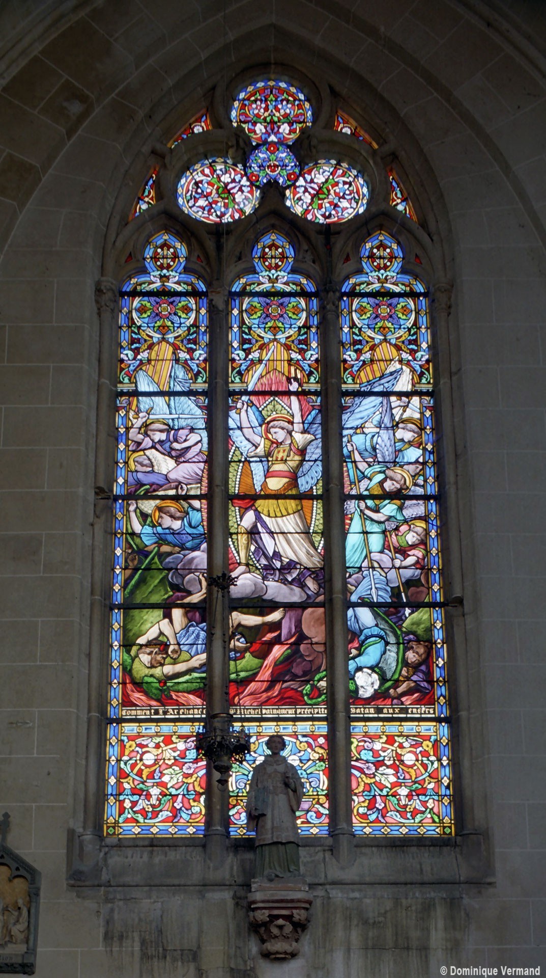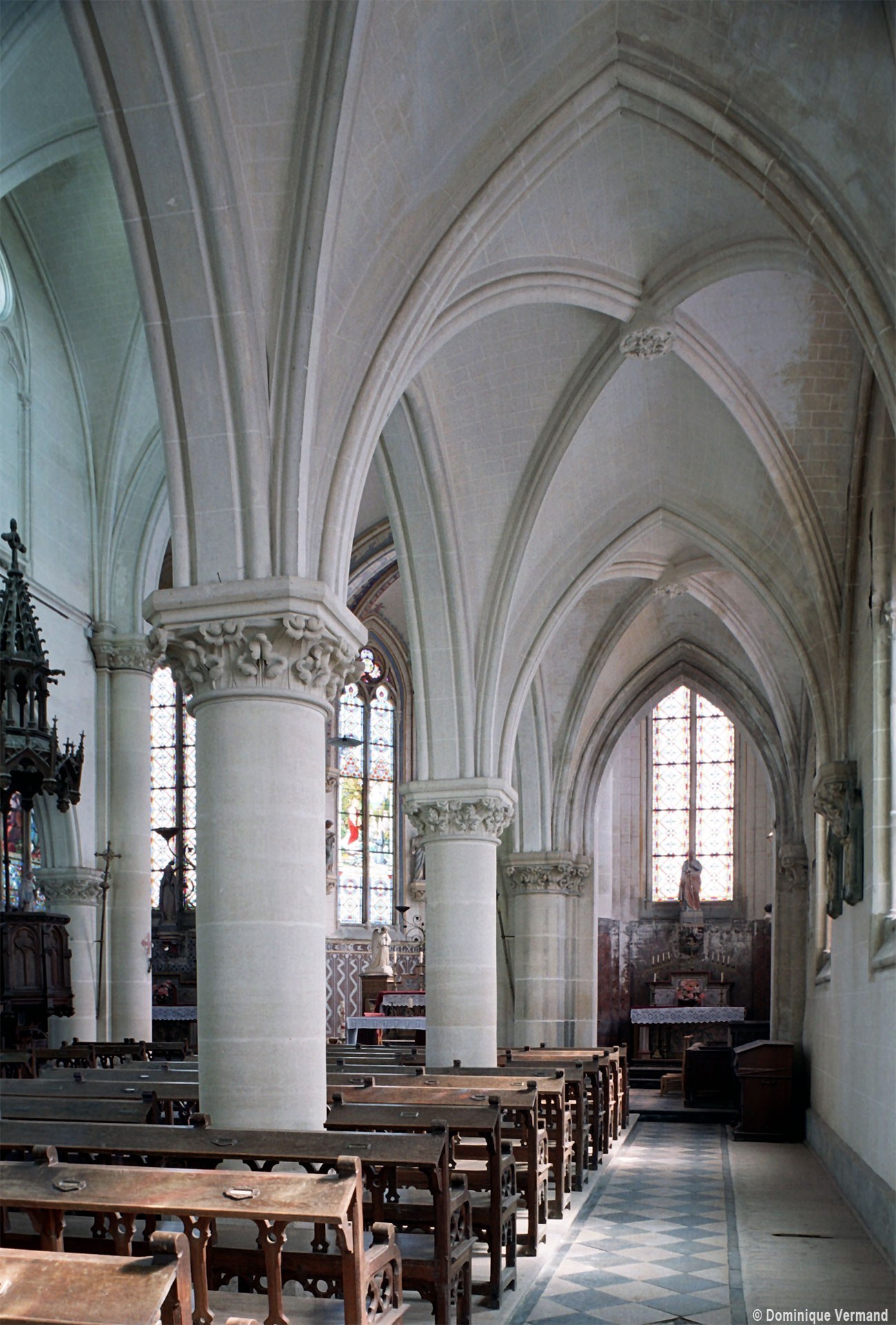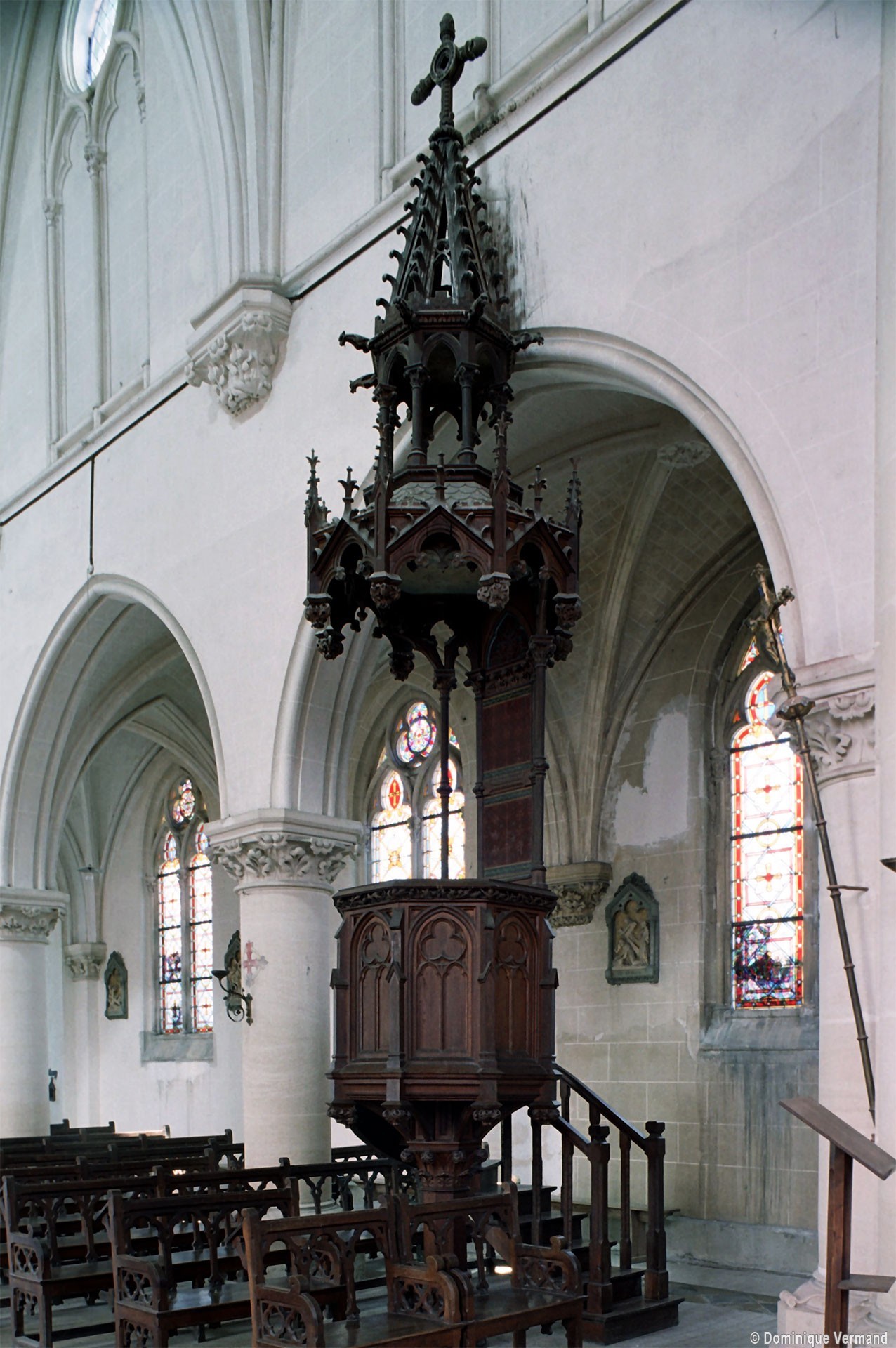 Réalisé par l’architecte Jean Herbault entre 1866 et 1870, l’édifice comprend une nef de quatre travées avec bas-côtés, un transept non saillant et un chœur à cinq pans, tous voûtés d’ogives. Un important clocher avec tribune est assis sur la première travée, à laquelle introduit un portail dont le tympan illustre symboliquement l’action de l’abbé Sterlin. La brique est largement utilisée comme il est presque toujours de règle à l’époque et le style des chapiteaux ainsi que le dessin des réseaux des fenêtres s’inspirent du gothique rayonnant (13ème siècle). La réalisation de l’ensemble est très soignée et le chœur, qui a conservé son décor peint, comme la chaire à prêcher, sont un bon exemple de l’idée que l’on se faisait alors du Moyen Age. Les deux grandes verrières du transept sont consacrées à saint Michel et celles du chœur à sainte Bernadette et à sainte Thérèse (2005).