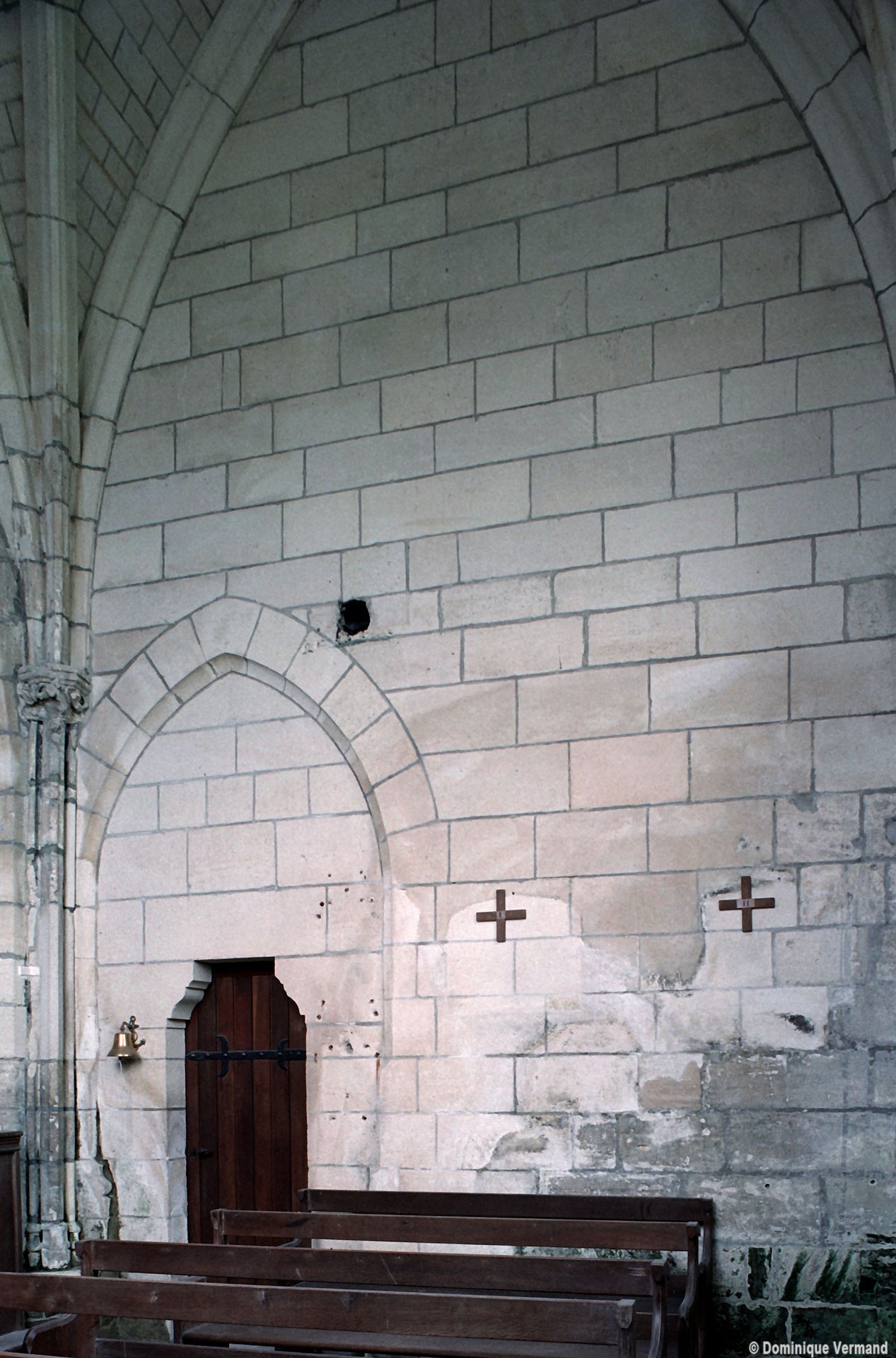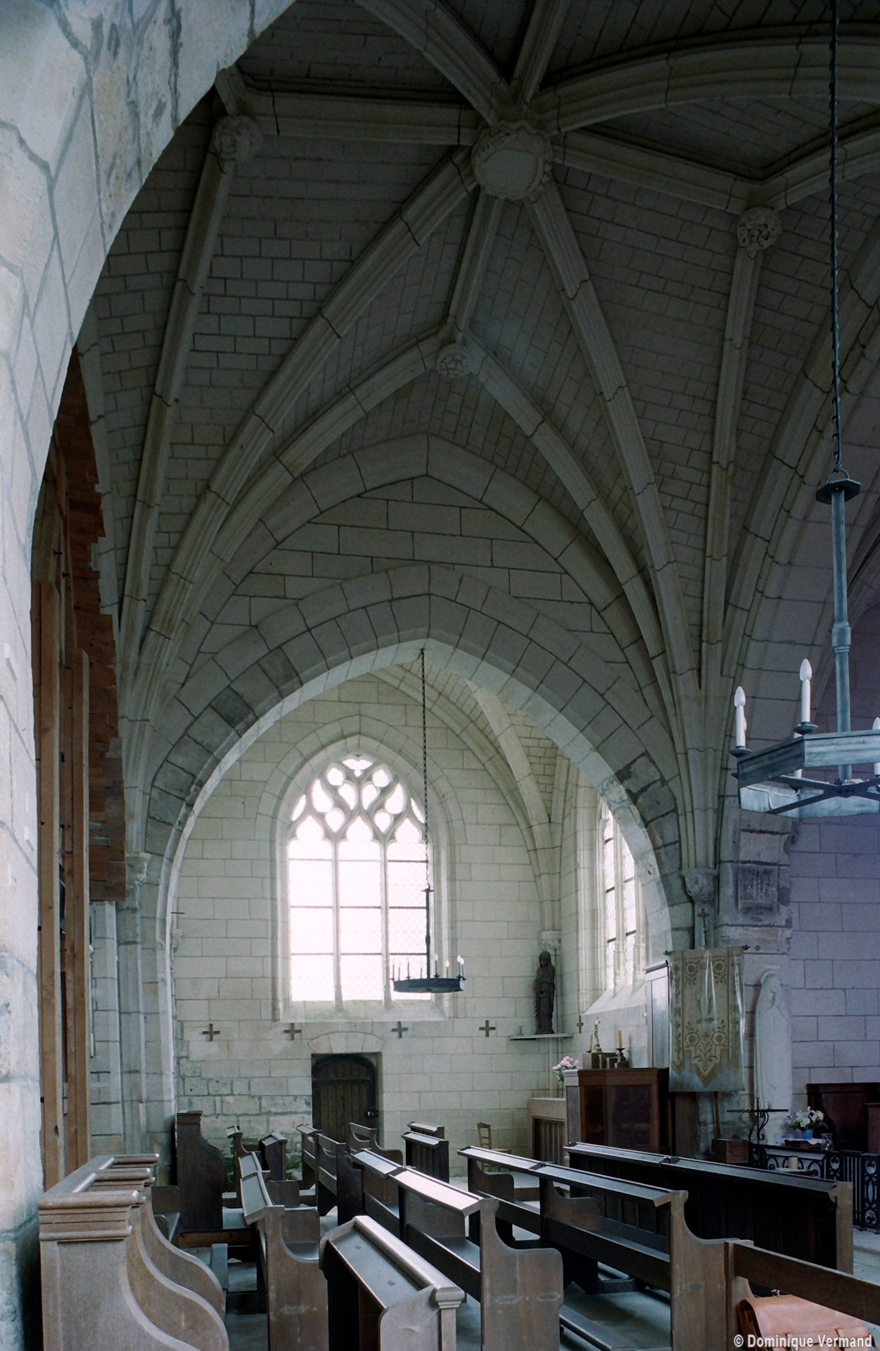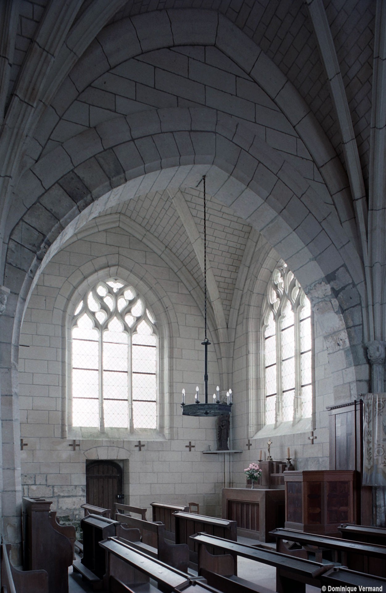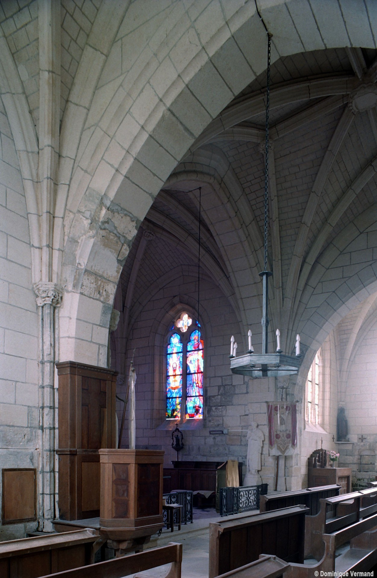 Lorsqu’elle était complète, l’église était constituée d’une nef de quatre travées avec bas-côtés, d’un transept saillant et d’un choeur pentagonal. Les arcades de la nef – qui était aveugle – étaient reçues sur des piles circulaires et l’ensemble était voûté d’ogives. Dans les croisillons, les ogives et formerets des voûtes sont reçus sur des faisceaux de trois colonnettes à profil prismatique par l’intermédiaire d’un unique chapiteau formant une petite frise sculptée. Les voûtes de la croisée et du choeur se compliquent de liernes et de tiercerons, avec clefs sculptées, et forment un ensemble du plus bel effet.