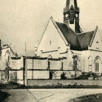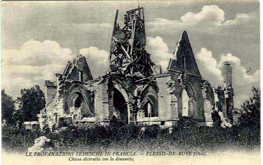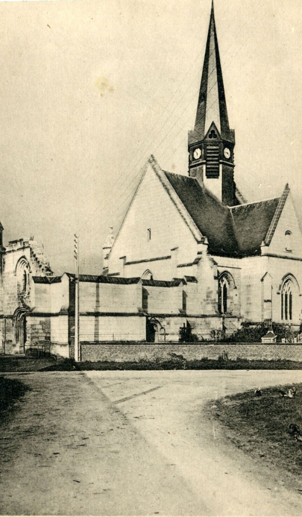 Détruite presque totalement durant la Guerre 14-18, Saint-Jean-Baptiste a été refaite à l’identique en 1930-32 par l’architecte A.Collin. Opérant avec beaucoup de soin, celui-ci a conservé tout ce qui pouvait l’être mais a volontairement laissé la nef inachevée afin de lui donner l’aspect d’un petit cloître, rappel symbolique et toujours vivant des terribles pertes subies par le patrimoine du Noyonnais durant la Grande Guerre.