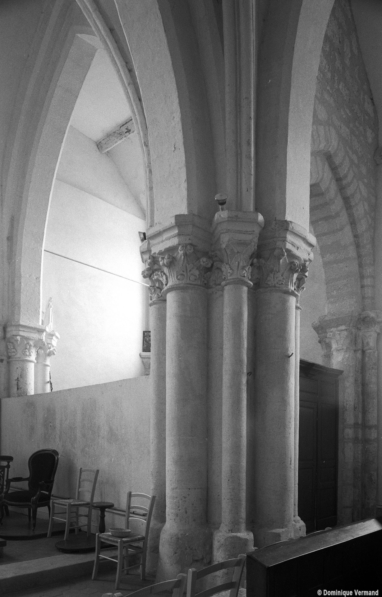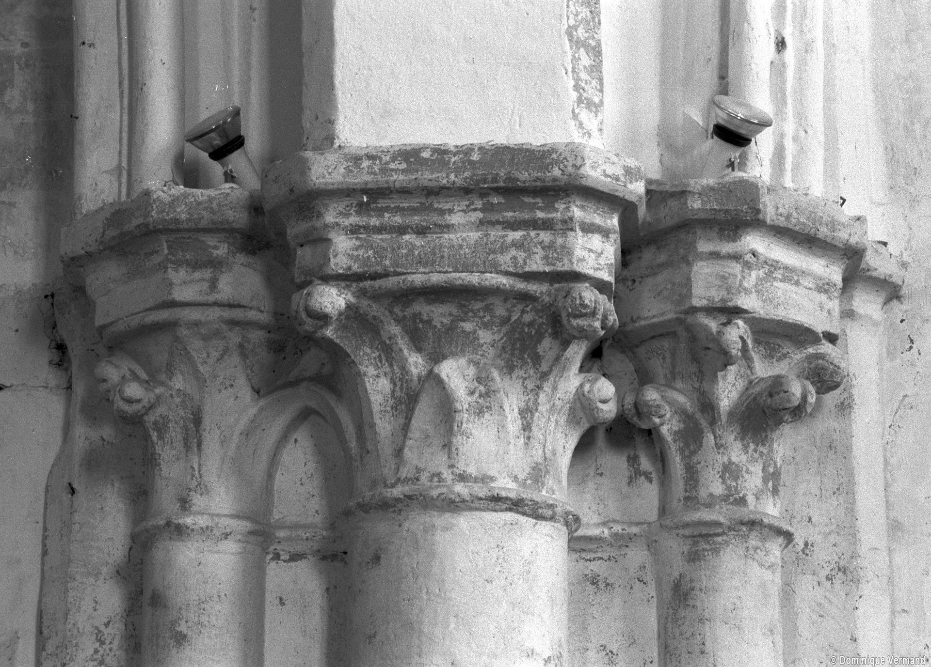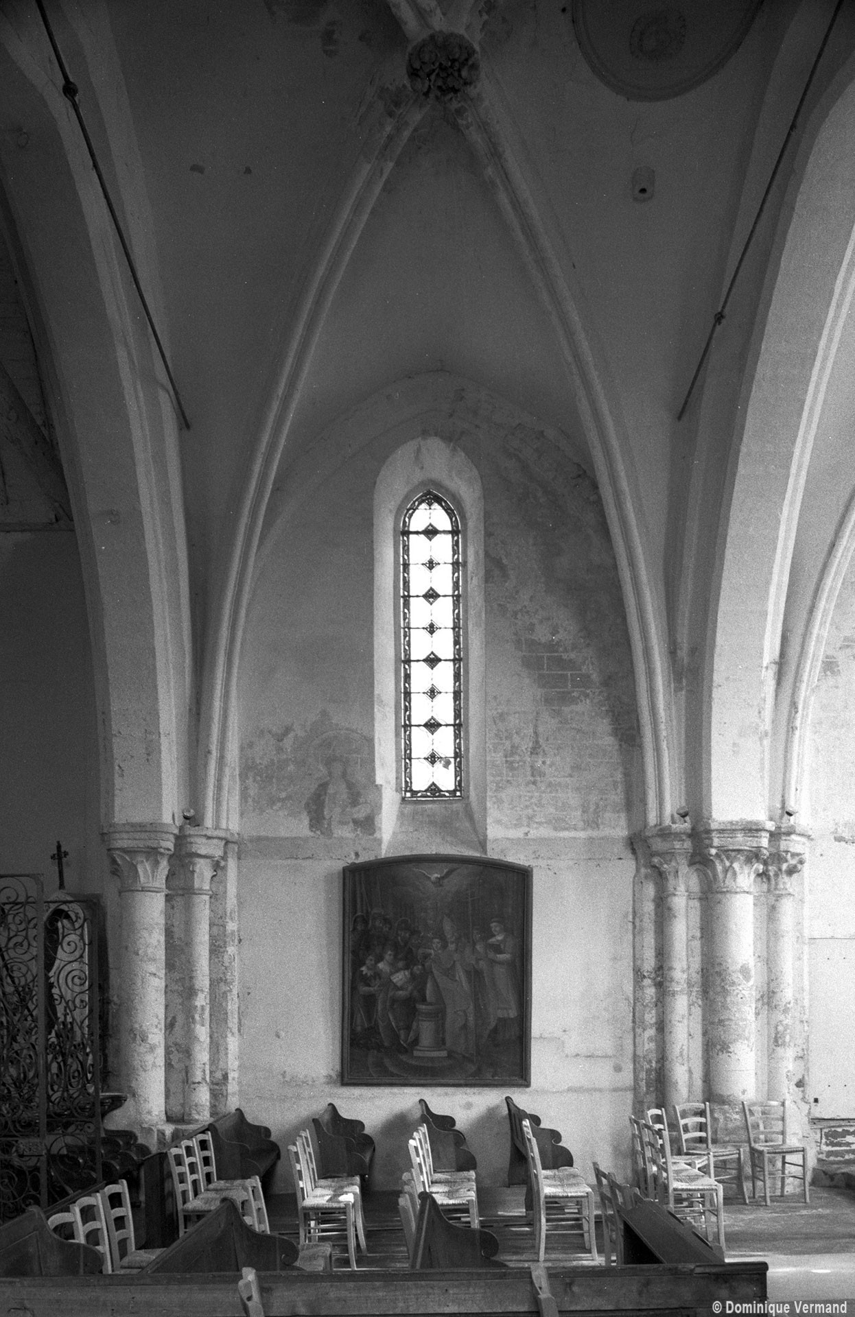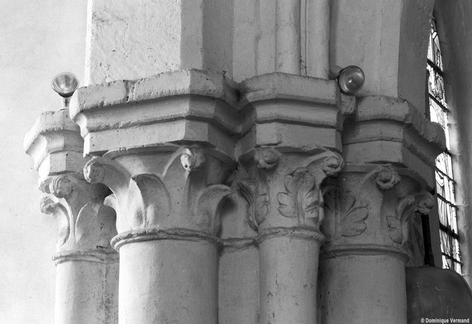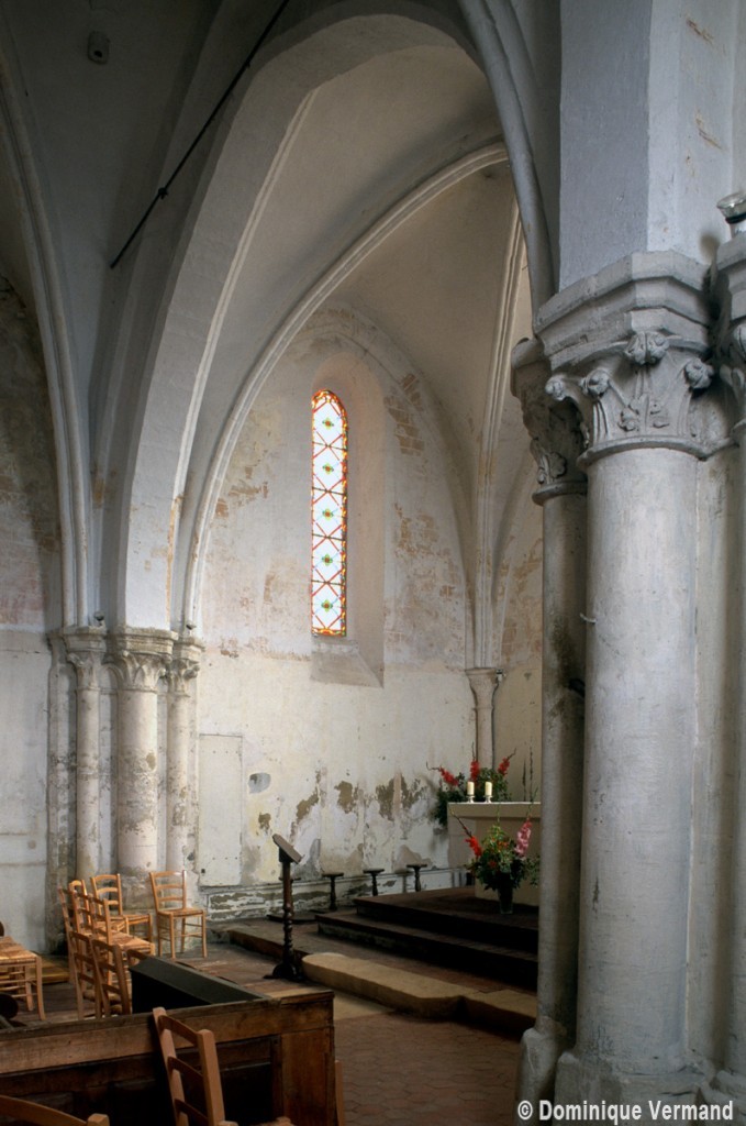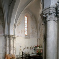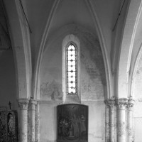 Reconstruit avec sobriété durant le premier quart du 13ème siècle, le choeur à chevet plat est de même largeur que la nef et comporte deux travées voûtées d’ogives. Une chapelle de même longueur et construite en même temps le flanque au sud. Son mur sud conserve toutefois des chapiteaux (à la jonction des deux travées) et une fenêtre décorée de pointes de diamant qui remontent à la fin du 12ème siècle et prouvent qu’une chapelle existait déjà à cet emplacement, avant la reconstruction des parties orientales. Des chapiteaux en attente, notamment à la belle pile vigoureusement articulée commune au choeur et à la chapelle, montrent qu’un voûtement d’ogives était prévu. Le mur méridional de cette chapelle sera percé par la suite de deux fenêtres (seconde moitié 13ème pour l’une et début 14ème pour celle à double lancette et rose que couronne un petit gâble).