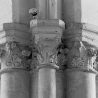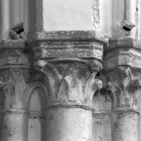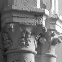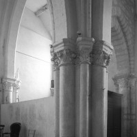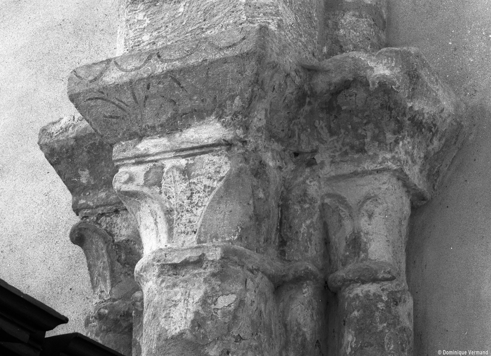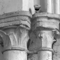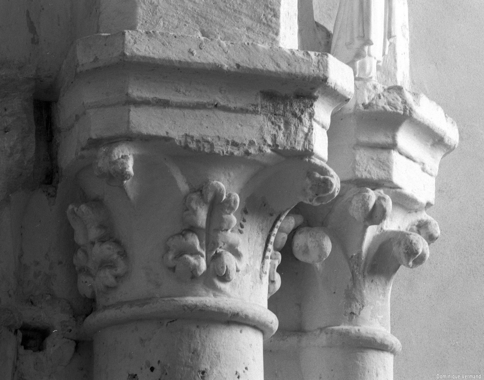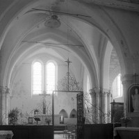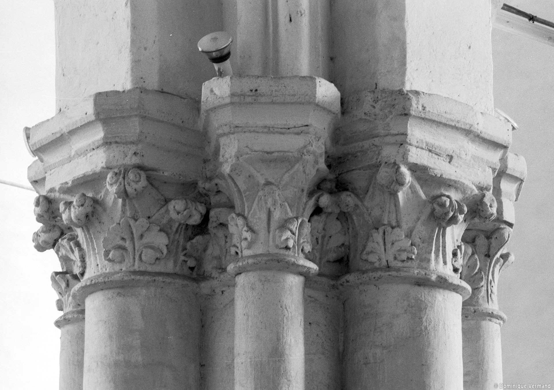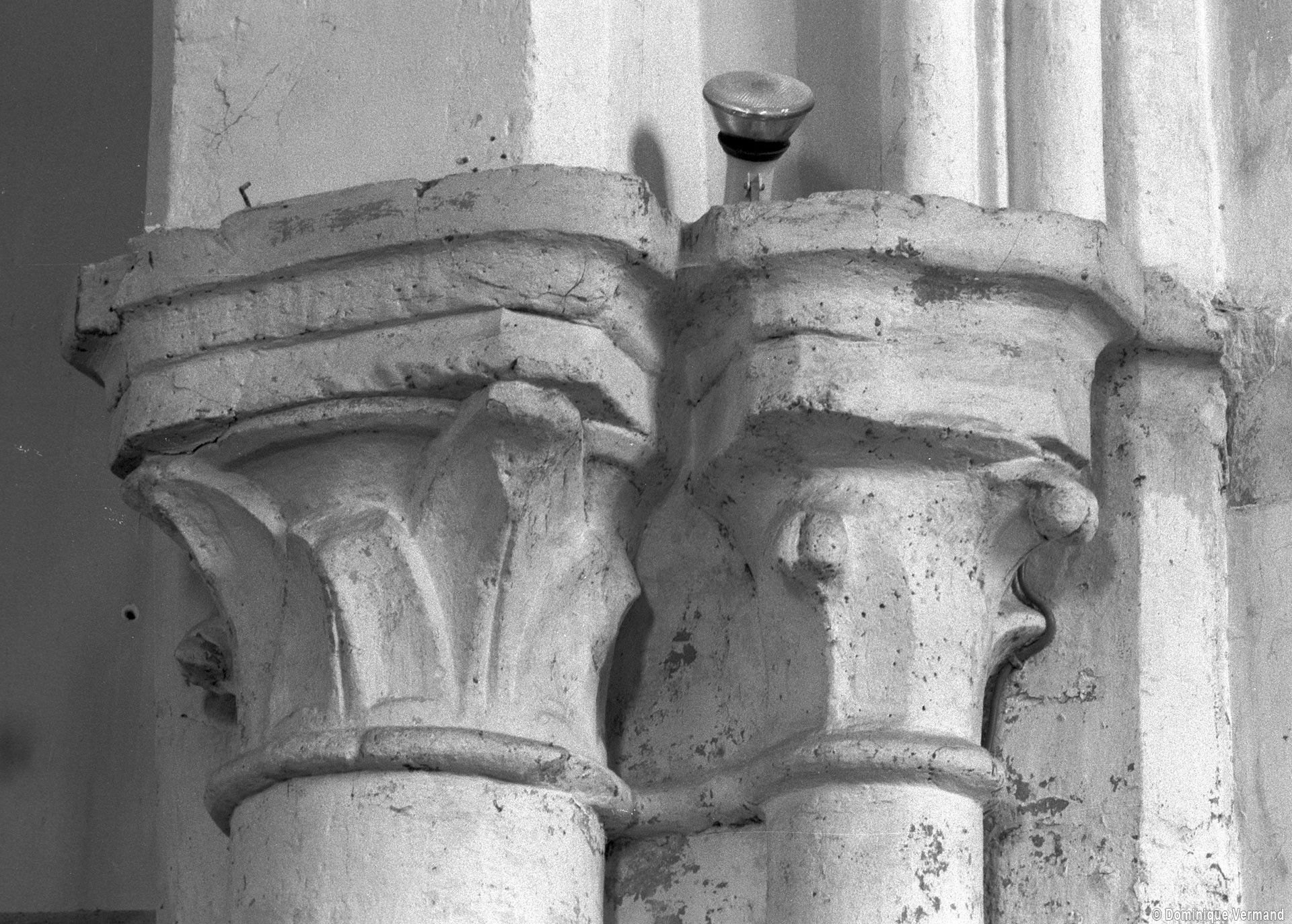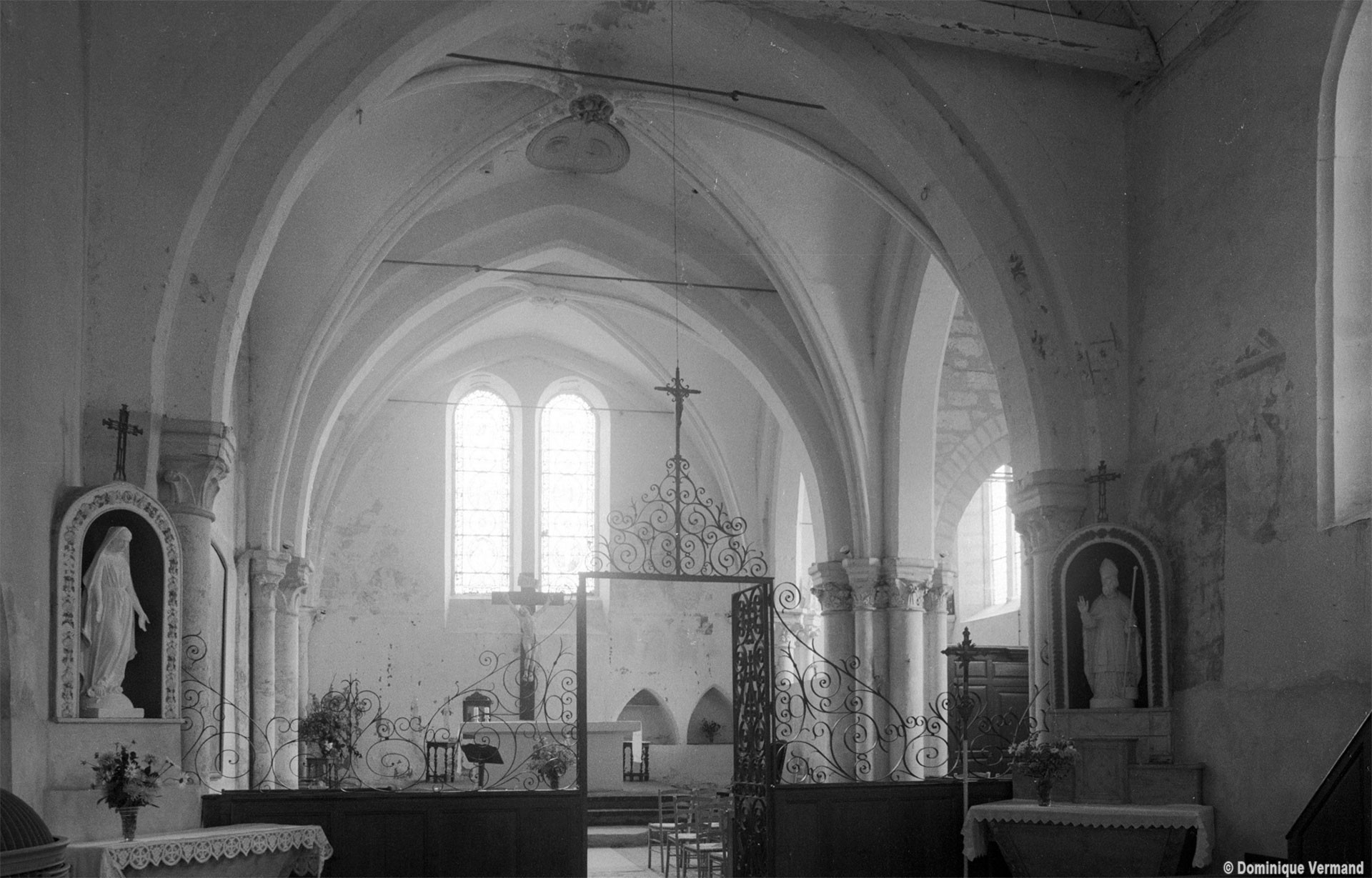 Reconstruit avec sobriété durant le premier quart du 13ème siècle, le choeur à chevet plat est de même largeur que la nef et comporte deux travées voûtées d’ogives. Une chapelle de même longueur et construite en même temps le flanque au sud. Son mur sud conserve toutefois des chapiteaux (à la jonction des deux travées) et une fenêtre décorée de pointes de diamant qui remontent à la fin du 12ème siècle et prouvent qu’une chapelle existait déjà à cet emplacement, avant la reconstruction des parties orientales. Des chapiteaux en attente, notamment à la belle pile vigoureusement articulée commune au choeur et à la chapelle, montrent qu’un voûtement d’ogives était prévu. Le mur méridional de cette chapelle sera percé par la suite de deux fenêtres (seconde moitié 13ème pour l’une et début 14ème pour celle à double lancette et rose que couronne un petit gâble).