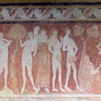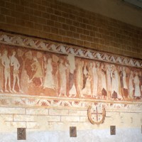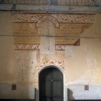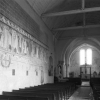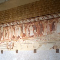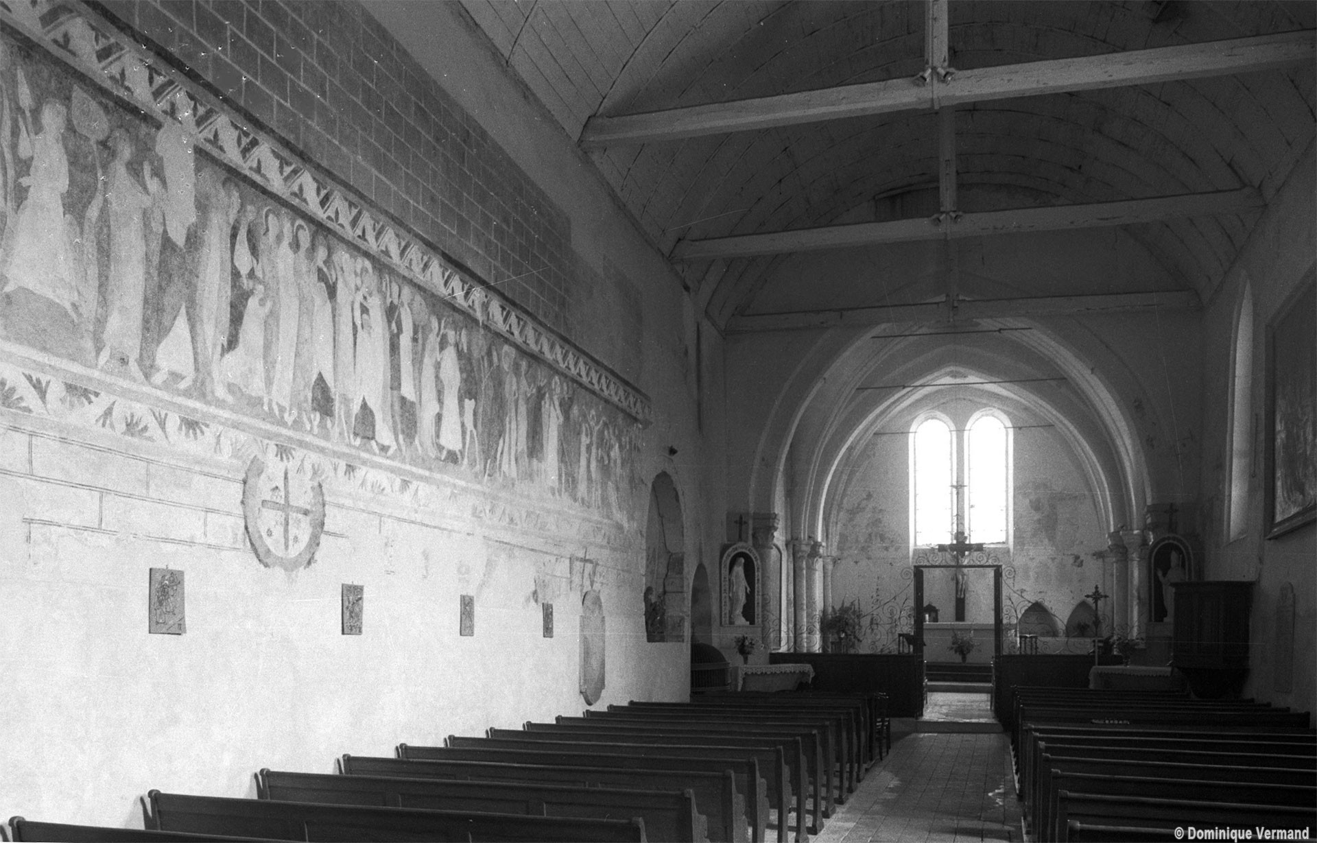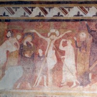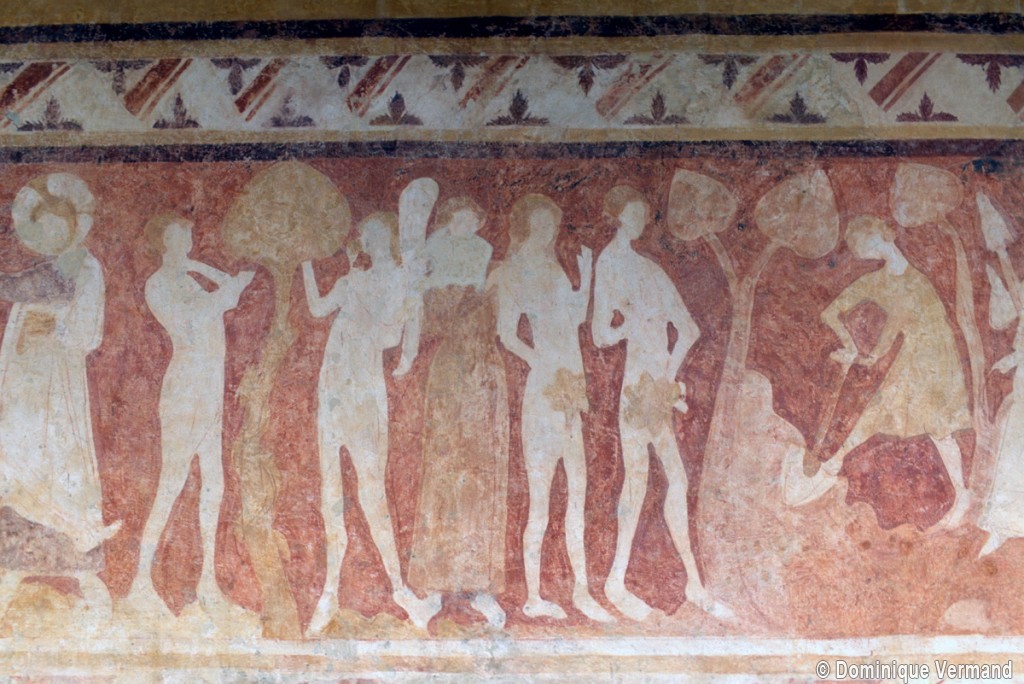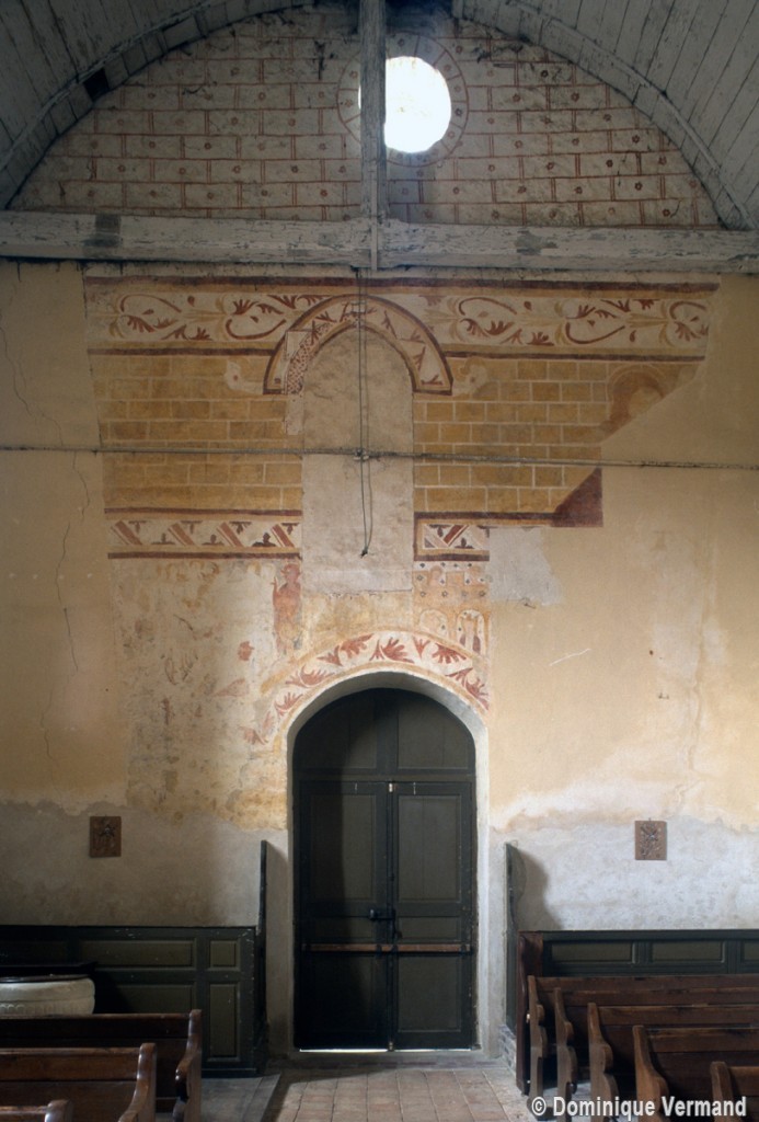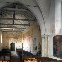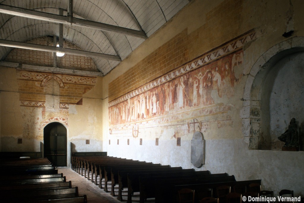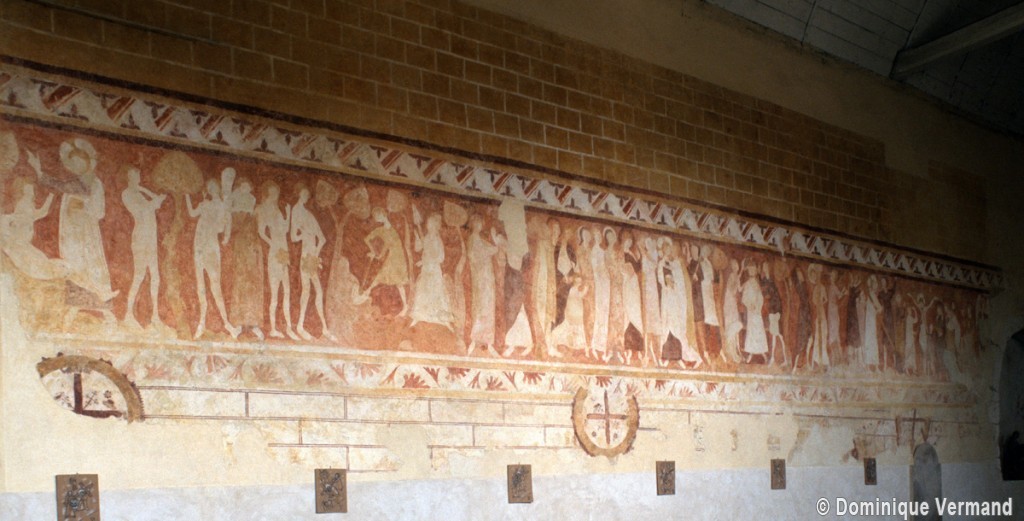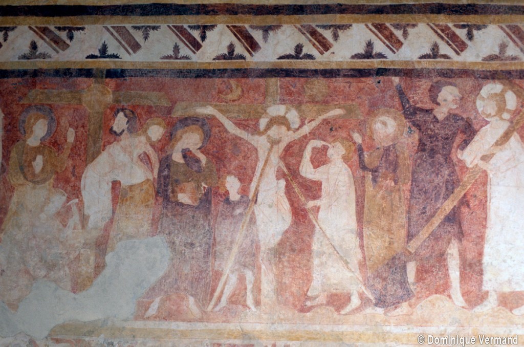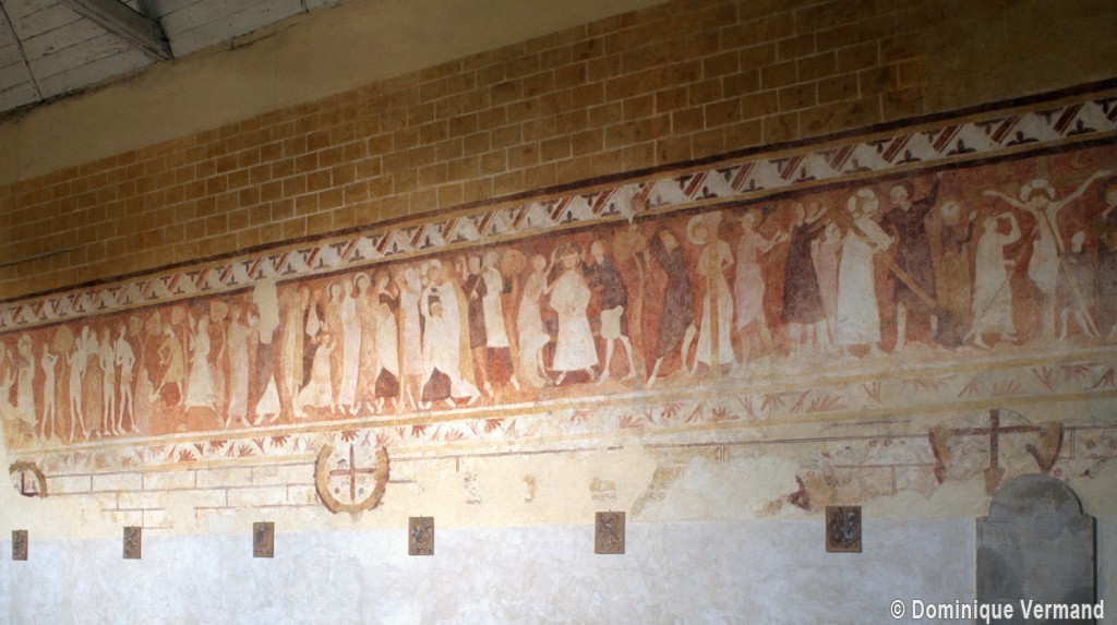 Réalisé fin 13ème ou début 14ème dans des teintes où dominent l’ocre et le marron, le cycle des fresques gothiques de la nef constitue une véritable rareté dans la région. Les thèmes iconographiques, très variés, sont traités en continu. On peut identifier sur le mur nord, depuis le revers de la façade : Eve sortant de la côte d’Adam; la Tentation; Adam bêchant la terre et Eve filant sa quenouille; Abraham; le Baiser de Judas; le Christ de douleur; la Flagellation; le Portement de Croix; la Crucifixion; la Descente de Croix.
