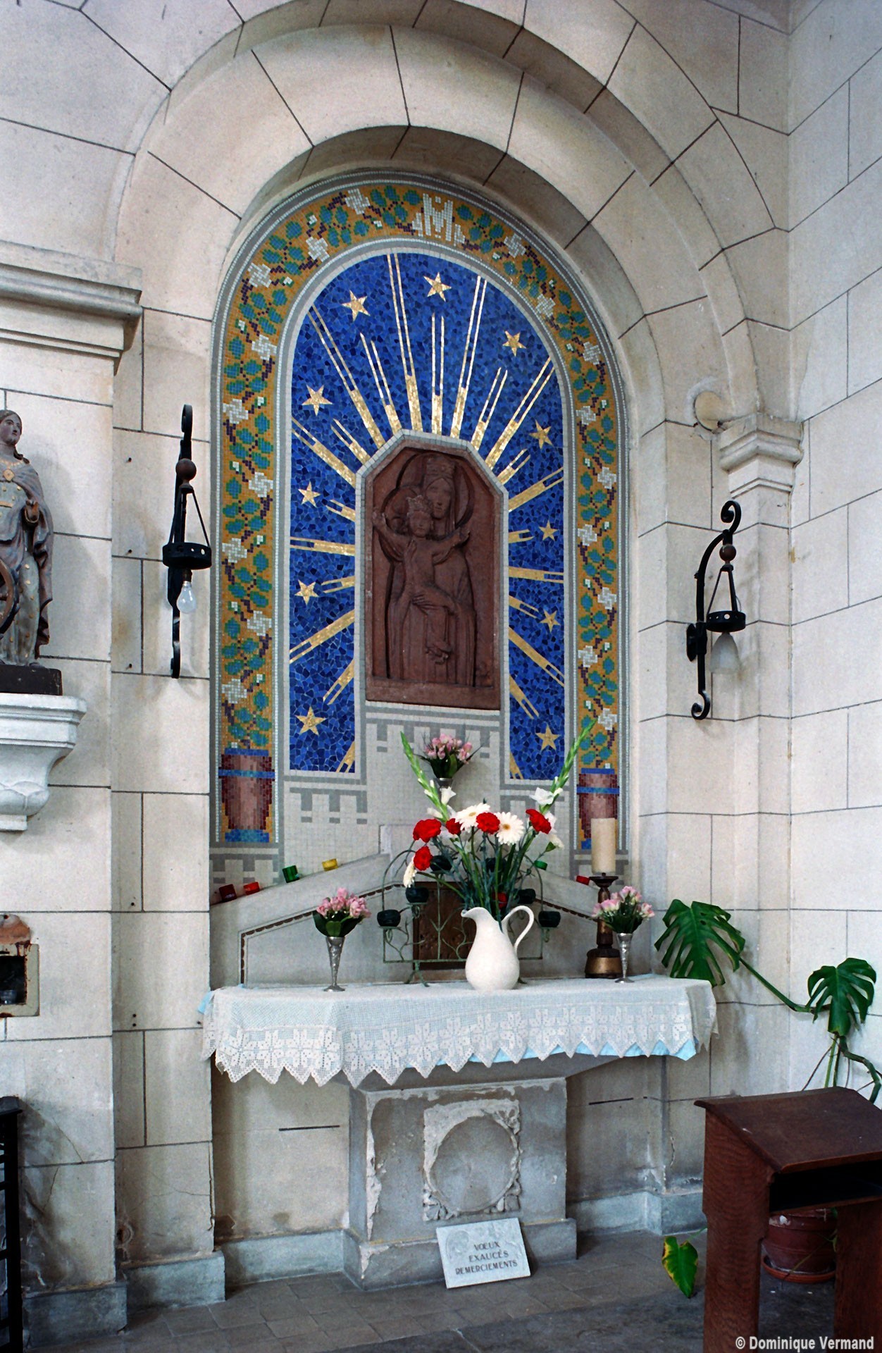 Outre quelques statues anciennes et un Christ du 16ème siècle provenant, sans doute, de l’ancienne poutre de gloire, l’intérêt se portera sur la décoration en mosaïques, typiquement art déco, des autels latéraux et sur les vitraux aux couleurs éclatantes du triplet du chevet (2008).