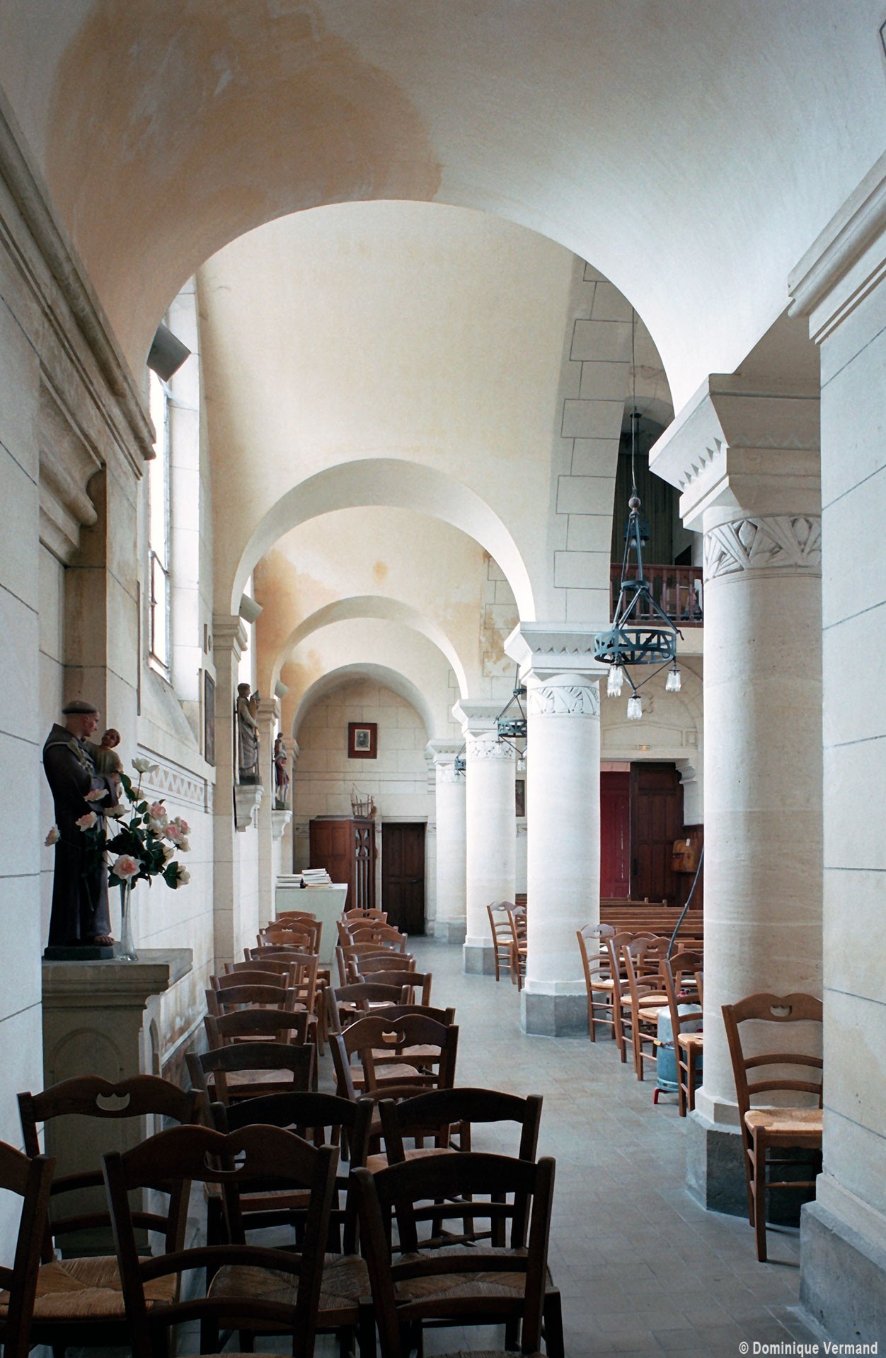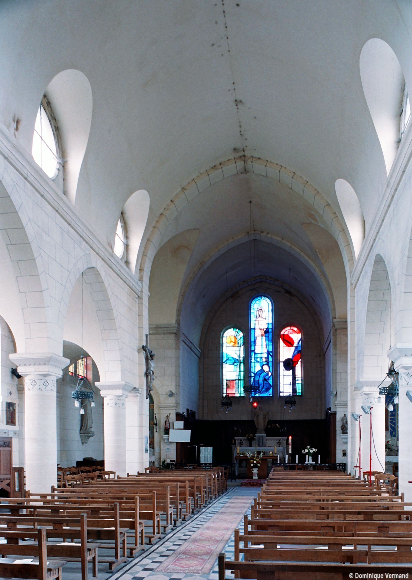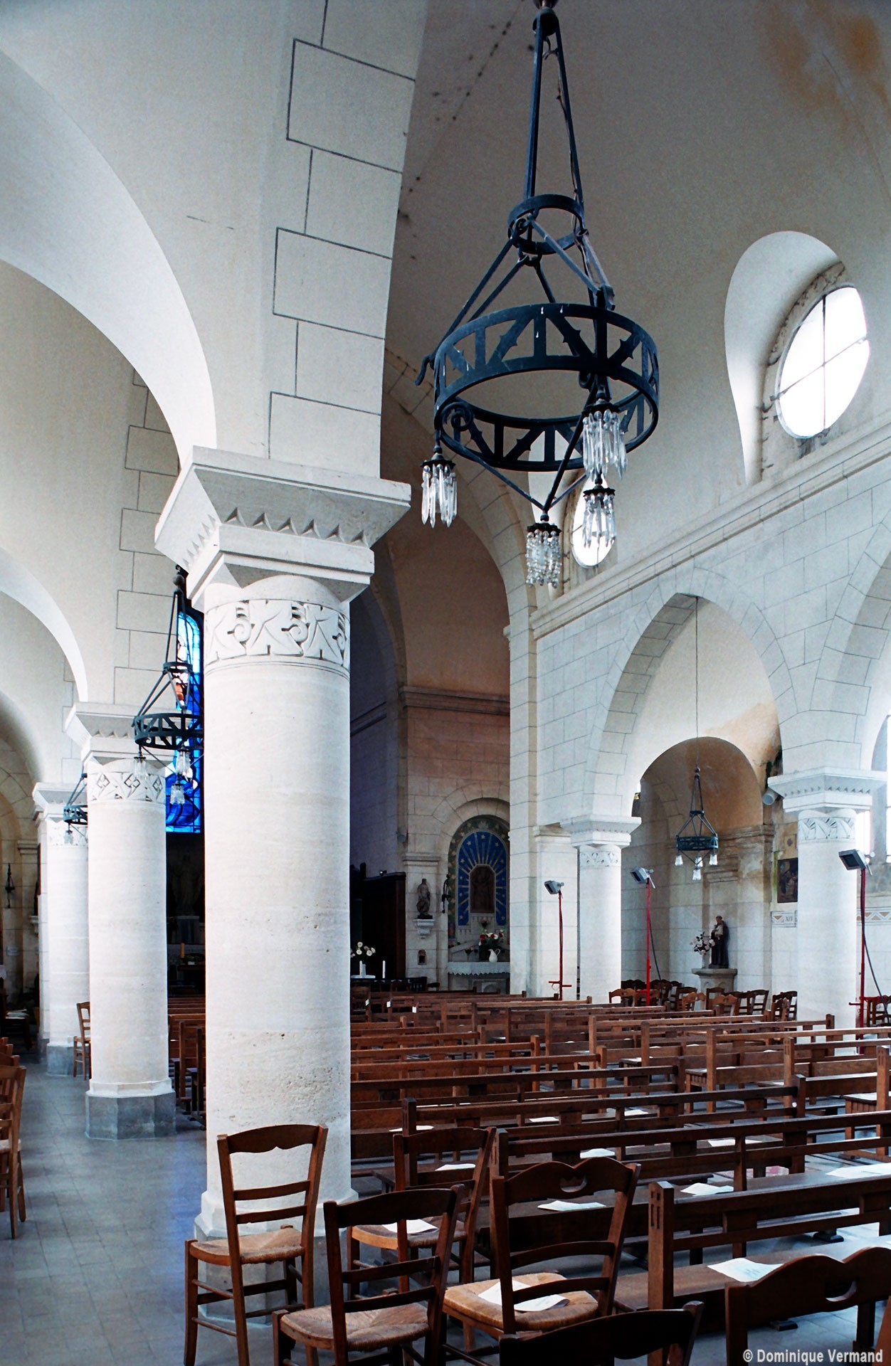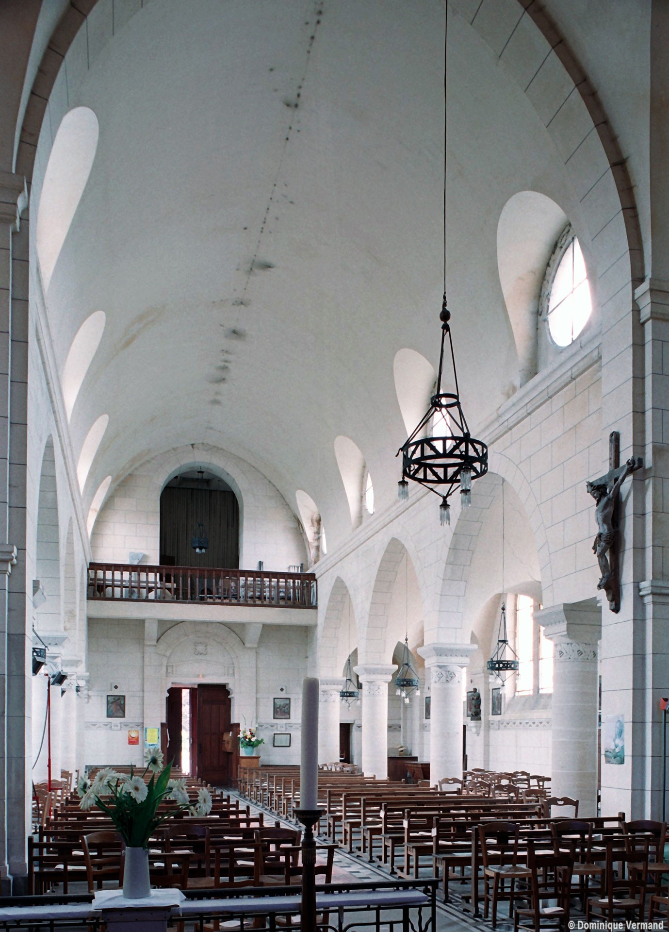 La nef est la partie la plus originale. Sa voûte en berceau brisée est pénétrée, de chaque côté, par les lunettes de quatre fenêtres en forme d’oculus. Les arcades, également brisées, retombent sur des piles circulaires. Selon une manière typiquement art déco, les chapiteaux sont traités comme une frise sculptée qui n’est, en fait, que la partie supérieure de la pile.