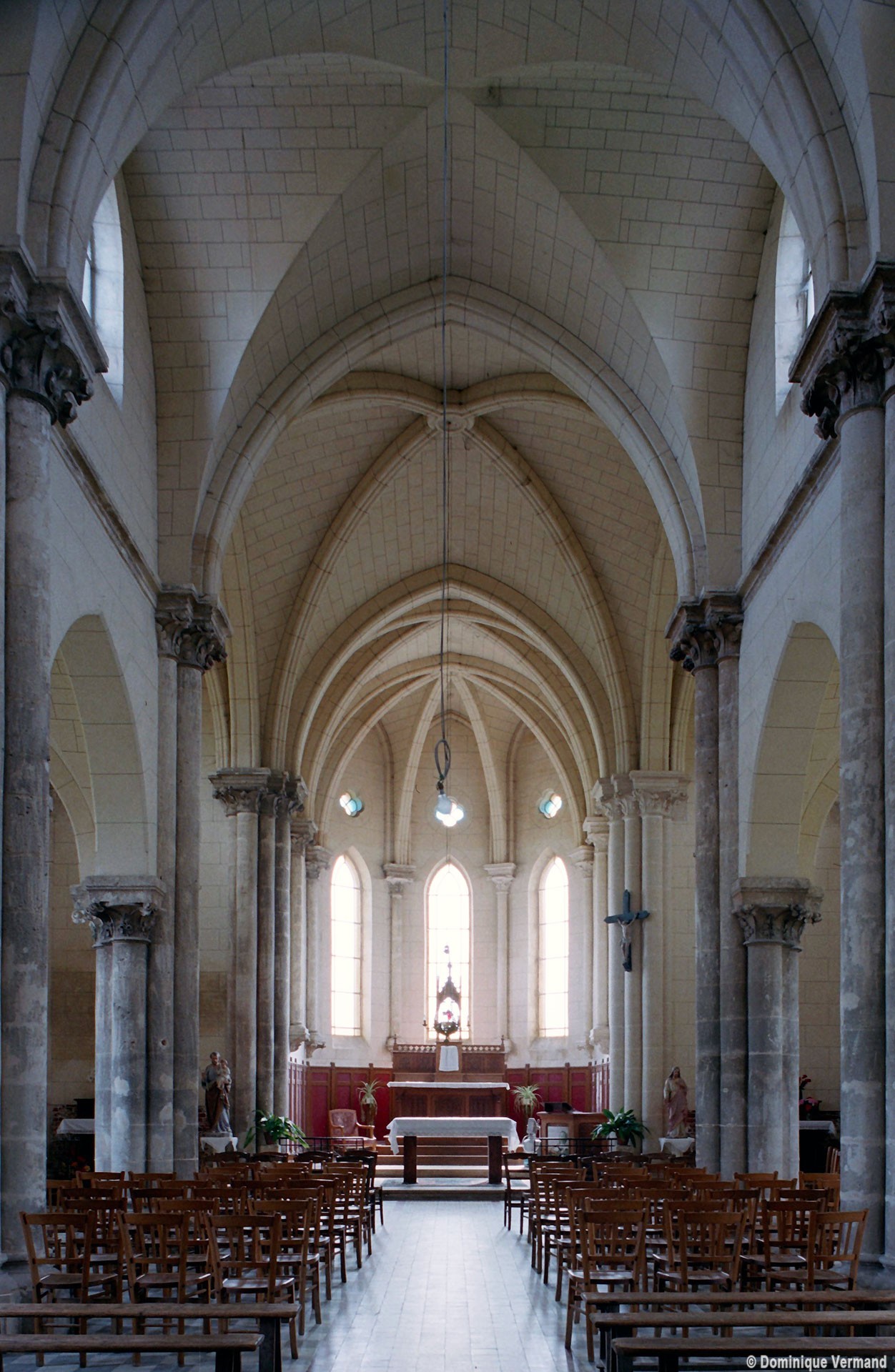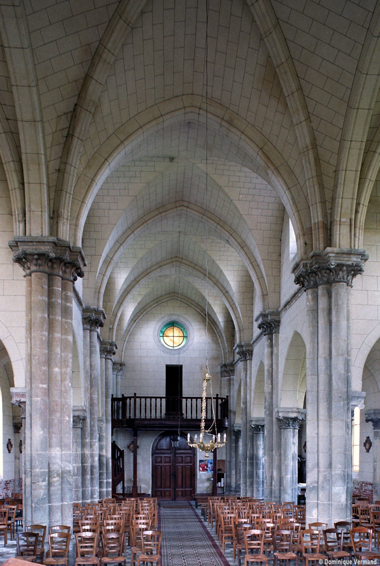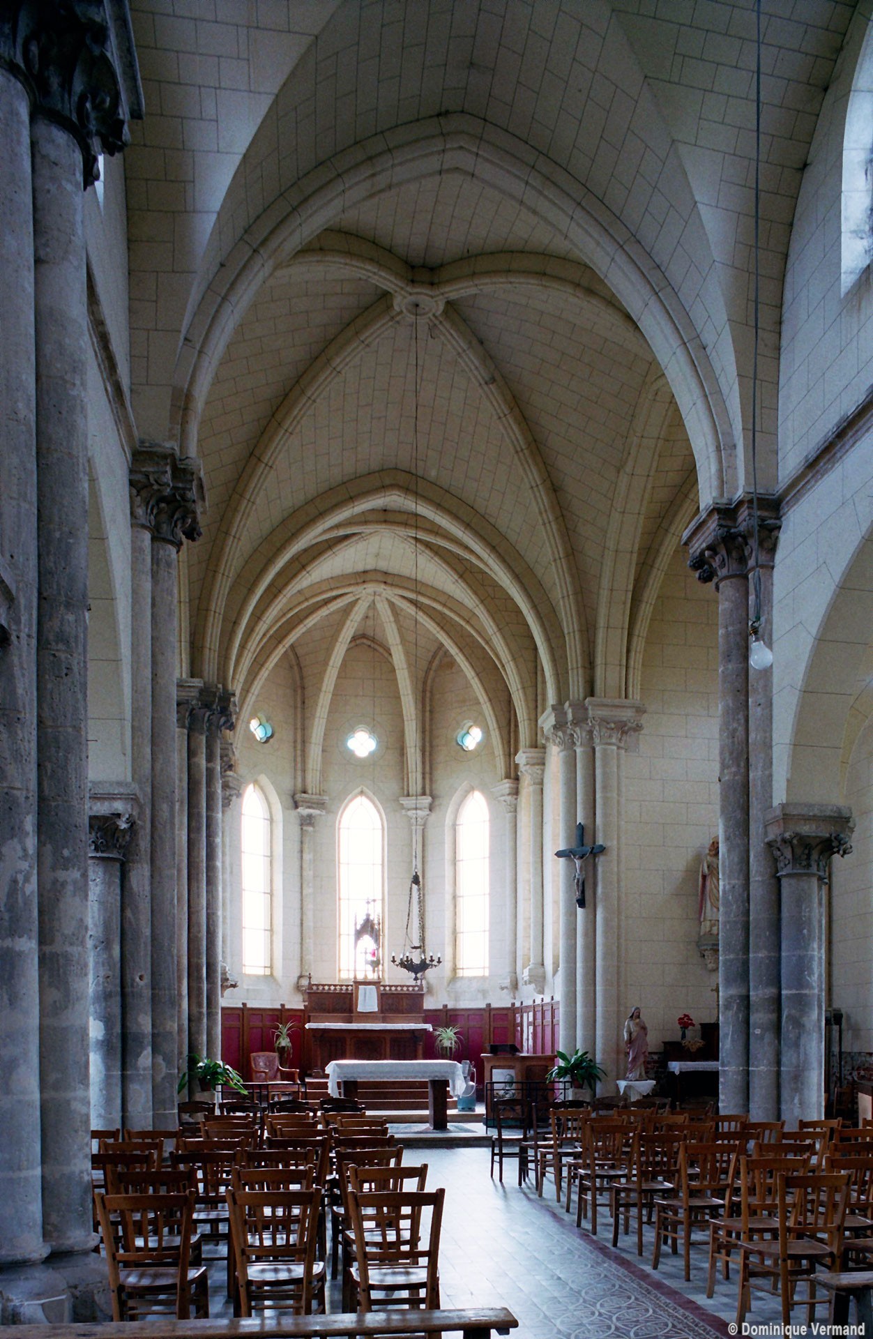 Notre-Dame est emblématique des nombreux édifices reconstruits durant le Second Empire sous l’action énergique de l’évêque d’alors, Mgr. Gignoux. Le style néo-gothique, l’usage combiné de la brique et de la pierre, le haut clocher porche en façade (reconstruit après la Guerre 14-18) : rien n’y manque. Une nef de trois travées avec bas-côtés, un transept saillant et un choeur composé d’une travée droite et d’une abside à cinq pans composent un plan des plus classiques. Nef et bas-côtés sont voûtés d’arêtes tandis que le reste de l’édifice reçoit des voûtes d’ogives. Les chapiteaux à crochets évoquent le milieu du 13ème siècle (2008).