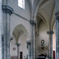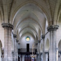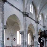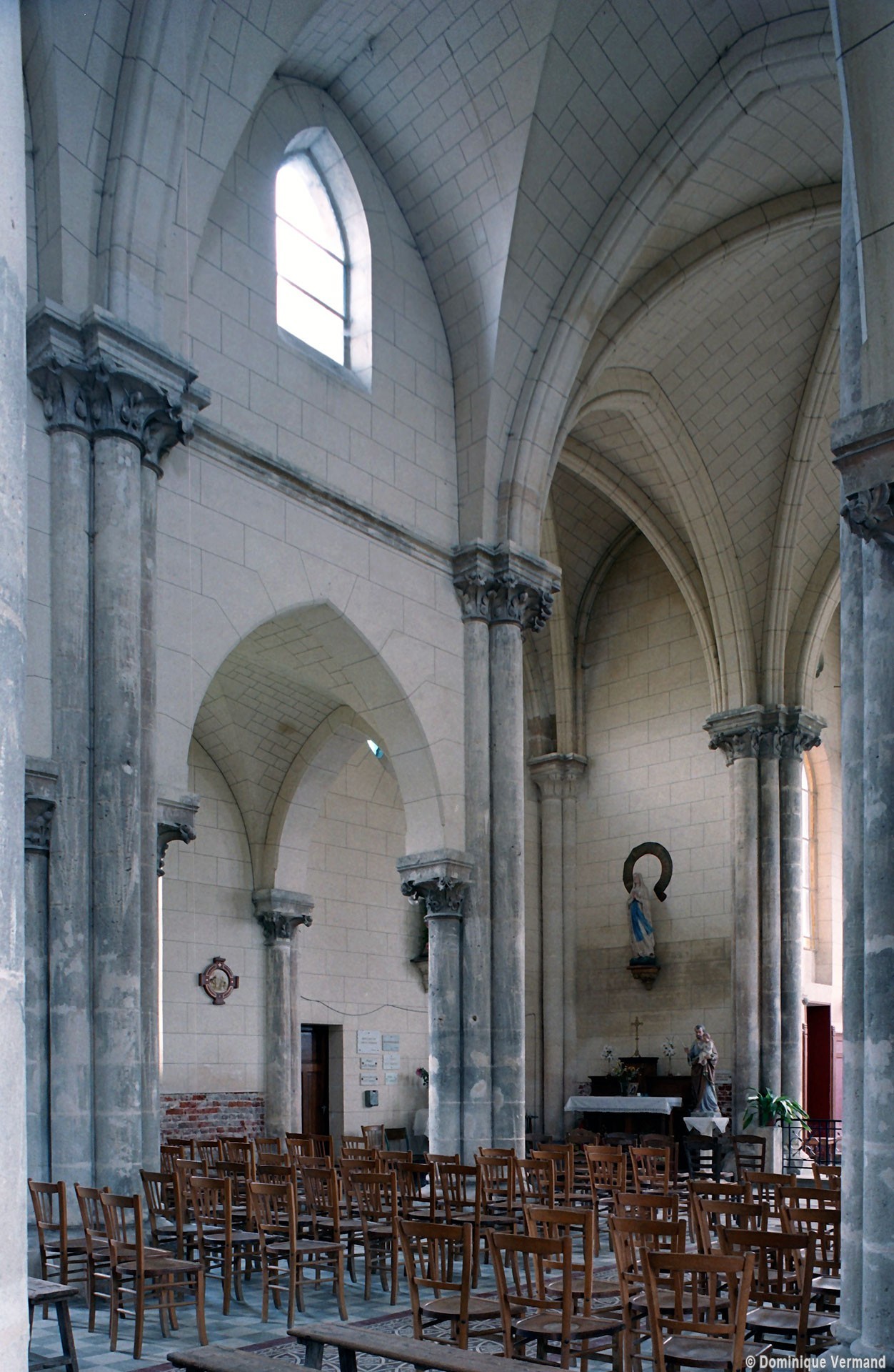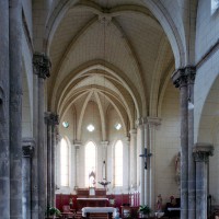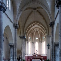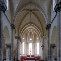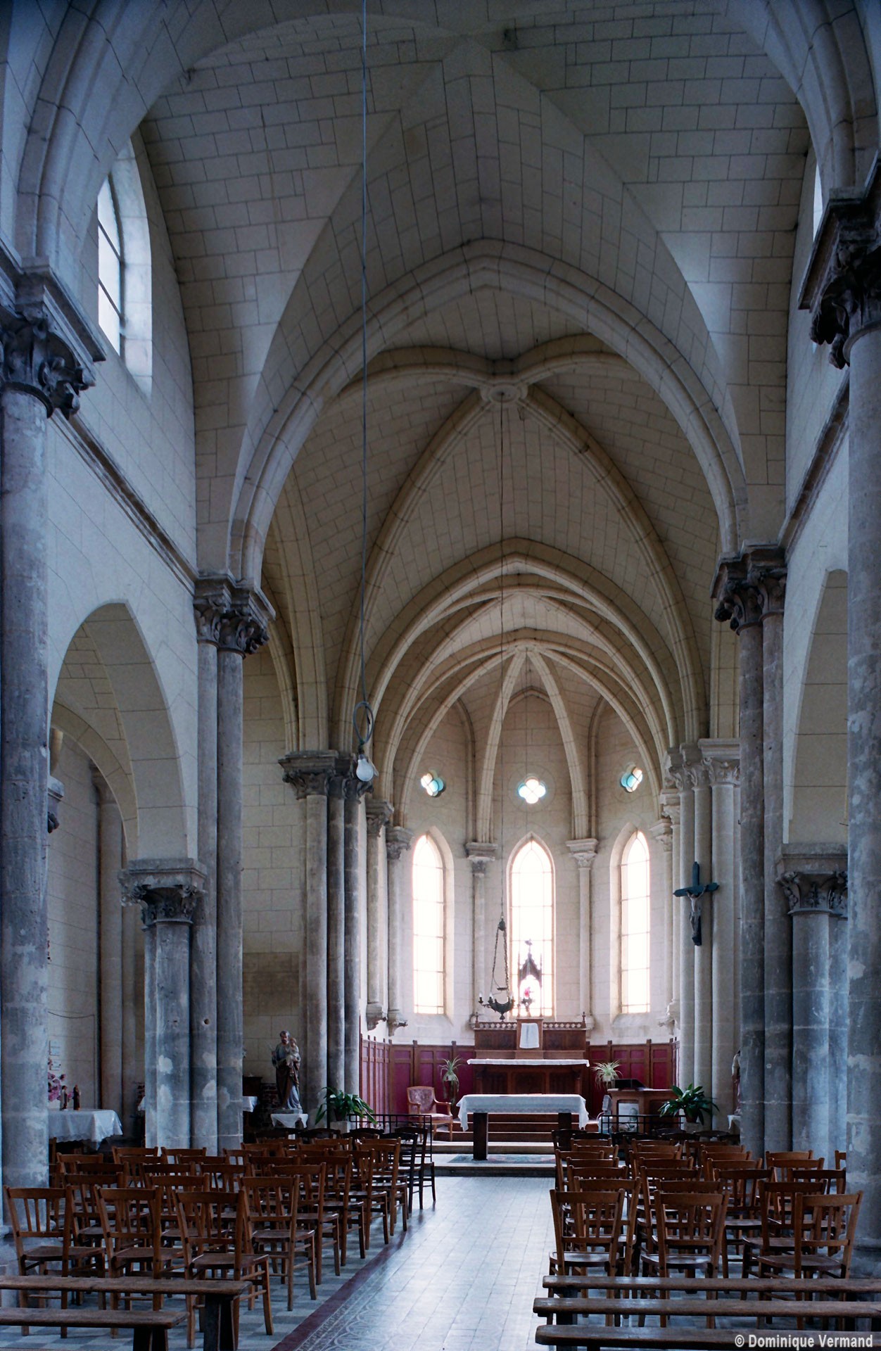 Notre-Dame est emblématique des nombreux édifices reconstruits durant le Second Empire sous l’action énergique de l’évêque d’alors, Mgr. Gignoux. Le style néo-gothique, l’usage combiné de la brique et de la pierre, le haut clocher porche en façade (reconstruit après la Guerre 14-18) : rien n’y manque. Une nef de trois travées avec bas-côtés, un transept saillant et un choeur composé d’une travée droite et d’une abside à cinq pans composent un plan des plus classiques. Nef et bas-côtés sont voûtés d’arêtes tandis que le reste de l’édifice reçoit des voûtes d’ogives. Les chapiteaux à crochets évoquent le milieu du 13ème siècle (2008).