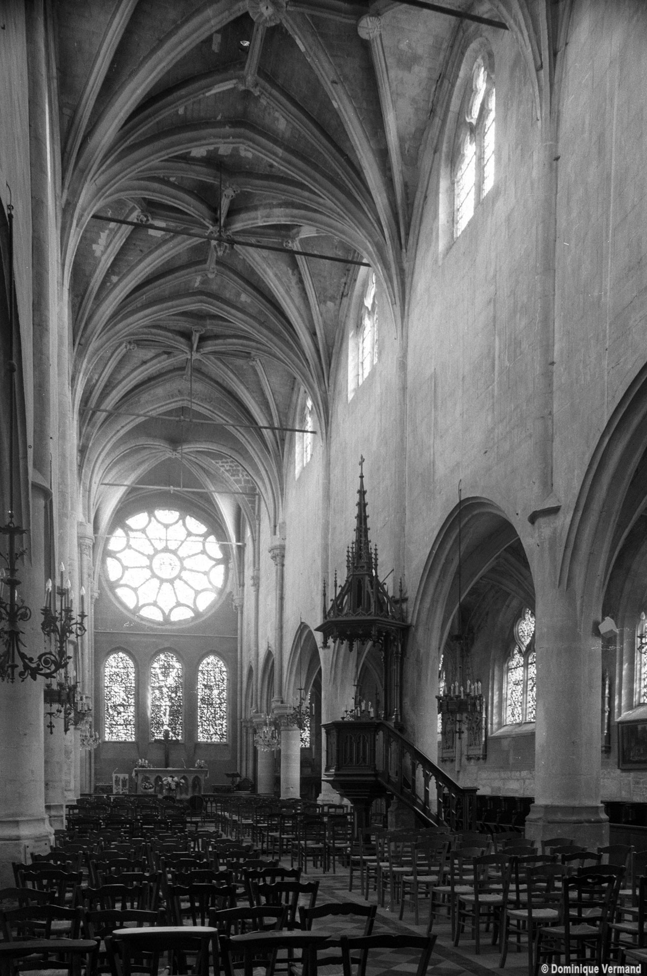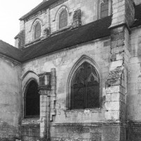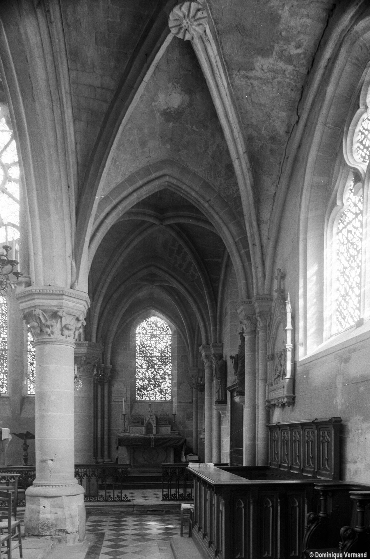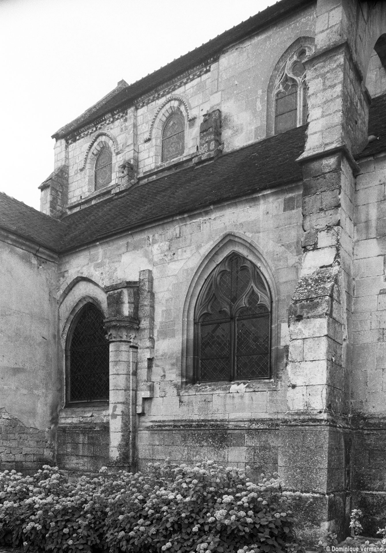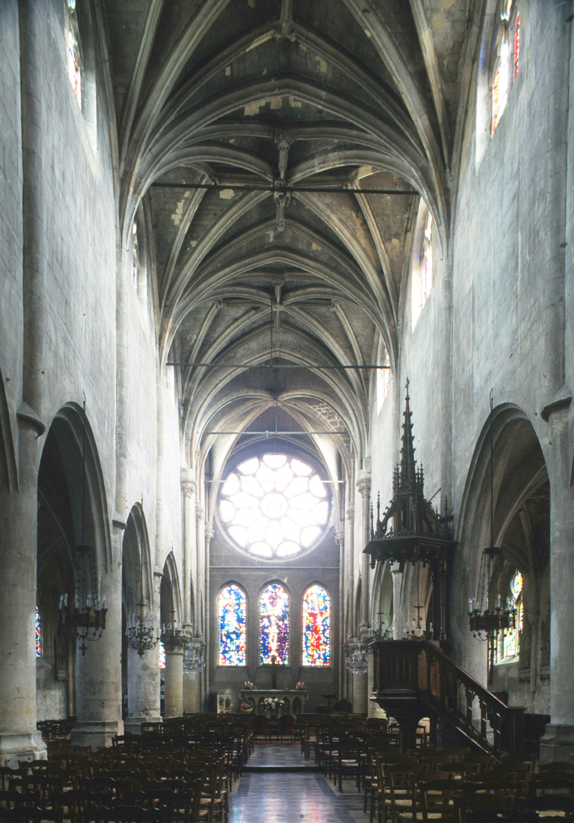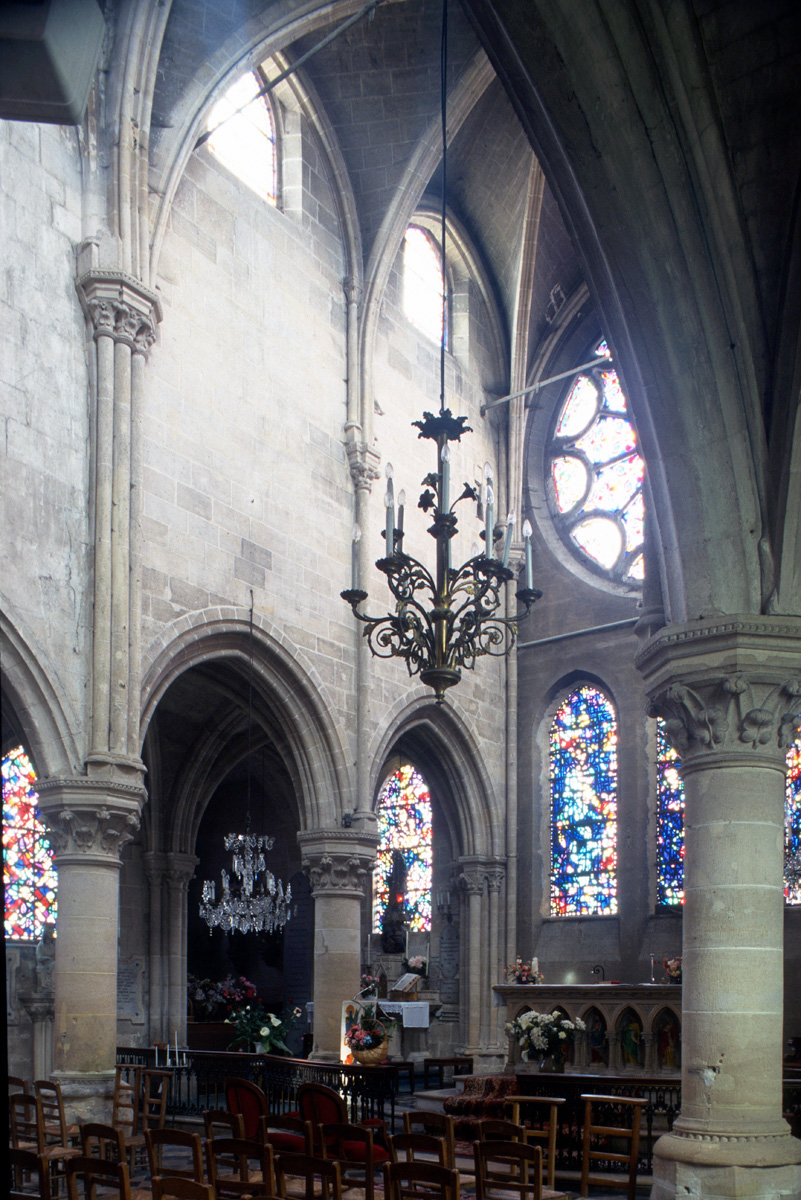 Gommé au niveau des piles, l’effet d’alternance engendré par la voûte sexpartite reste cependant perceptible au-dessus où une seule colonnette répond au doubleau intermédiaire de la voûte (temps faible) alors que trois marquent la retombée du doubleau principal et des deux ogives (temps fort). La corbeille circulaire des chapiteaux montre un décor uniforme associant crochets et feuilles découpées inspiré, là encore, du répertoire sculpté de Notre-Dame de Paris. Le chevet plat, à la composition particulièrement bien équilibrée, est percé de cinq fenêtres dont les piédroits sont soulignés par de fines colonnettes en délit. Une grande rose au remplage refait surmonte le triplet de fenêtres correspondant au vaisseau central. Le chœur de Saint-Pierre et Saint-Paul, traité avec un raffinement exceptionnel, se prolongeait vers l’ouest comme le montrent des éléments contemporains encore visibles à la cinquième travée du bas-côté sud. Au nord, et au même niveau, une colonne et un chapiteau du 13e siècle attestent qu’une chapelle avait été ajoutée à cette époque.