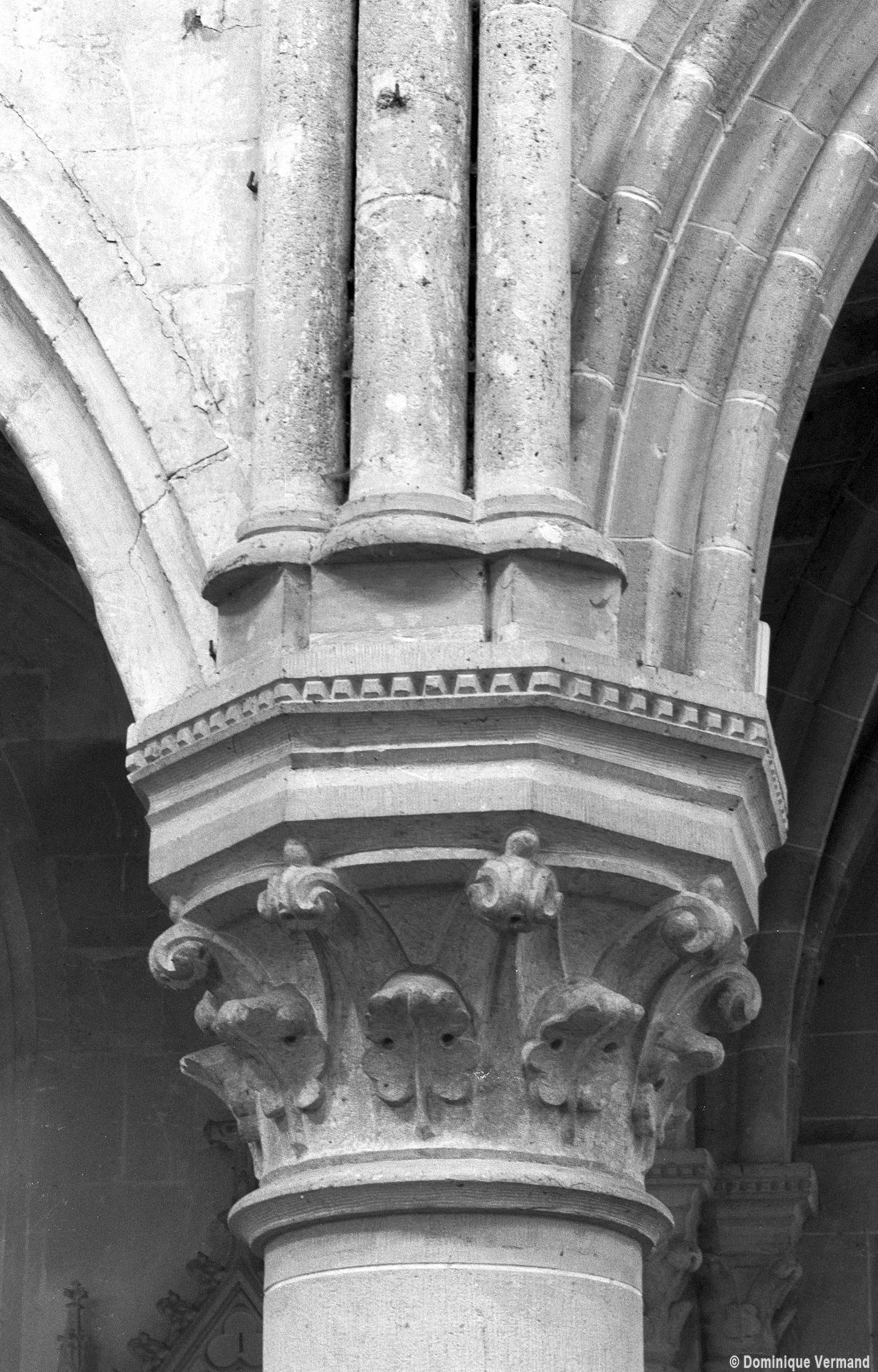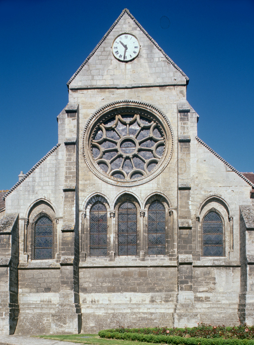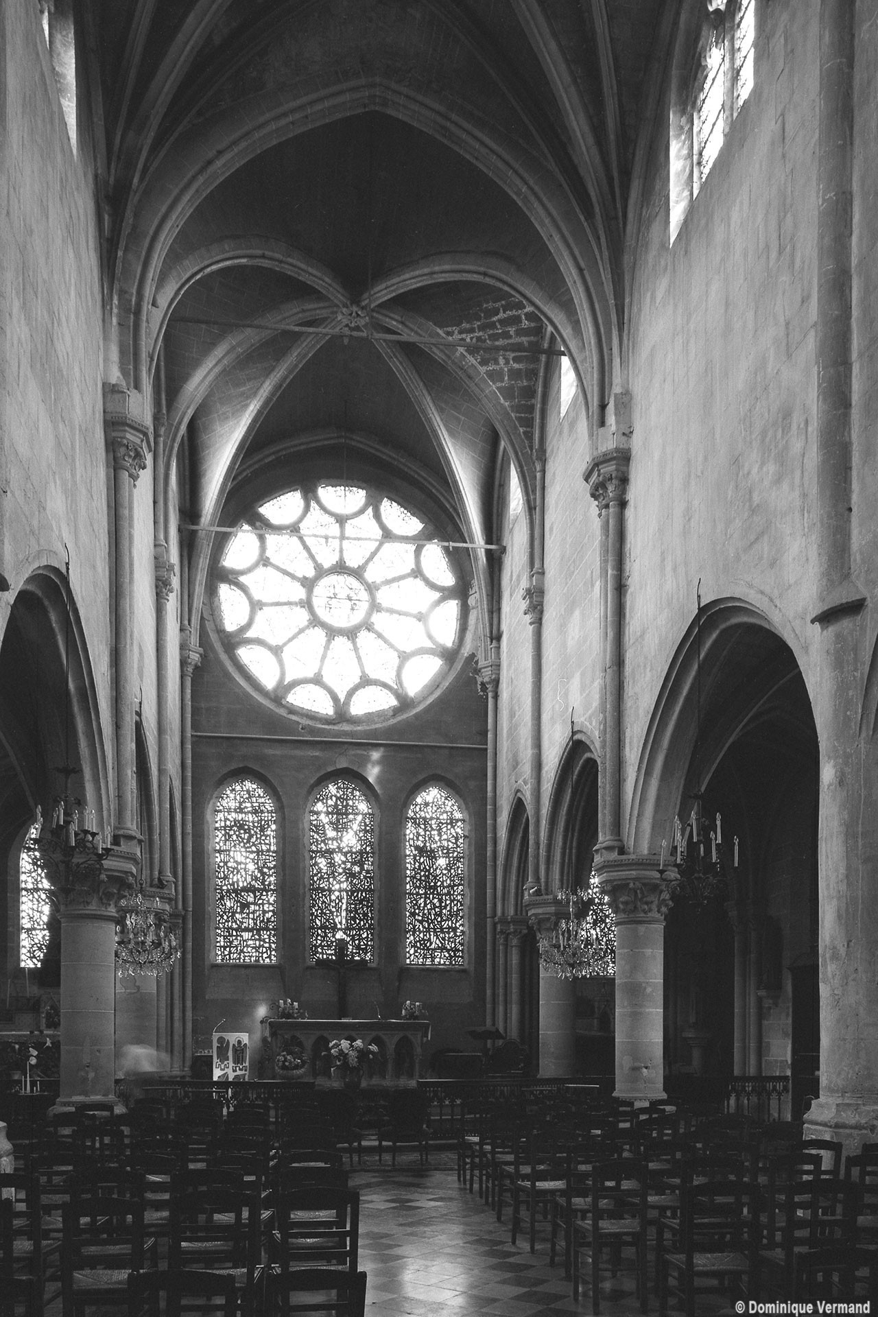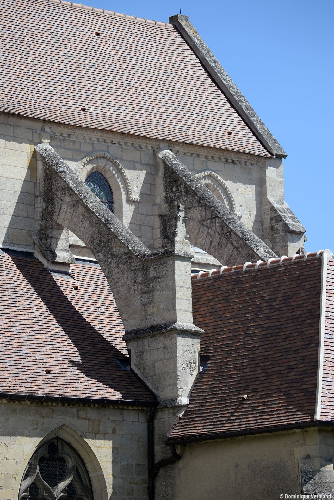 Gommé au niveau des piles, l’effet d’alternance engendré par la voûte sexpartite reste cependant perceptible au-dessus où une seule colonnette répond au doubleau intermédiaire de la voûte (temps faible) alors que trois marquent la retombée du doubleau principal et des deux ogives (temps fort). La corbeille circulaire des chapiteaux montre un décor uniforme associant crochets et feuilles découpées inspiré, là encore, du répertoire sculpté de Notre-Dame de Paris. Le chevet plat, à la composition particulièrement bien équilibrée, est percé de cinq fenêtres dont les piédroits sont soulignés par de fines colonnettes en délit. Une grande rose au remplage refait surmonte le triplet de fenêtres correspondant au vaisseau central. Le chœur de Saint-Pierre et Saint-Paul, traité avec un raffinement exceptionnel, se prolongeait vers l’ouest comme le montrent des éléments contemporains encore visibles à la cinquième travée du bas-côté sud. Au nord, et au même niveau, une colonne et un chapiteau du 13e siècle attestent qu’une chapelle avait été ajoutée à cette époque.