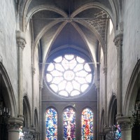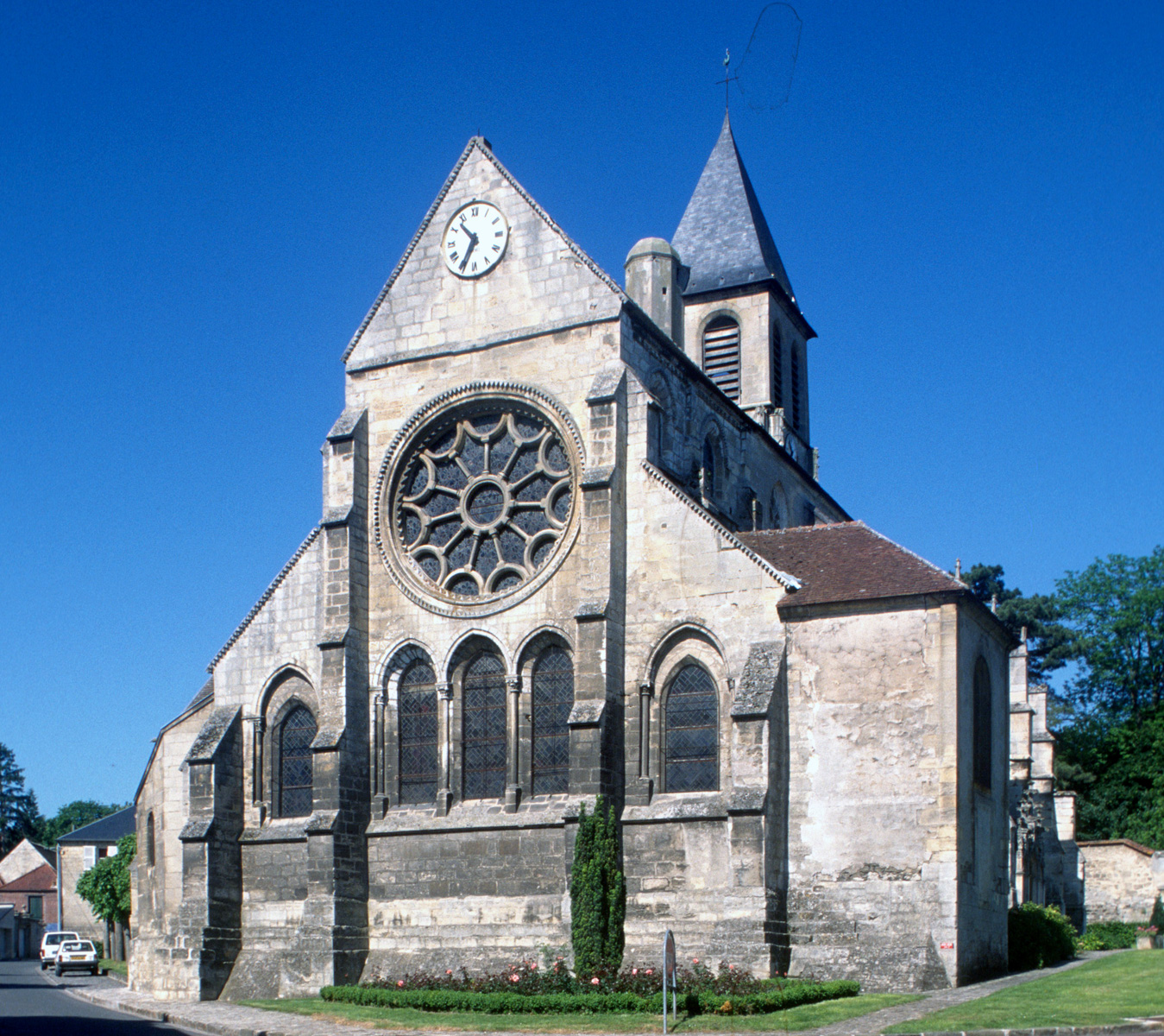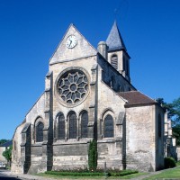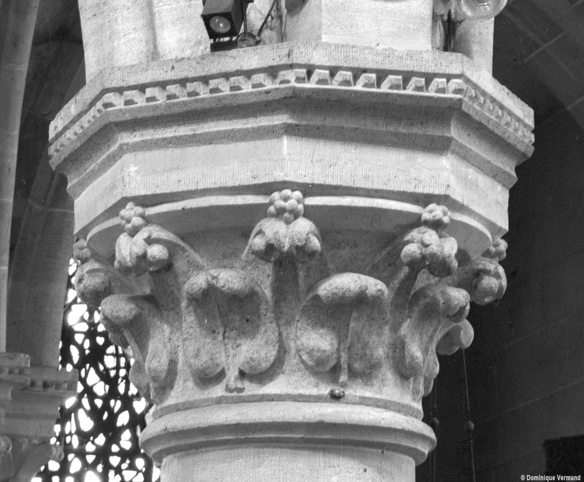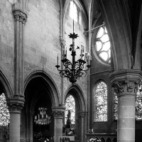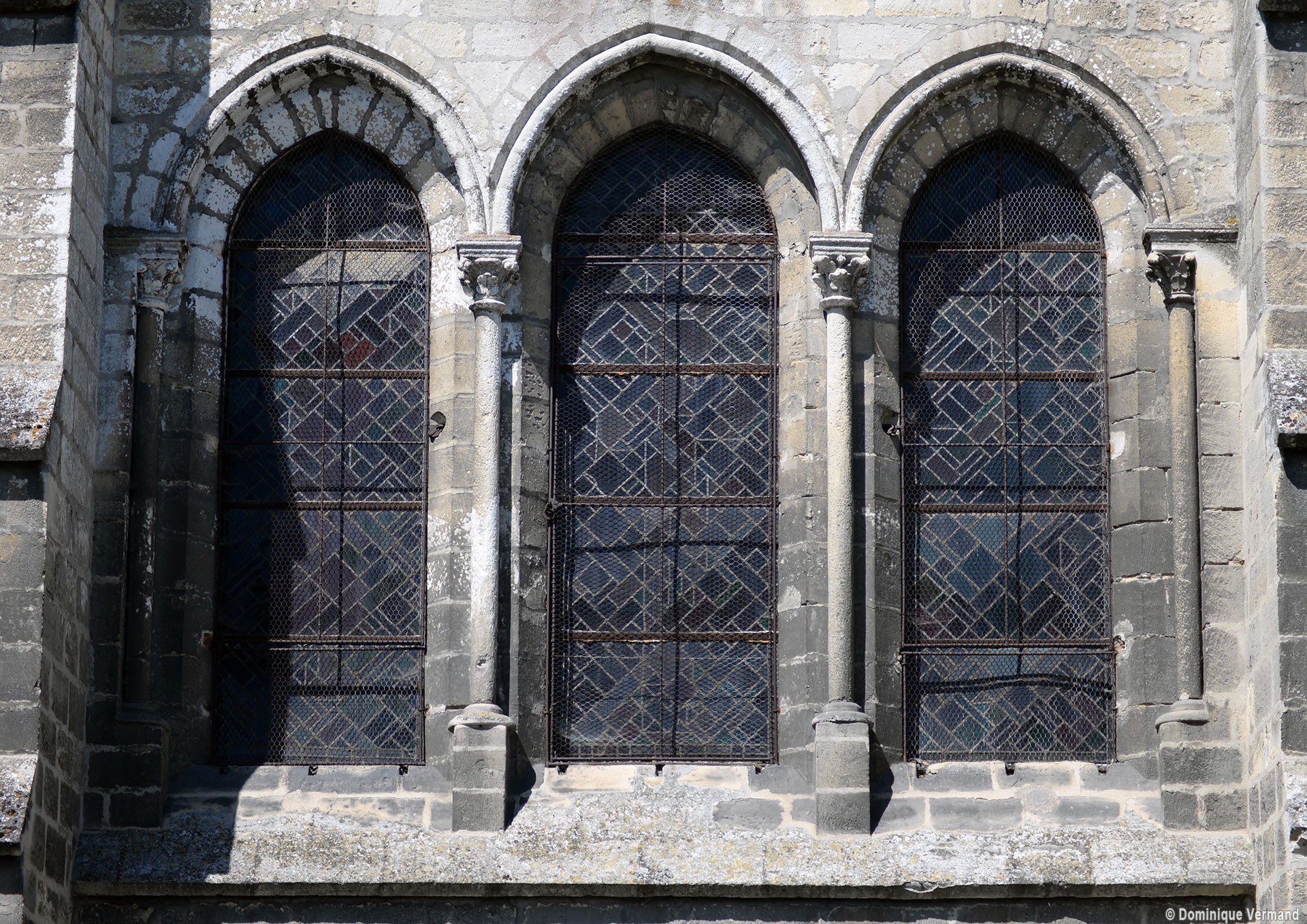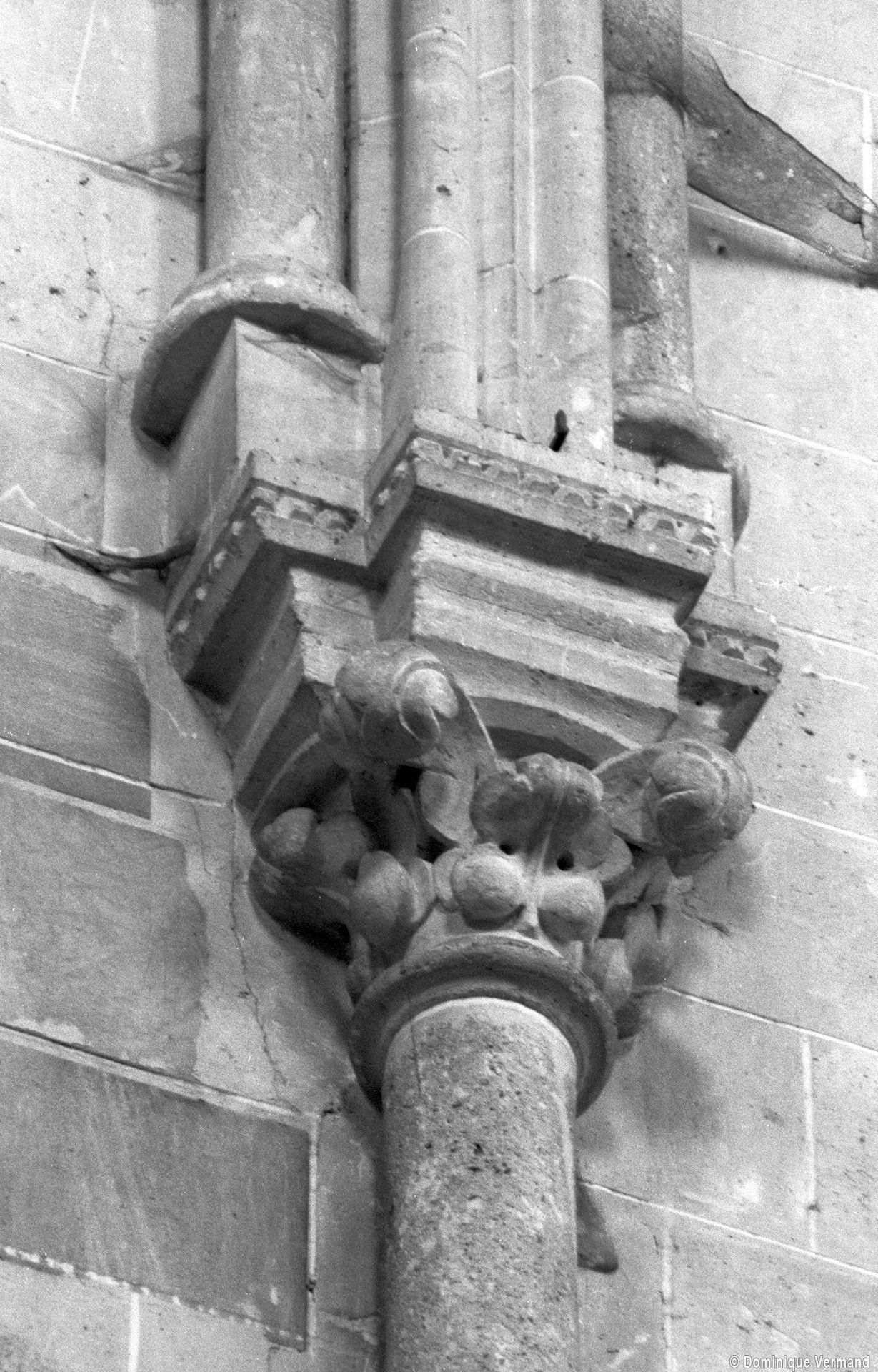 Gommé au niveau des piles, l’effet d’alternance engendré par la voûte sexpartite reste cependant perceptible au-dessus où une seule colonnette répond au doubleau intermédiaire de la voûte (temps faible) alors que trois marquent la retombée du doubleau principal et des deux ogives (temps fort). La corbeille circulaire des chapiteaux montre un décor uniforme associant crochets et feuilles découpées inspiré, là encore, du répertoire sculpté de Notre-Dame de Paris. Le chevet plat, à la composition particulièrement bien équilibrée, est percé de cinq fenêtres dont les piédroits sont soulignés par de fines colonnettes en délit. Une grande rose au remplage refait surmonte le triplet de fenêtres correspondant au vaisseau central. Le chœur de Saint-Pierre et Saint-Paul, traité avec un raffinement exceptionnel, se prolongeait vers l’ouest comme le montrent des éléments contemporains encore visibles à la cinquième travée du bas-côté sud. Au nord, et au même niveau, une colonne et un chapiteau du 13e siècle attestent qu’une chapelle avait été ajoutée à cette époque.