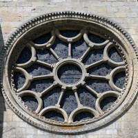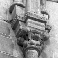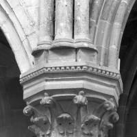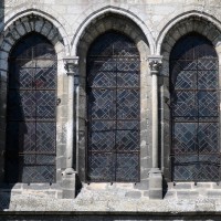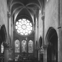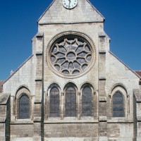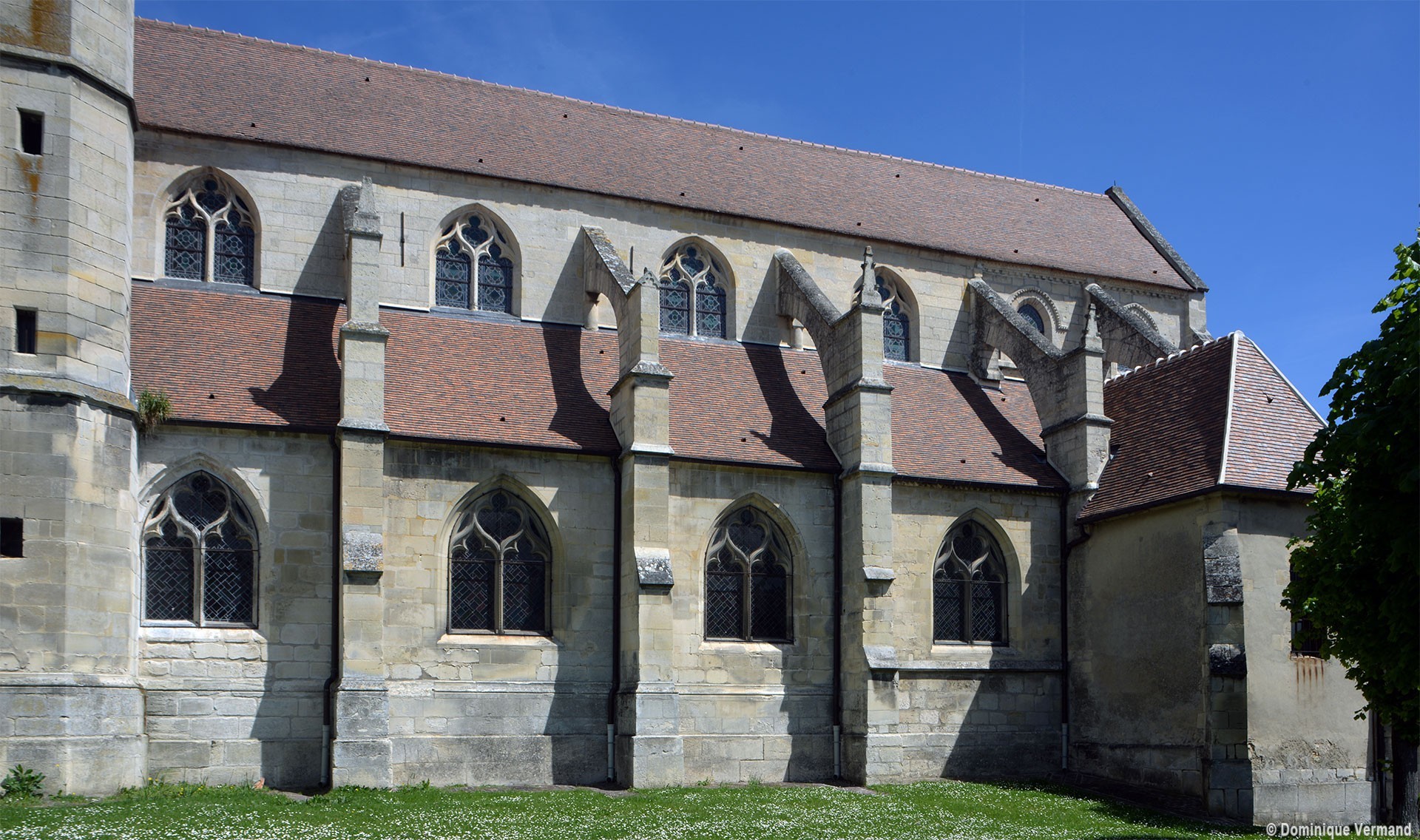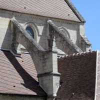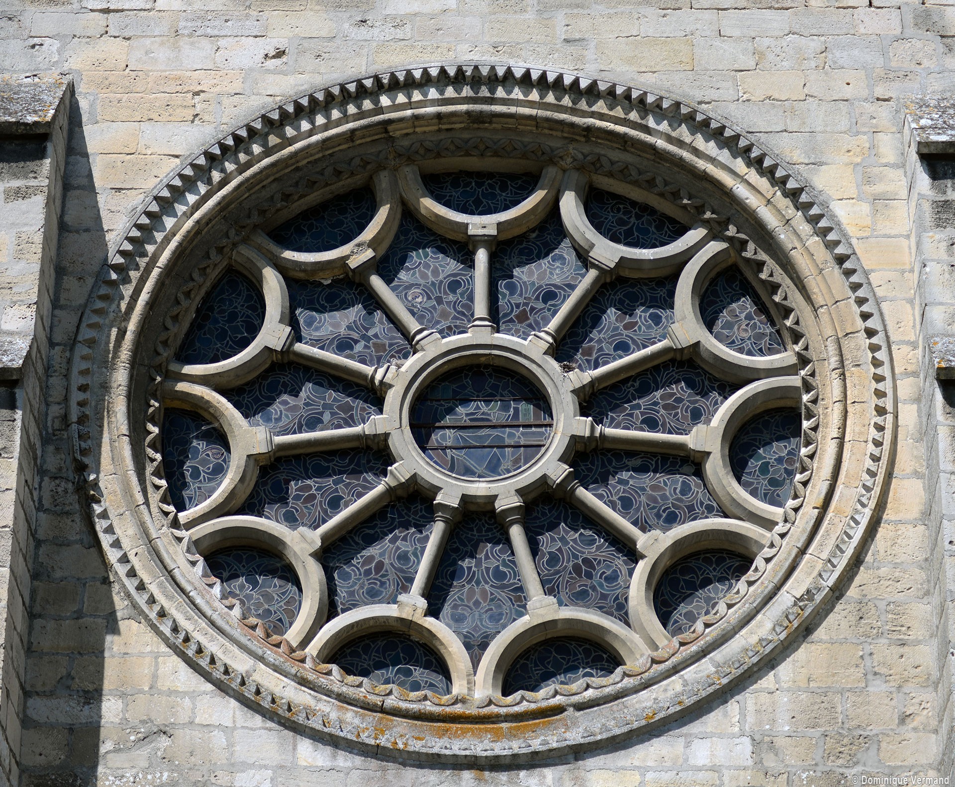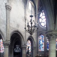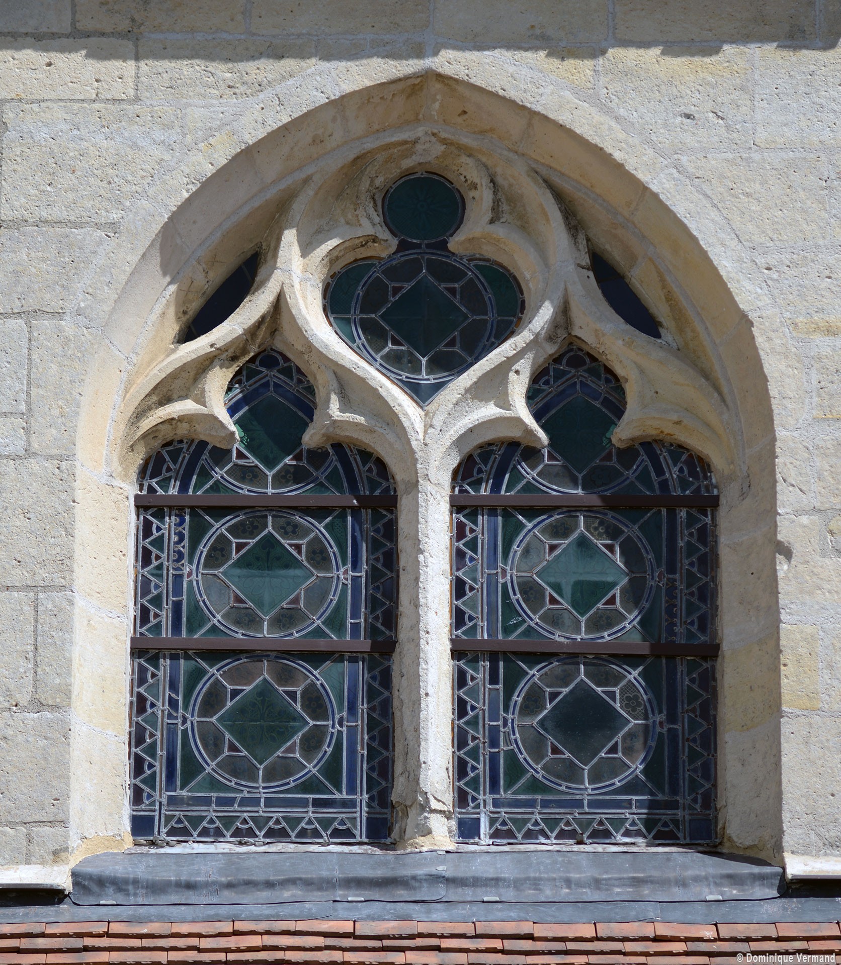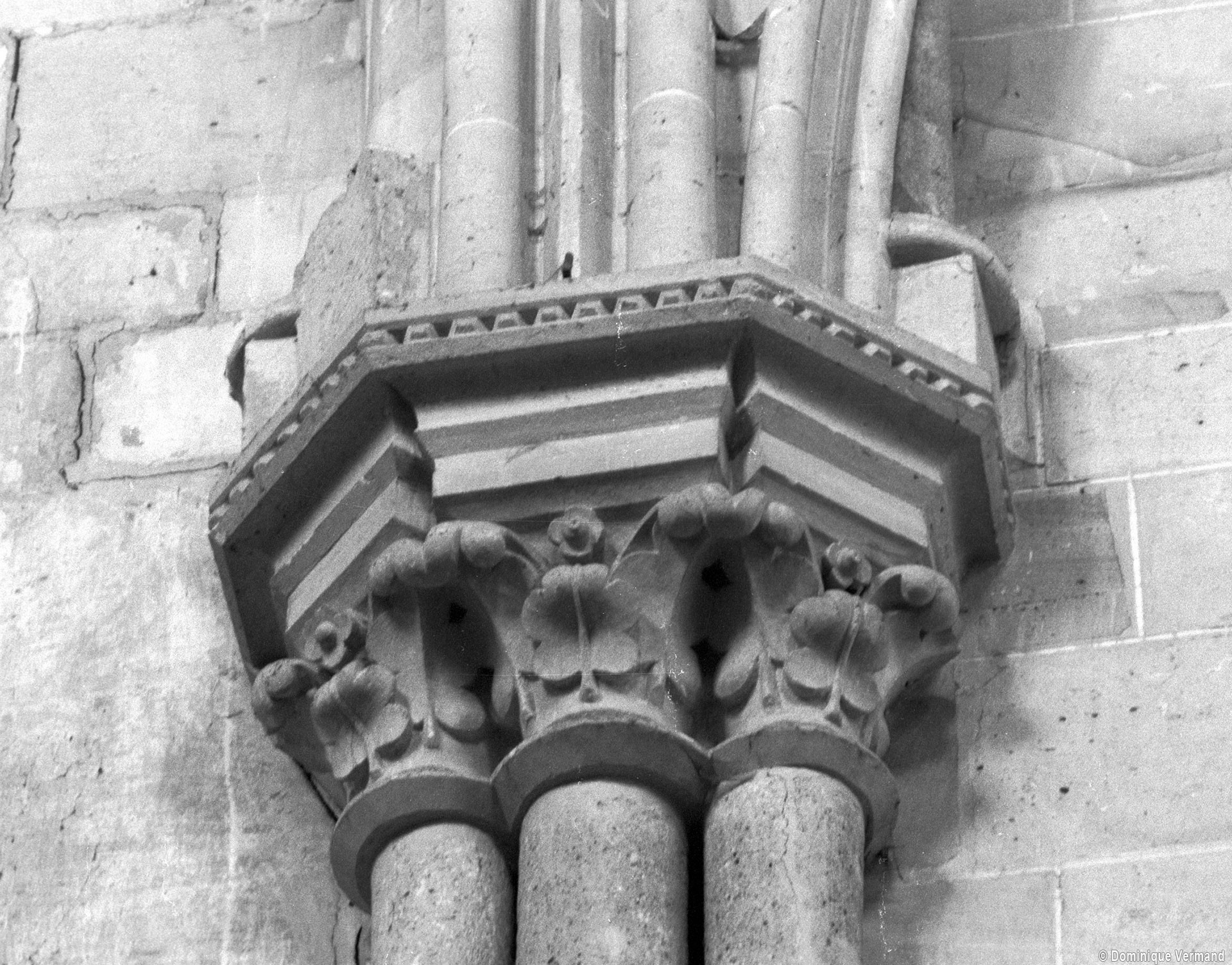Gommé au niveau des piles, l’effet d’alternance engendré par la voûte sexpartite reste cependant perceptible au-dessus où une seule colonnette répond au doubleau intermédiaire de la voûte (temps faible) alors que trois marquent la retombée du doubleau principal et des deux ogives (temps fort). La corbeille circulaire des chapiteaux montre un décor uniforme associant crochets et feuilles découpées inspiré, là encore, du répertoire sculpté de Notre-Dame de Paris. Le chevet plat, à la composition particulièrement bien équilibrée, est percé de cinq fenêtres dont les piédroits sont soulignés par de fines colonnettes en délit. Une grande rose au remplage refait surmonte le triplet de fenêtres correspondant au vaisseau central. Le chœur de Saint-Pierre et Saint-Paul, traité avec un raffinement exceptionnel, se prolongeait vers l’ouest comme le montrent des éléments contemporains encore visibles à la cinquième travée du bas-côté sud. Au nord, et au même niveau, une colonne et un chapiteau du 13e siècle attestent qu’une chapelle avait été ajoutée à cette époque.