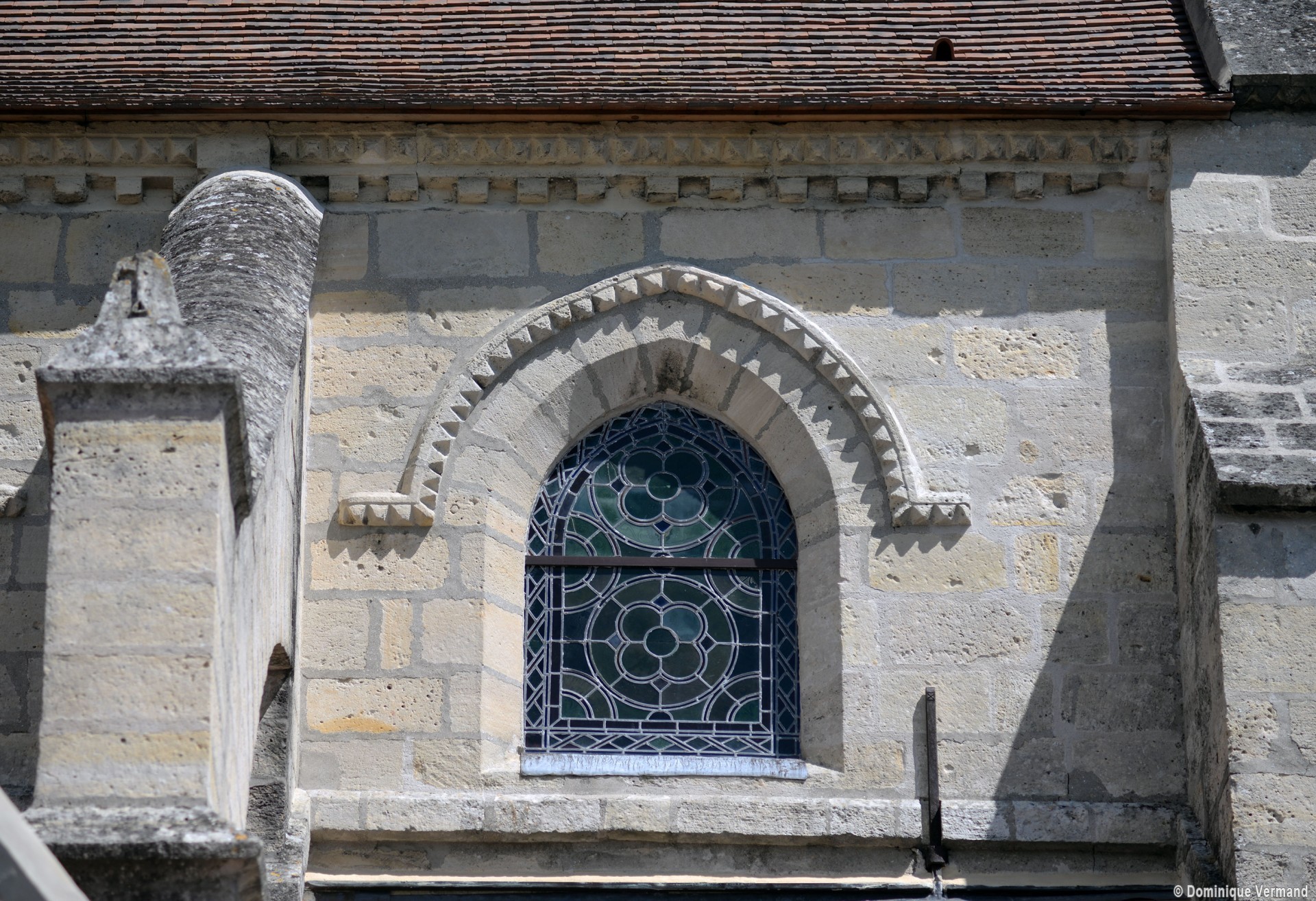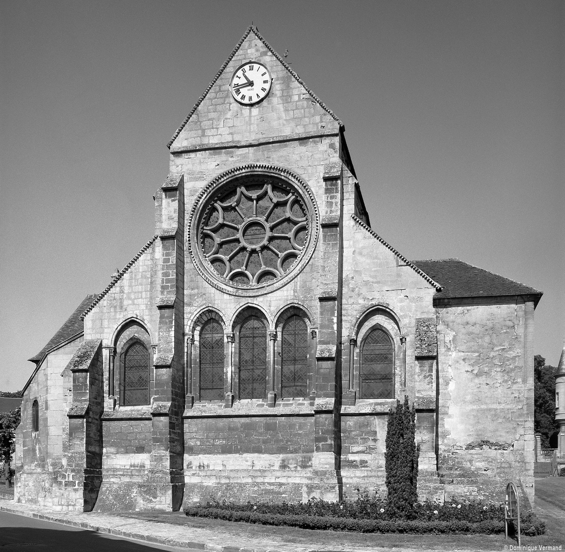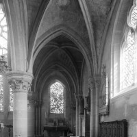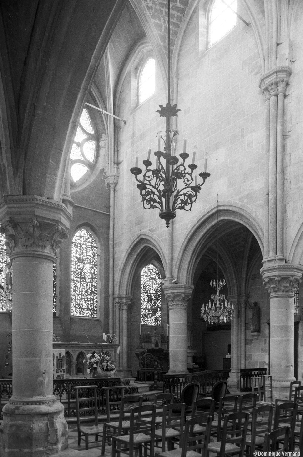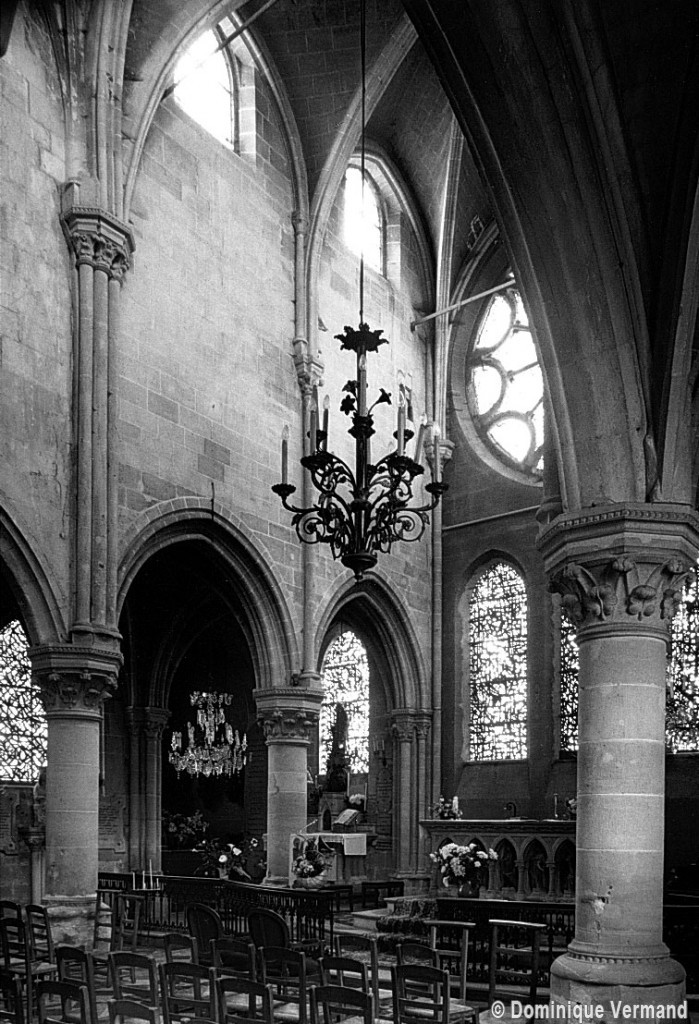 Partie la plus ancienne de l’église, la dernière travée a été bâtie à la fin du 12e siècle. Elle est couverte d’une voûte sexpartite retombant sur des piles circulaires et constitue un bon exemple de l’influence exercée alors autour de Paris par la cathédrale Notre-Dame. Caractérisée par la présence d’une très importante portion de mur nu entre les grandes arcades et les petites fenêtres hautes, littéralement “coincées” sous l’arc formeret, son élévation est, en esprit puisse qu’ici il n’y a pas de tribunes, et toutes proportions gardées, d’un effet très proche de celle que présentait primitivement la cathédrale parisienne.