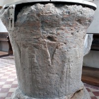 La cuve baptismale a été aménagée dans un gros chapiteau du 12ème siècle, très abîmé, provenant sans doute de l’abbaye de Beaupré (2007).