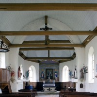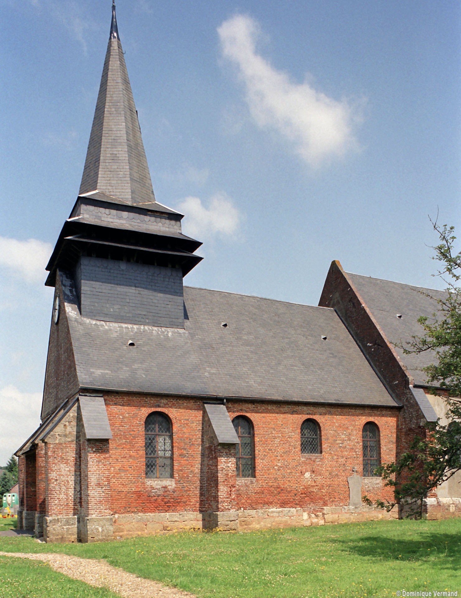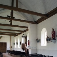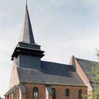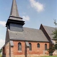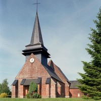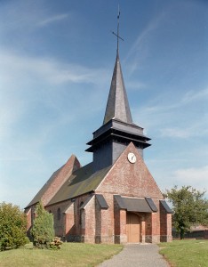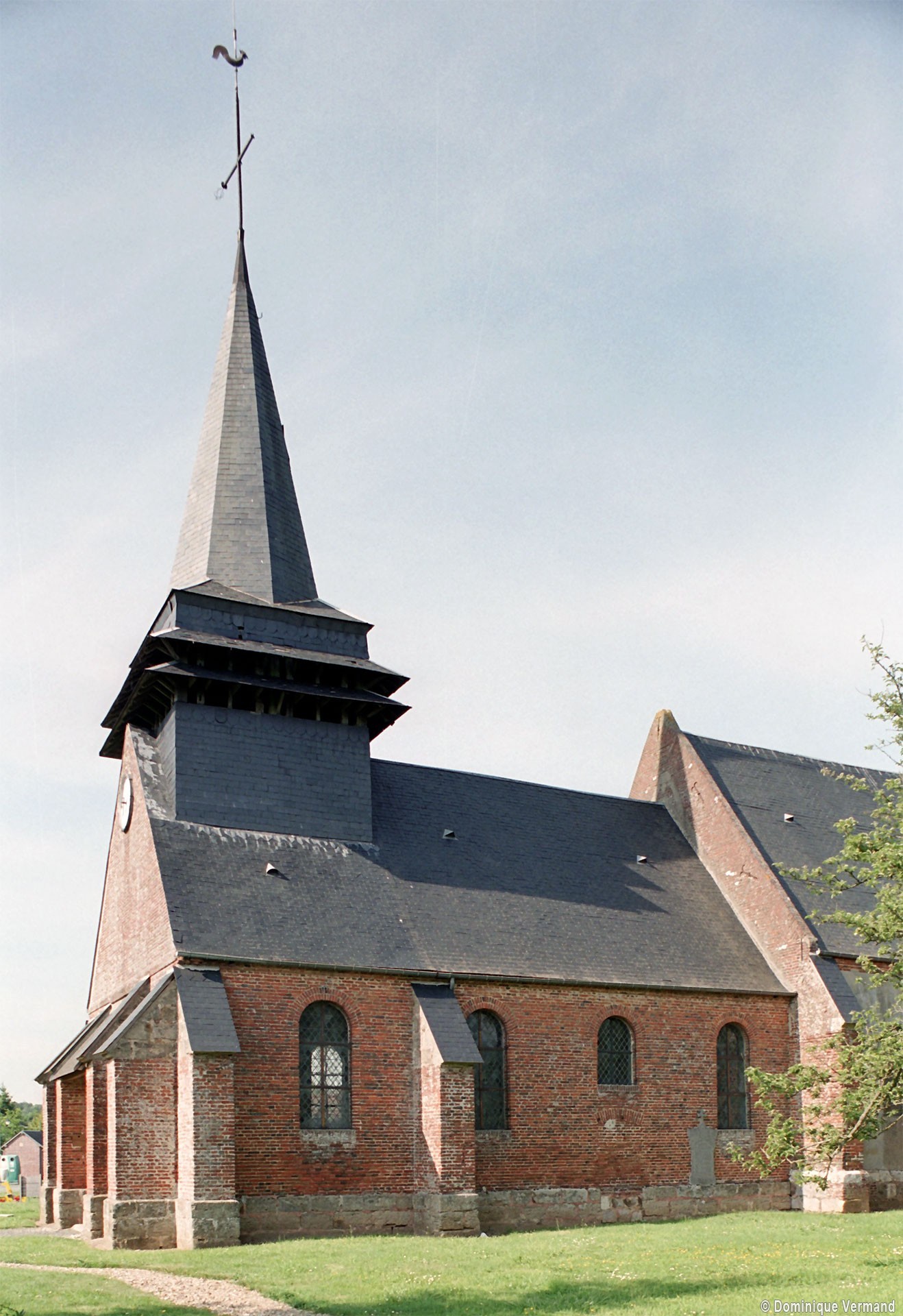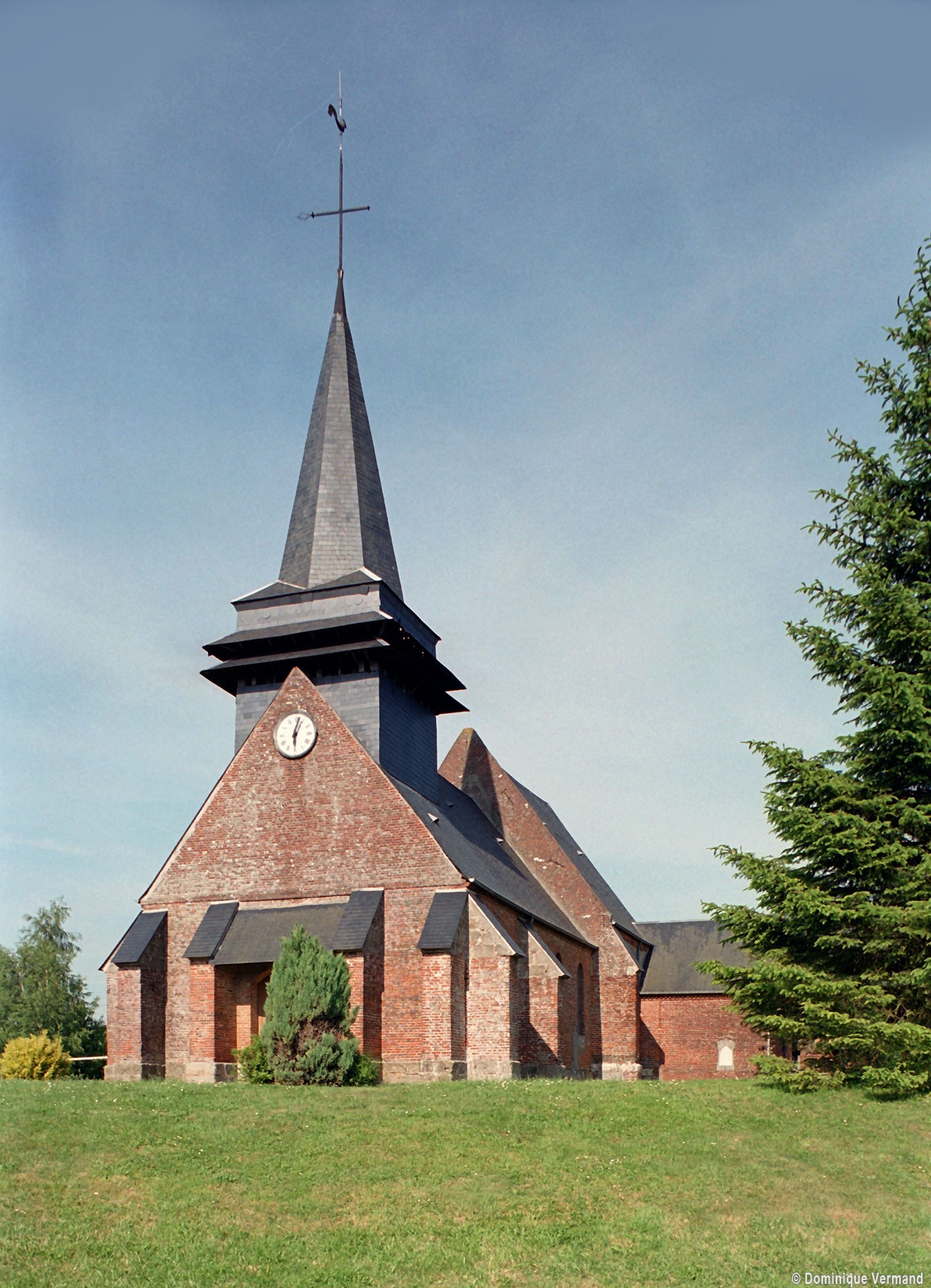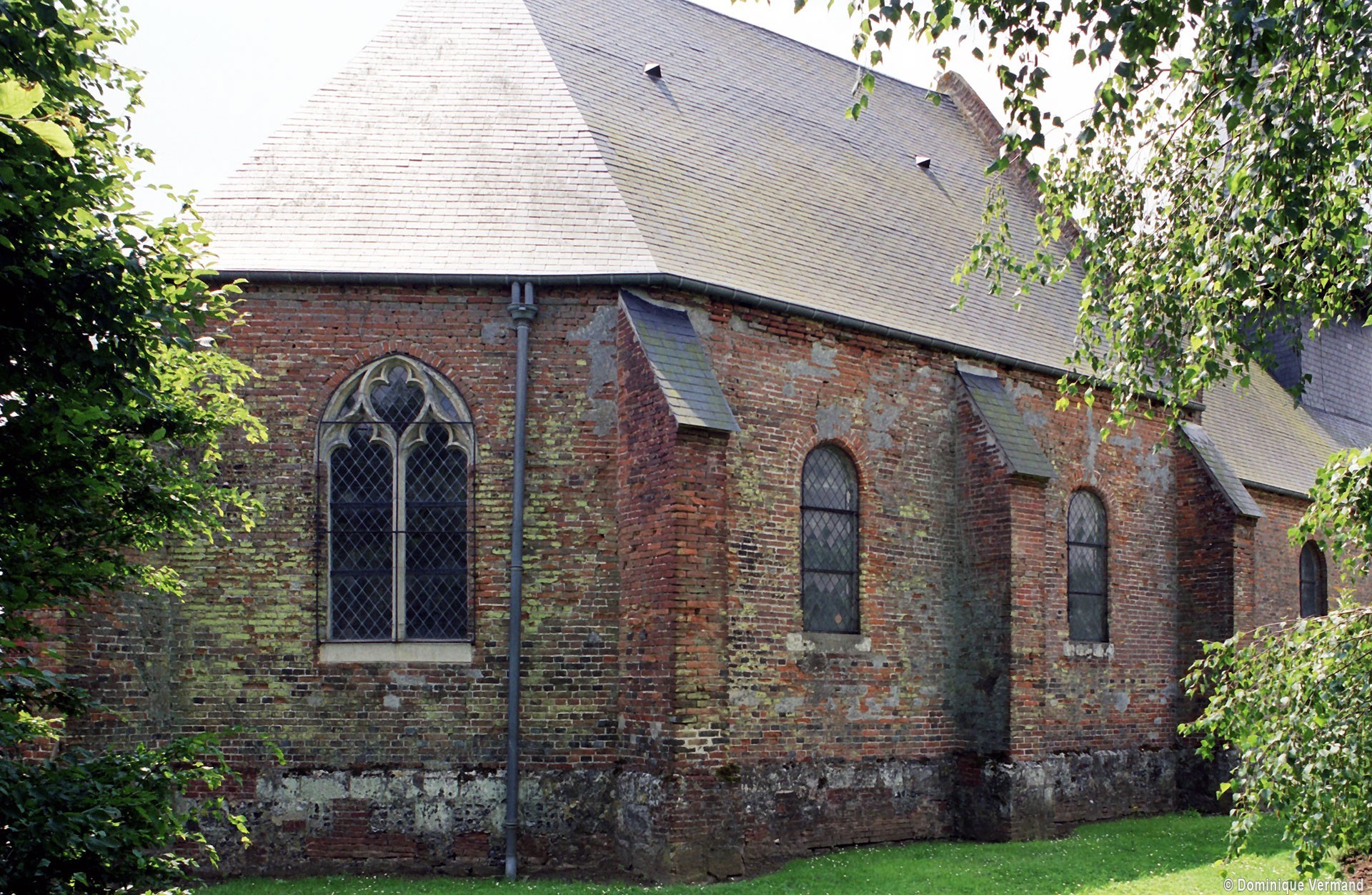 Saint-Nicaise est un petit édifice en briques, de construction soignée, appartenant à deux époques différentes. Le choeur, qui est la partie la plus ancienne, remonte au 16ème siècle. Son plan – une travée droite terminée par une abside à trois pans – est des plus classiques. Son intérêt réside dans la hiérarchisation des fenêtres qui l’ajourent. Si la travée droite se contente de quatre simples ouvertures en plein cintre en briques, l’abside est percée de fenêtres au fin réseau flamboyant, en pierre. L’accent a été mis sur la fenêtre axiale, plus importante que les deux autres. A l’intérieur, la charpente a subi une réfection importante en 1775, comme le précise une inscription, mais les sablières avec deux blochets sculptés de têtes sont d’origine.