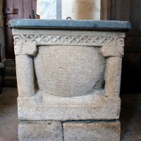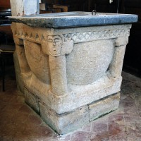 L’édifice conserve une remarquable cuve baptismale en pierre d’époque romane avec un décor d’étoiles et, aux angles, de masques humains surmontant des colonnettes. On y remarque également un panneau peint représentant la Vierge, daté de 1638, et plusieurs statues d’art populaire : saint Jean Baptiste, Vierge à l’Enfant, Christ en Croix… (2005).
