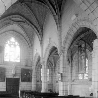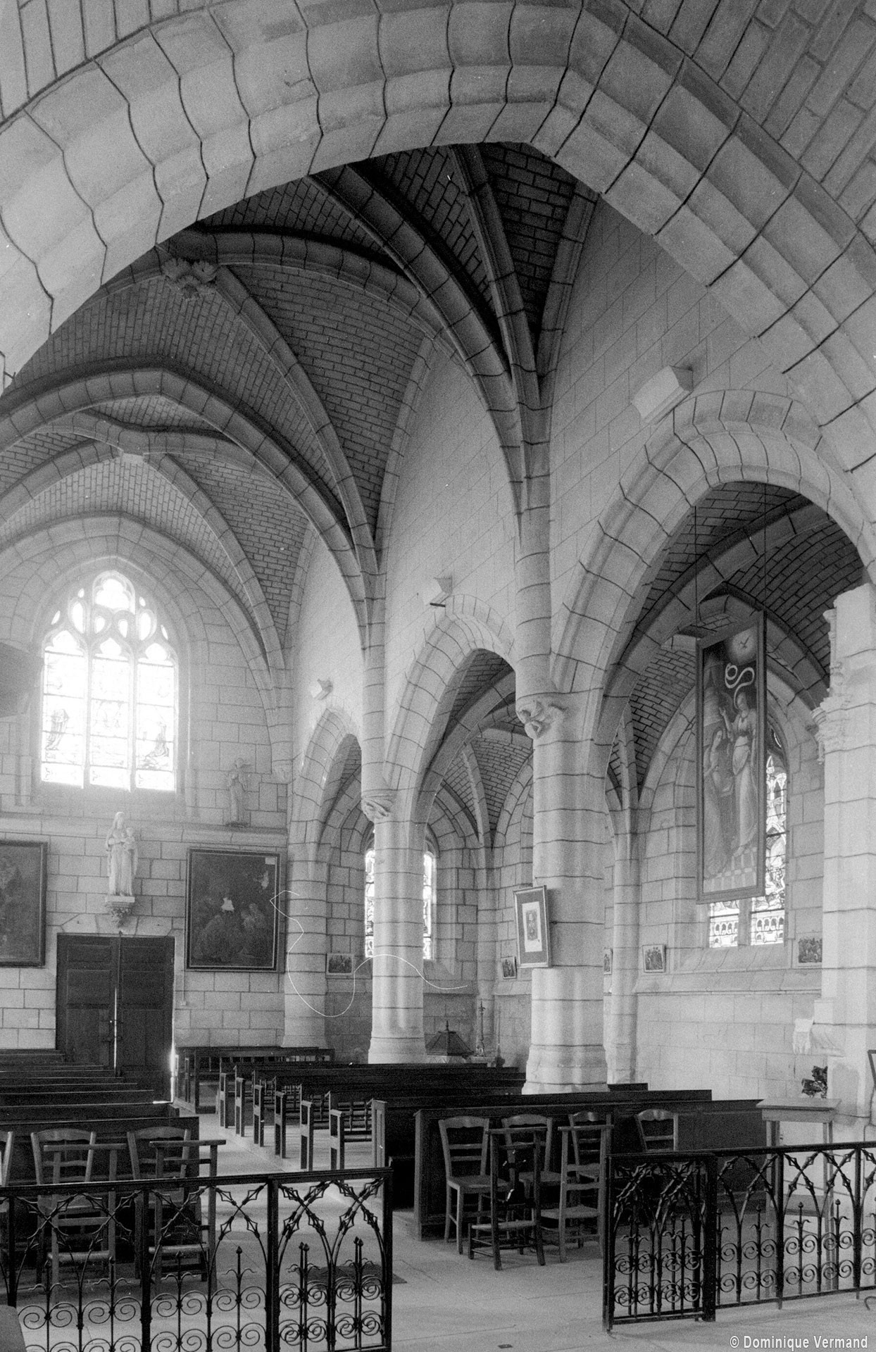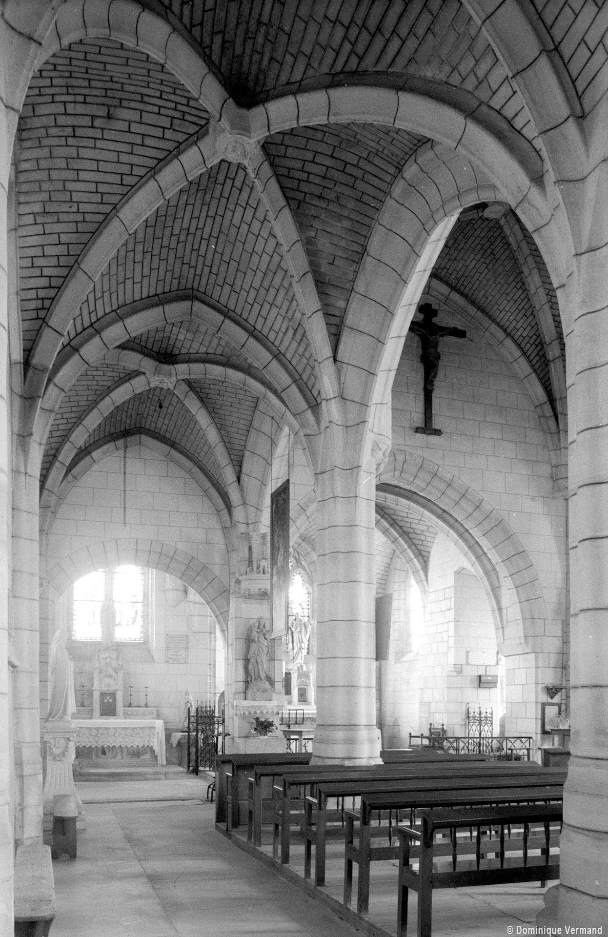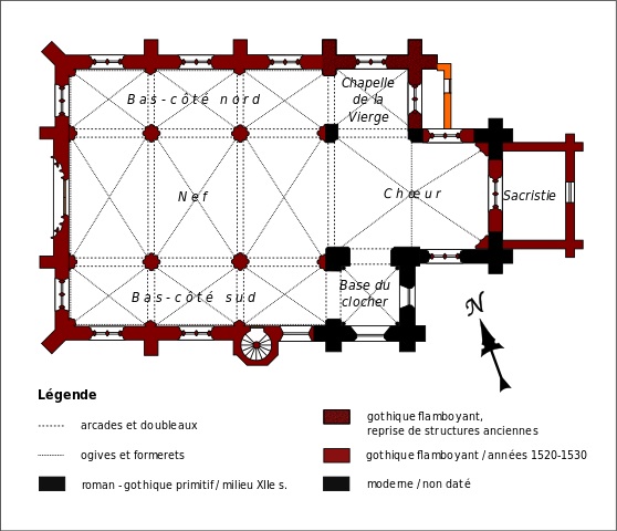 Le reste de l’église a été reconstruit au 16ème siècle et comprend une nef de trois travées avec bas-côtés et un chœur à chevet plat. La travée du clocher prolonge le bas-côté sud et une chapelle celui du nord. Comme souvent au 16ème siècle, la nef est aveugle et ne prend sa lumière que par les fenêtres des bas-côtés. La retombée des voûtes se fait sur des culs-de-lampe ornés disposés à la naissance des arcades. C’est une disposition originale qui permet aux piles de rester minces et d’associer ainsi plus étroitement les bas-côtés au vaisseau central. Le chœur est couvert d’une voûte sexpartite, c’est-à-dire à six voûtains. L’ensemble est malheureusement altéré par une restauration trop radicale et sèche effectuée entre 1891 et 1906.