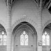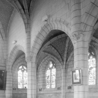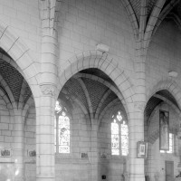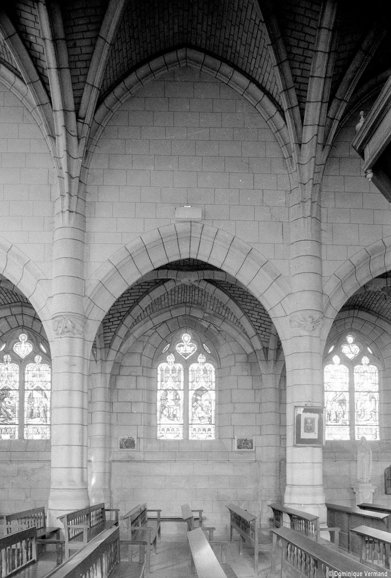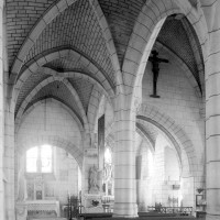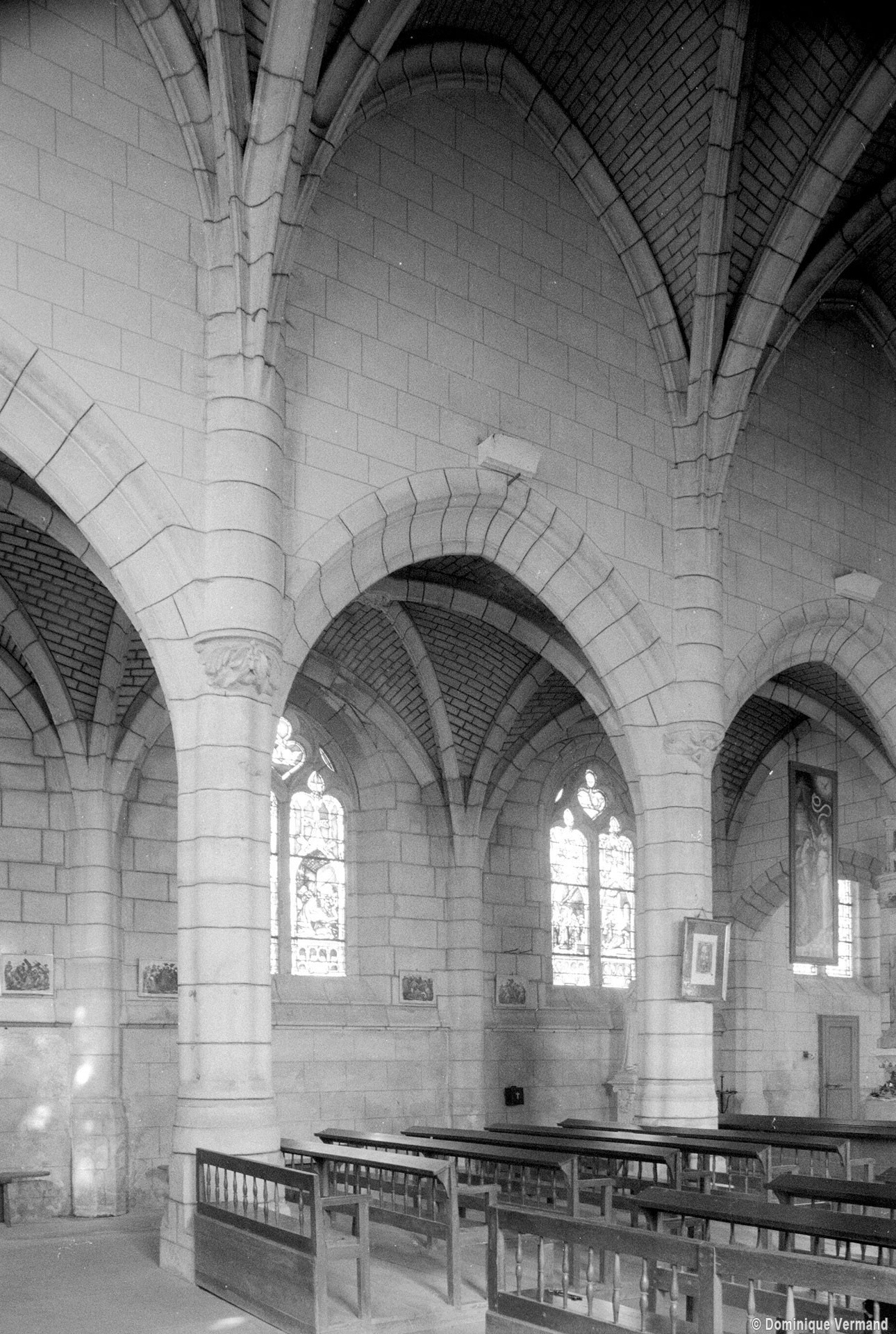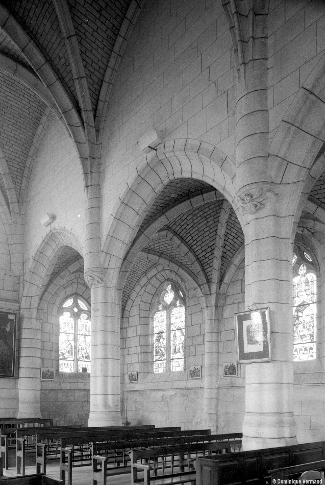 Le reste de l’église a été reconstruit au 16ème siècle et comprend une nef de trois travées avec bas-côtés et un chœur à chevet plat. La travée du clocher prolonge le bas-côté sud et une chapelle celui du nord. Comme souvent au 16ème siècle, la nef est aveugle et ne prend sa lumière que par les fenêtres des bas-côtés. La retombée des voûtes se fait sur des culs-de-lampe ornés disposés à la naissance des arcades. C’est une disposition originale qui permet aux piles de rester minces et d’associer ainsi plus étroitement les bas-côtés au vaisseau central. Le chœur est couvert d’une voûte sexpartite, c’est-à-dire à six voûtains. L’ensemble est malheureusement altéré par une restauration trop radicale et sèche effectuée entre 1891 et 1906.