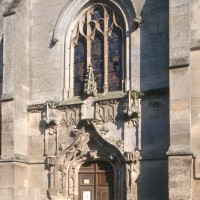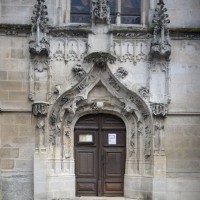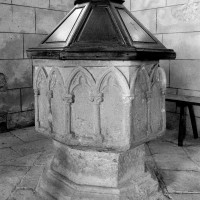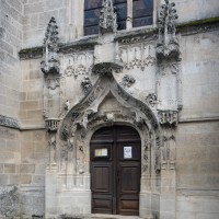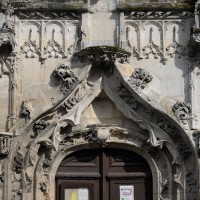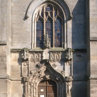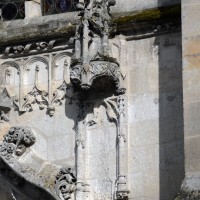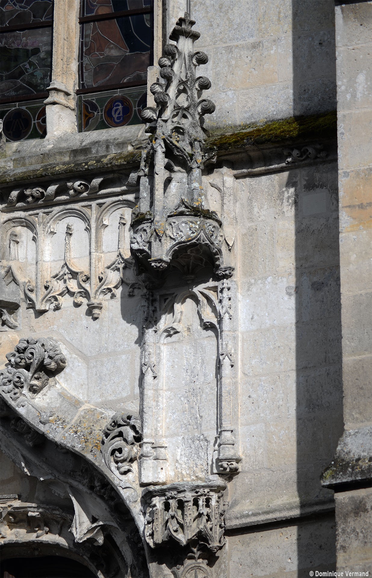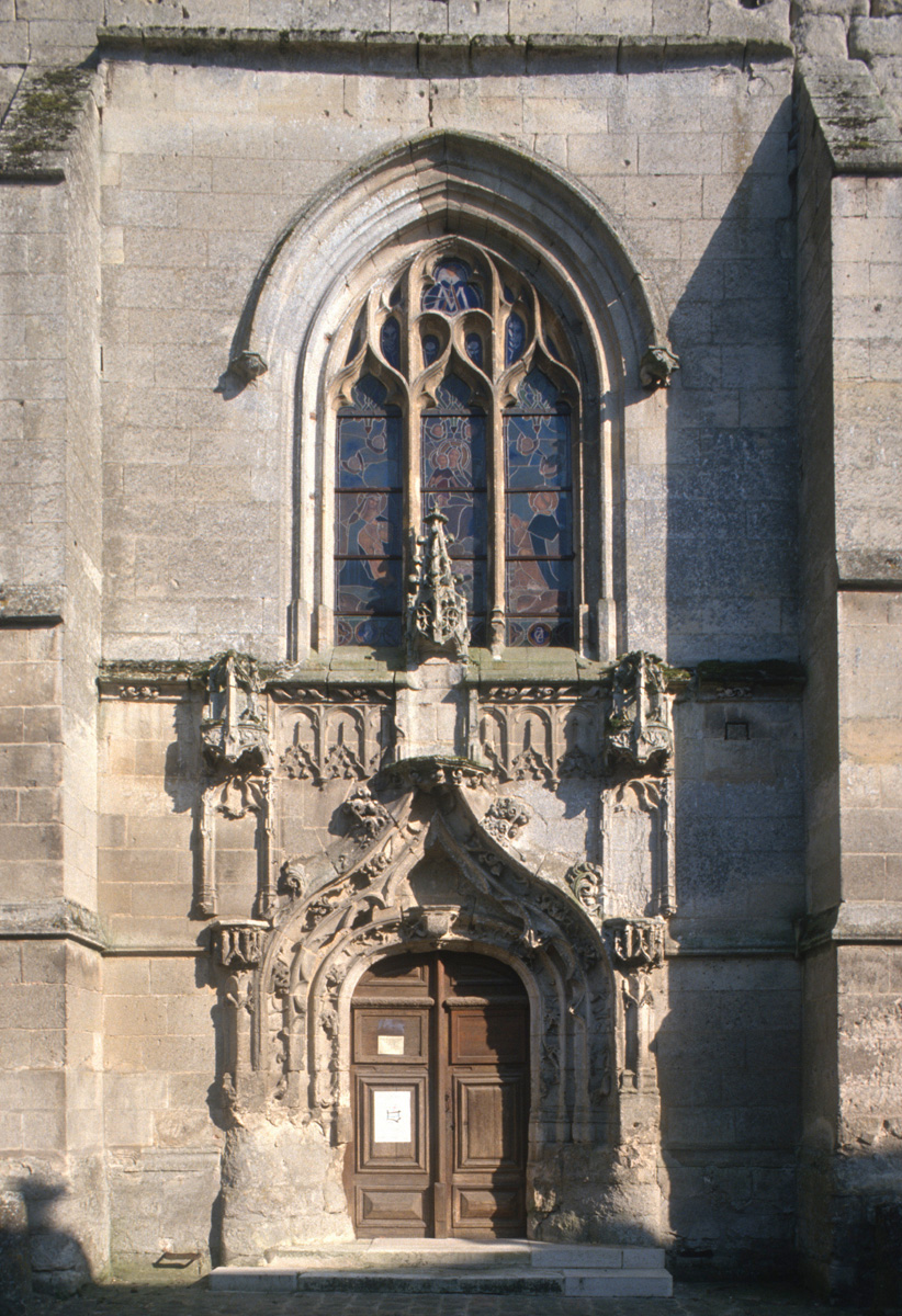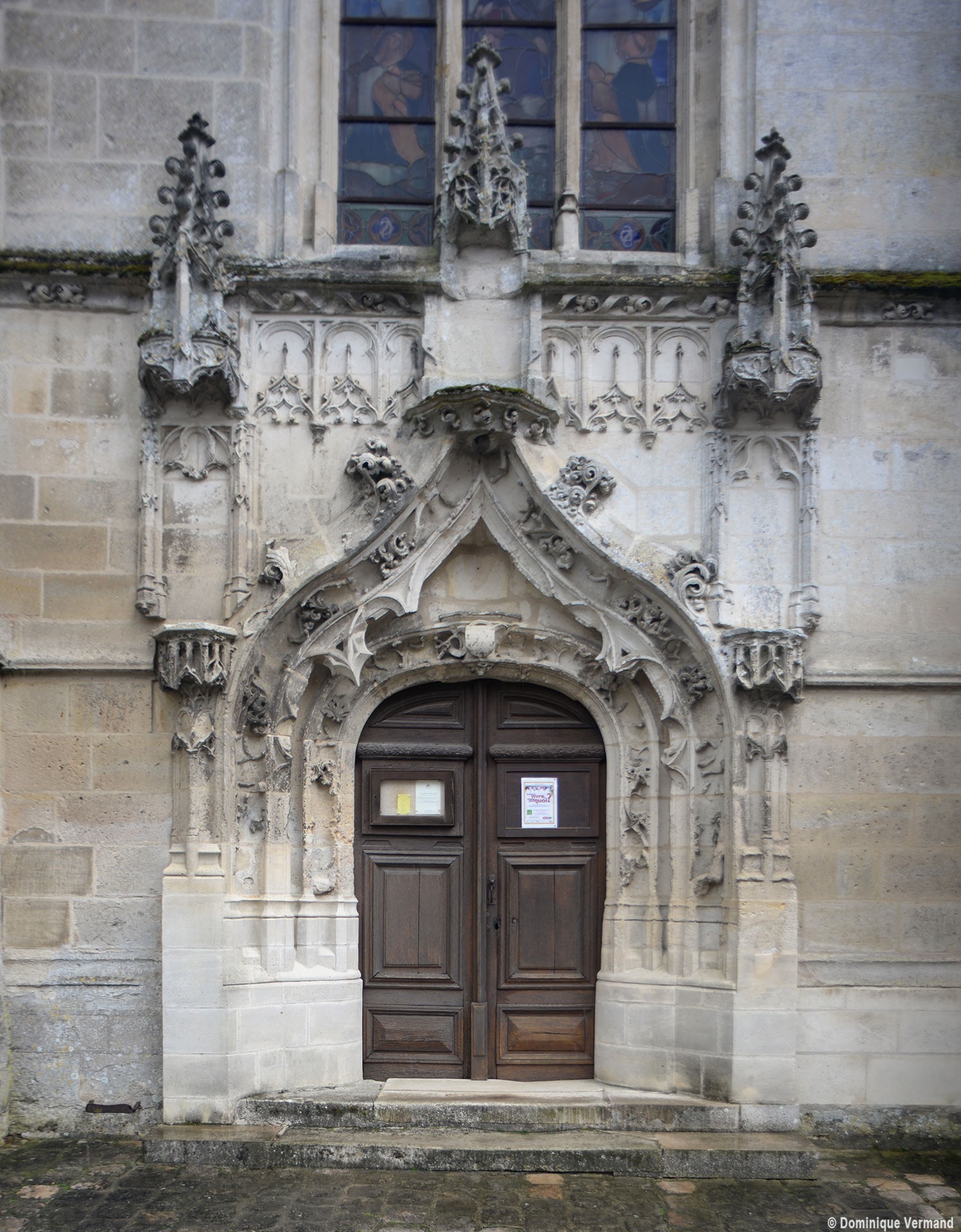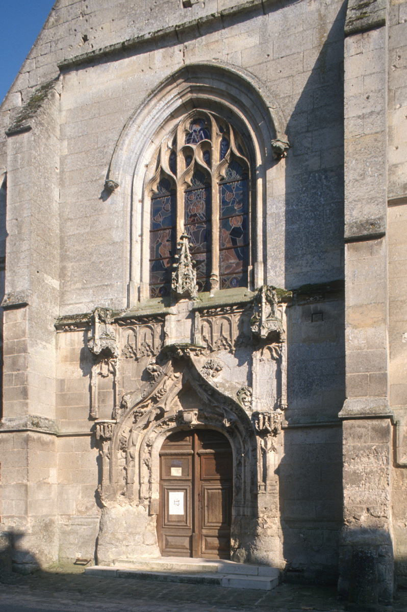 En façade, le portail en anse de panier est couronné d’un gâble s’achevant en niche, elle-même surmontée d’un pinacle. Deux autres niches, également avec pinacle, l’encadrent. Dégradé et privé de ses statues, il reste néanmoins un bon exemple de style gothique flamboyant. L’église a par ailleurs conservé d’intéressants fonts baptismaux du 13ème siècle (1994, modifié 2016).