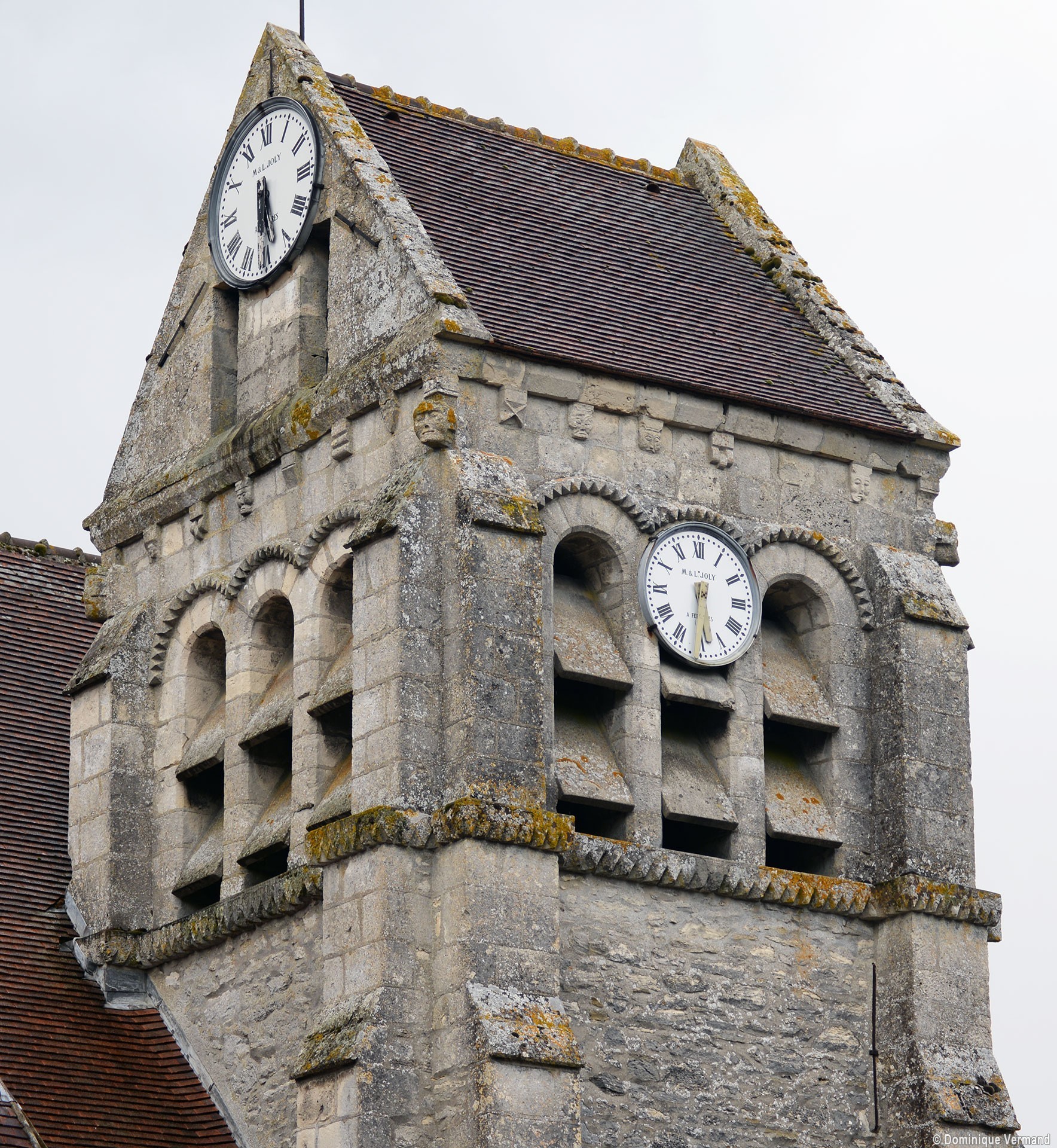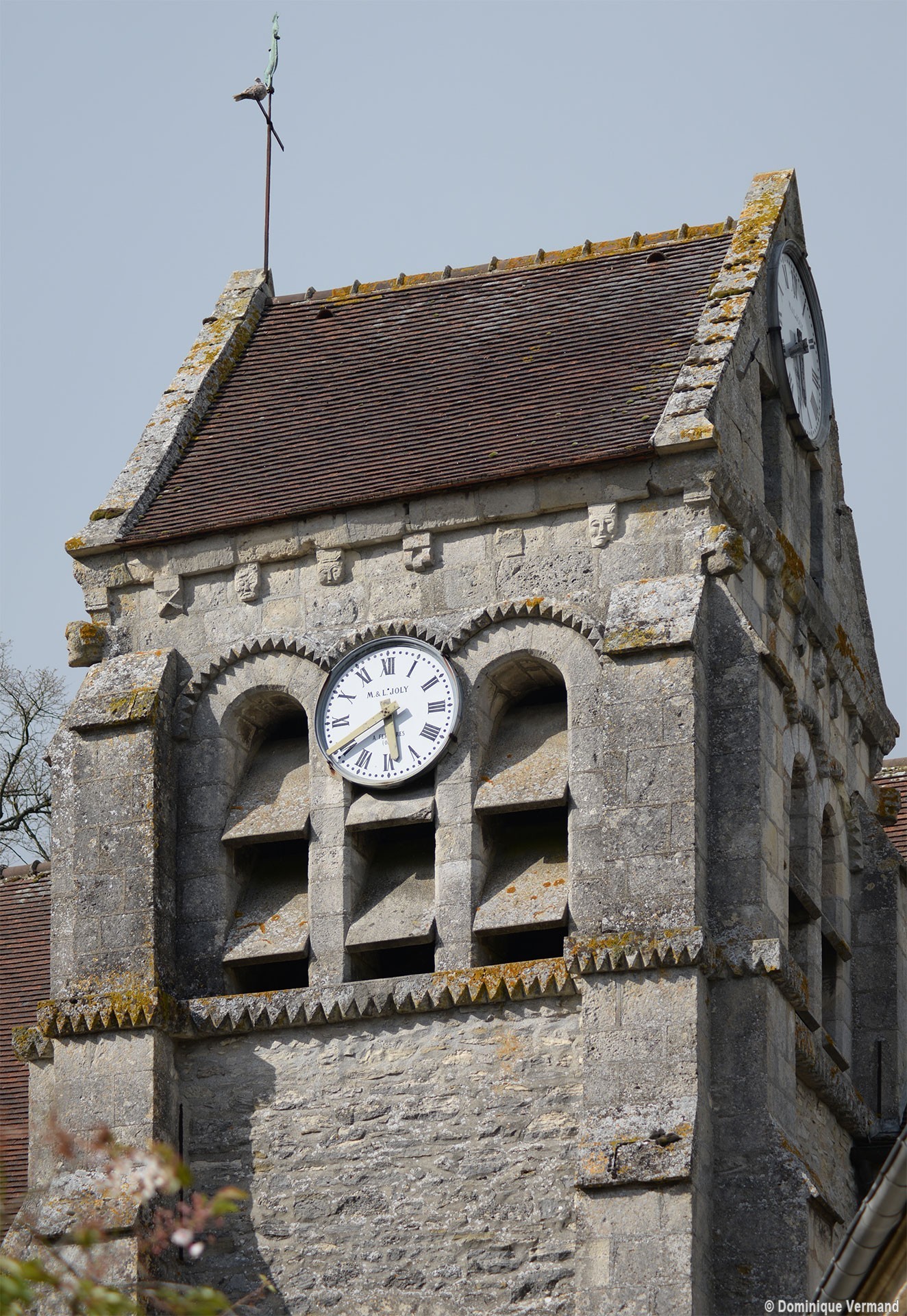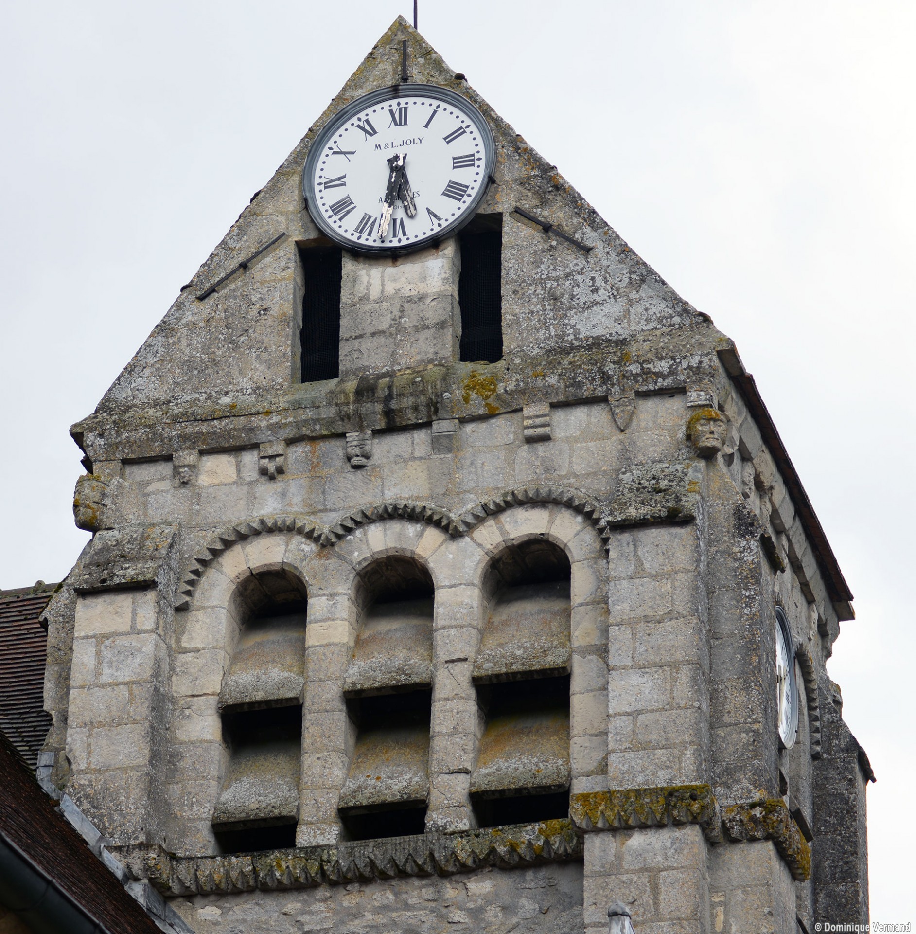 D’un édifice bâti au milieu du 12ème siècle reste le clocher roman. C’est une construction austère qui tranche avec la richesse décorative de nombreux clochers de la région, à commencer par celui tout proche de Rully. Il n’est ajouré que d’un seul étage de baies, disposées par trois sur chaque face. Sans colonnettes, elles ne s’ornent que d’un cordon de pointes de diamant soulignant les archivoltes. Un cordon semblable en marque la base. Une corniche à modillons et un toit en bâtière terminent l’ensemble. A l’intérieur, la voûte d’ogives associée à ce clocher ne permet pas de dater celui-ci avant le milieu du 12ème siècle.