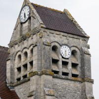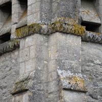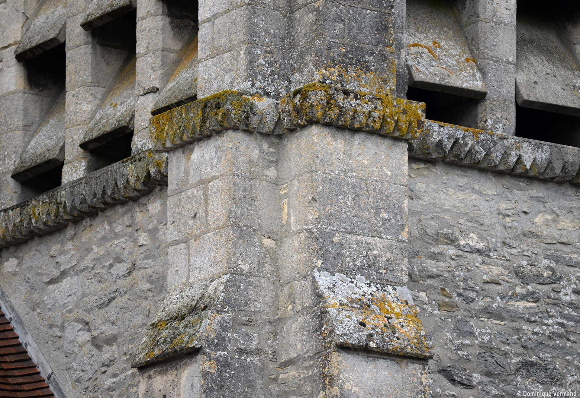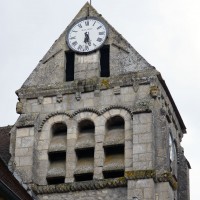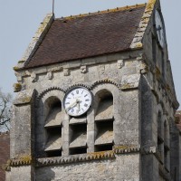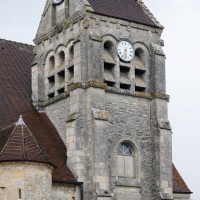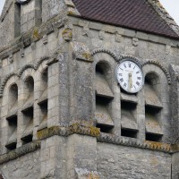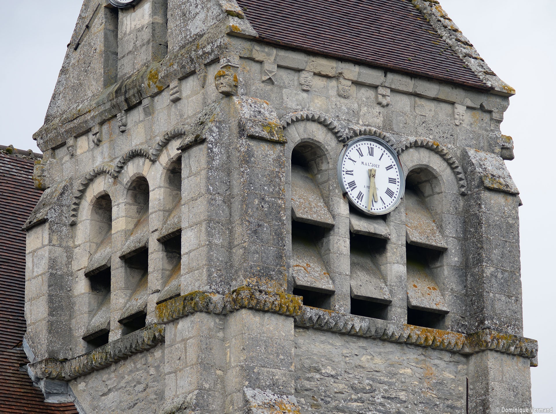 D’un édifice bâti au milieu du 12ème siècle reste le clocher roman. C’est une construction austère qui tranche avec la richesse décorative de nombreux clochers de la région, à commencer par celui tout proche de Rully. Il n’est ajouré que d’un seul étage de baies, disposées par trois sur chaque face. Sans colonnettes, elles ne s’ornent que d’un cordon de pointes de diamant soulignant les archivoltes. Un cordon semblable en marque la base. Une corniche à modillons et un toit en bâtière terminent l’ensemble. A l’intérieur, la voûte d’ogives associée à ce clocher ne permet pas de dater celui-ci avant le milieu du 12ème siècle.