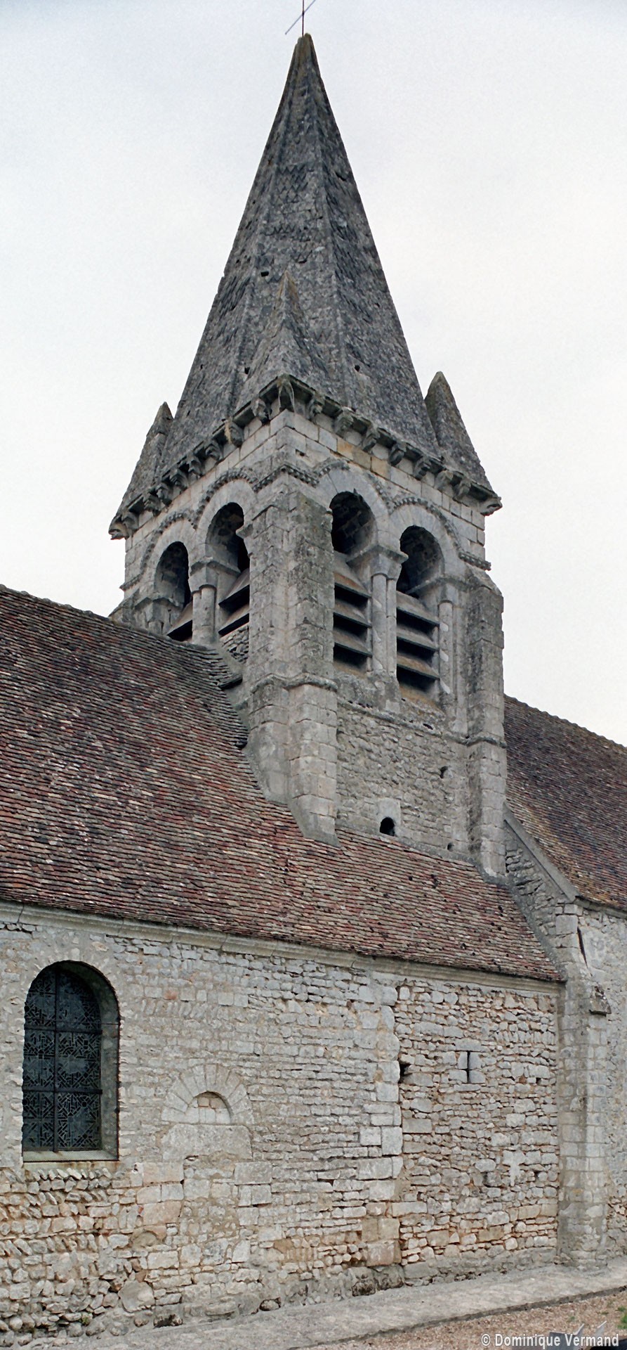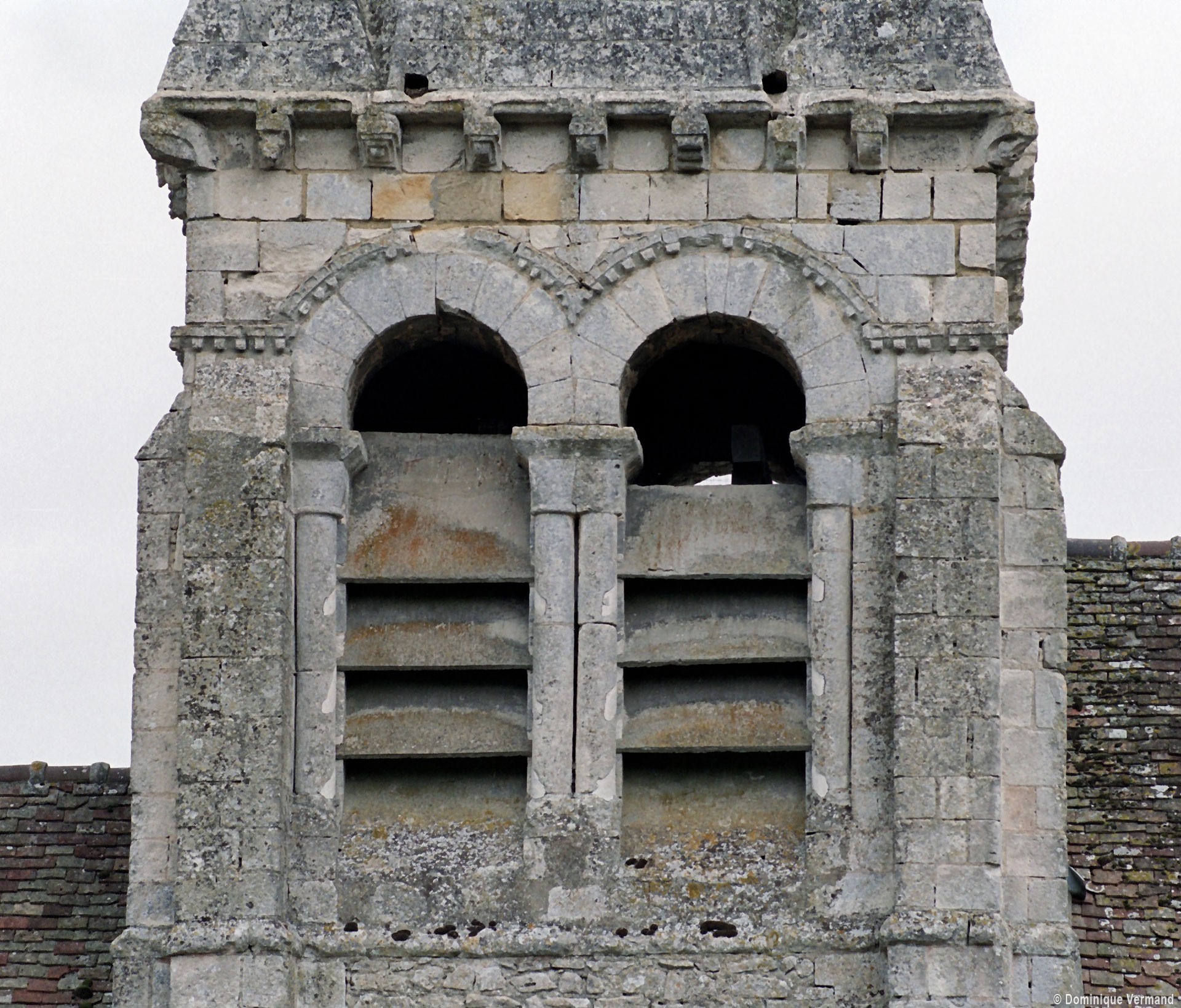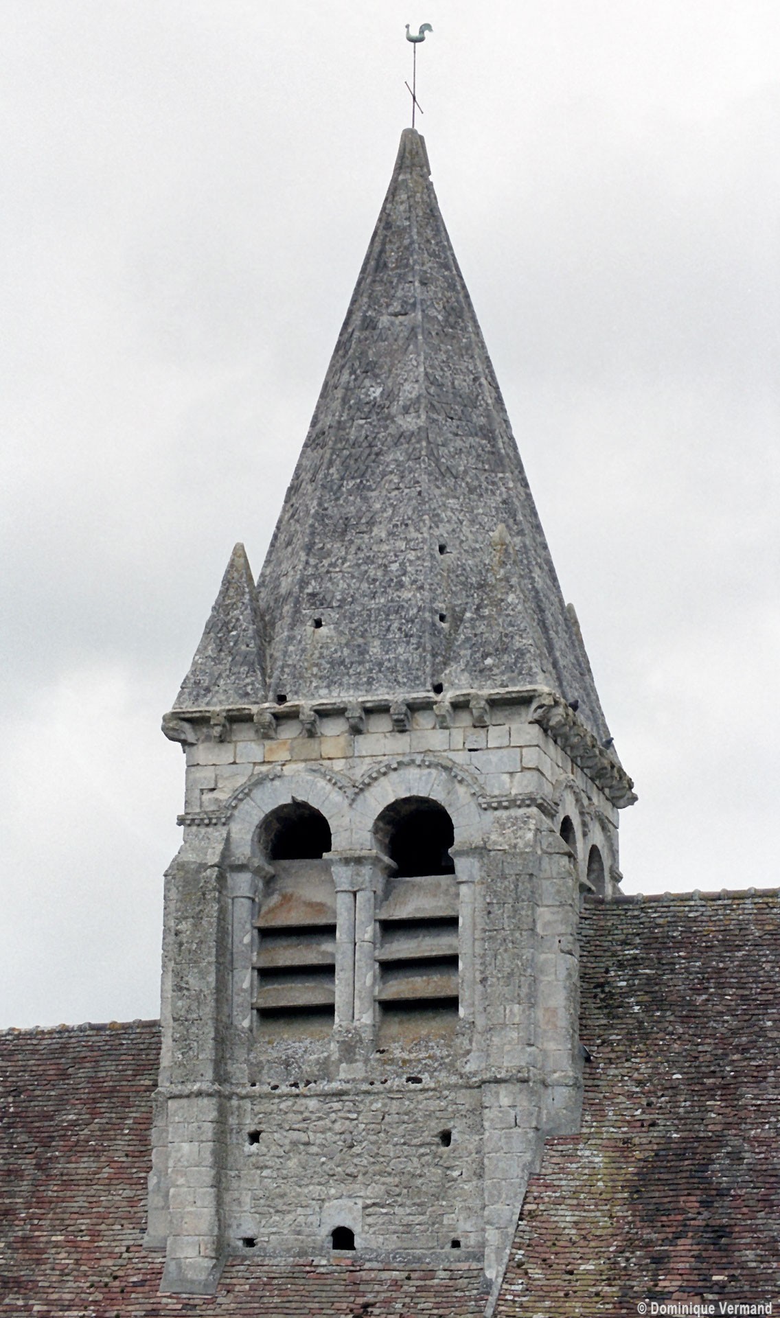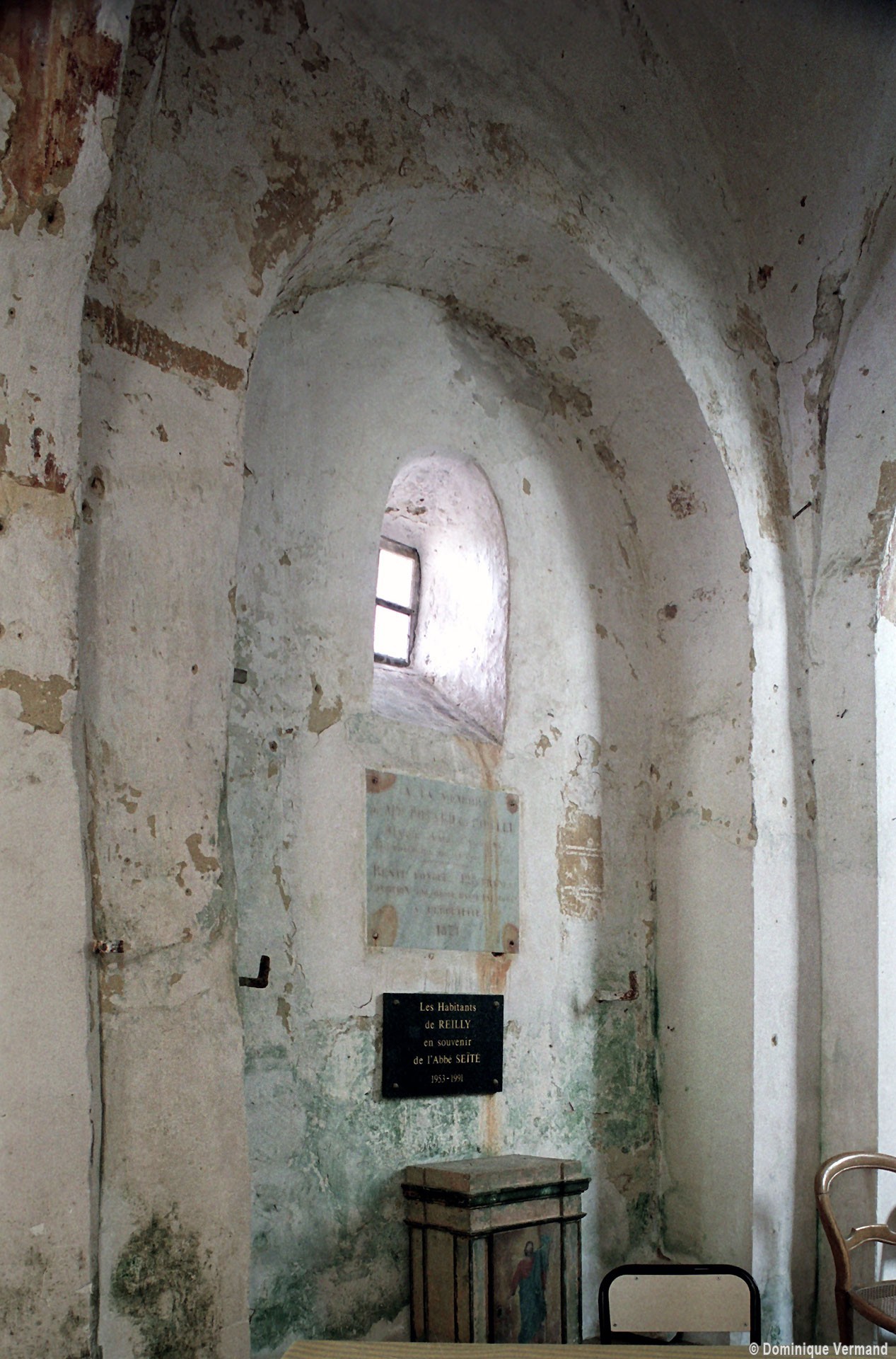 La partie la plus remarquable de l’église est le clocher, dont la base a conservé sa disposition d’origine constituée de quatre arcs en plein cintre surmontés par une voûte d’arêtes. L’étage du beffroi est ajouré par deux baies géminées en plein cintre sur chaque face. Des colonnettes habillent les piédroits et des billettes soulignent les archivoltes. La corniche aux modillons décorés de moulures, de têtes d’animaux et de masques sert d’assise à la haute flèche octogonale en pierre. Aux angles, quatre petites pyramides facilitent visuellement la transition entre le plan carré de la tour et celui, octogonal, de la flèche. Edifiée au début du 12ème siècle, la flèche de Reilly doit être considérée, avec celle de Saint-Vaast-de-Longmont, comme le plus ancien exemple conservé dans la région d’un type de couronnement qui connaîtra un vif succès durant tout le Moyen Age (2003).