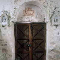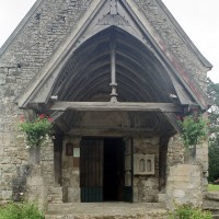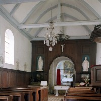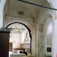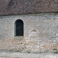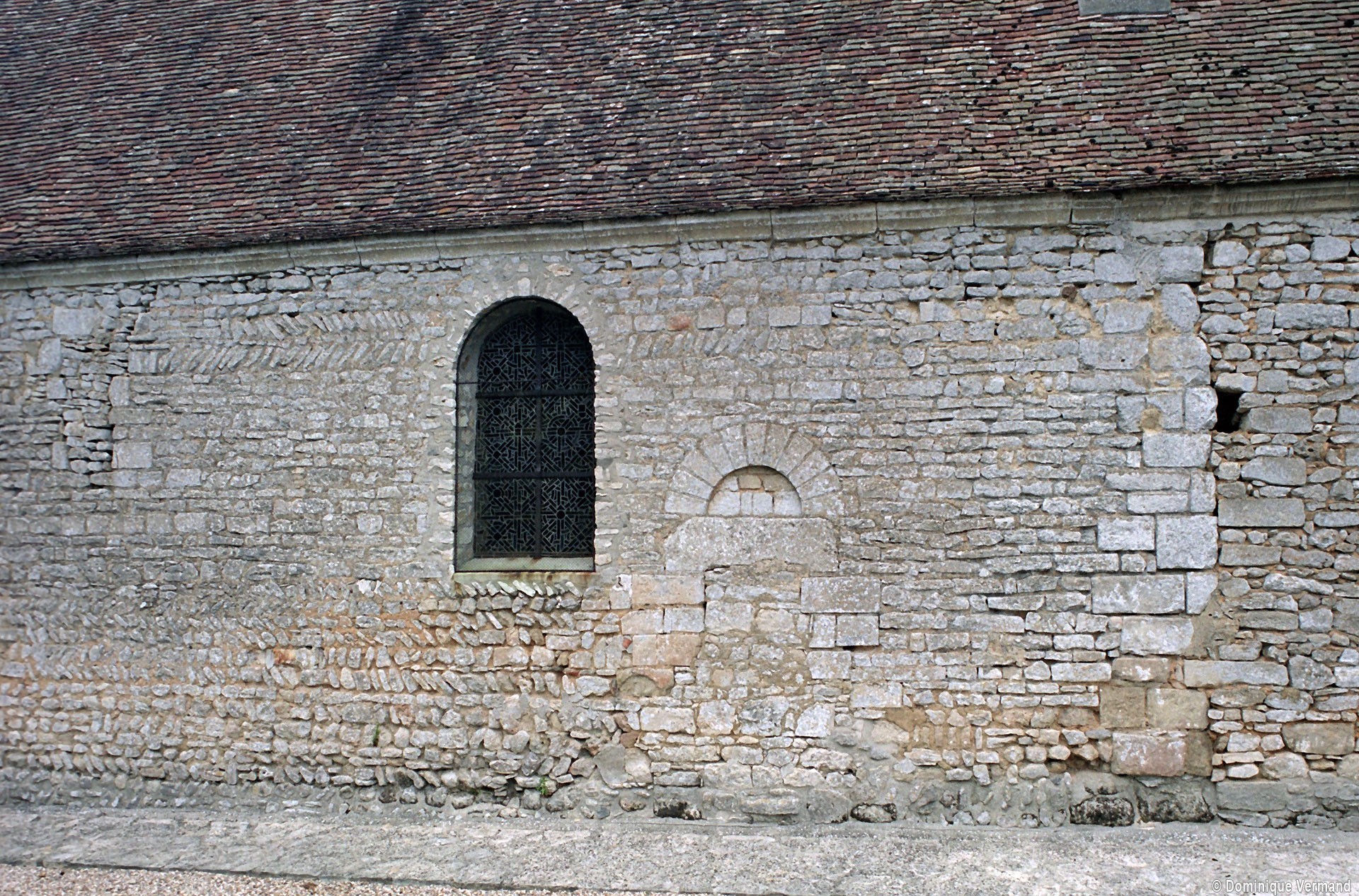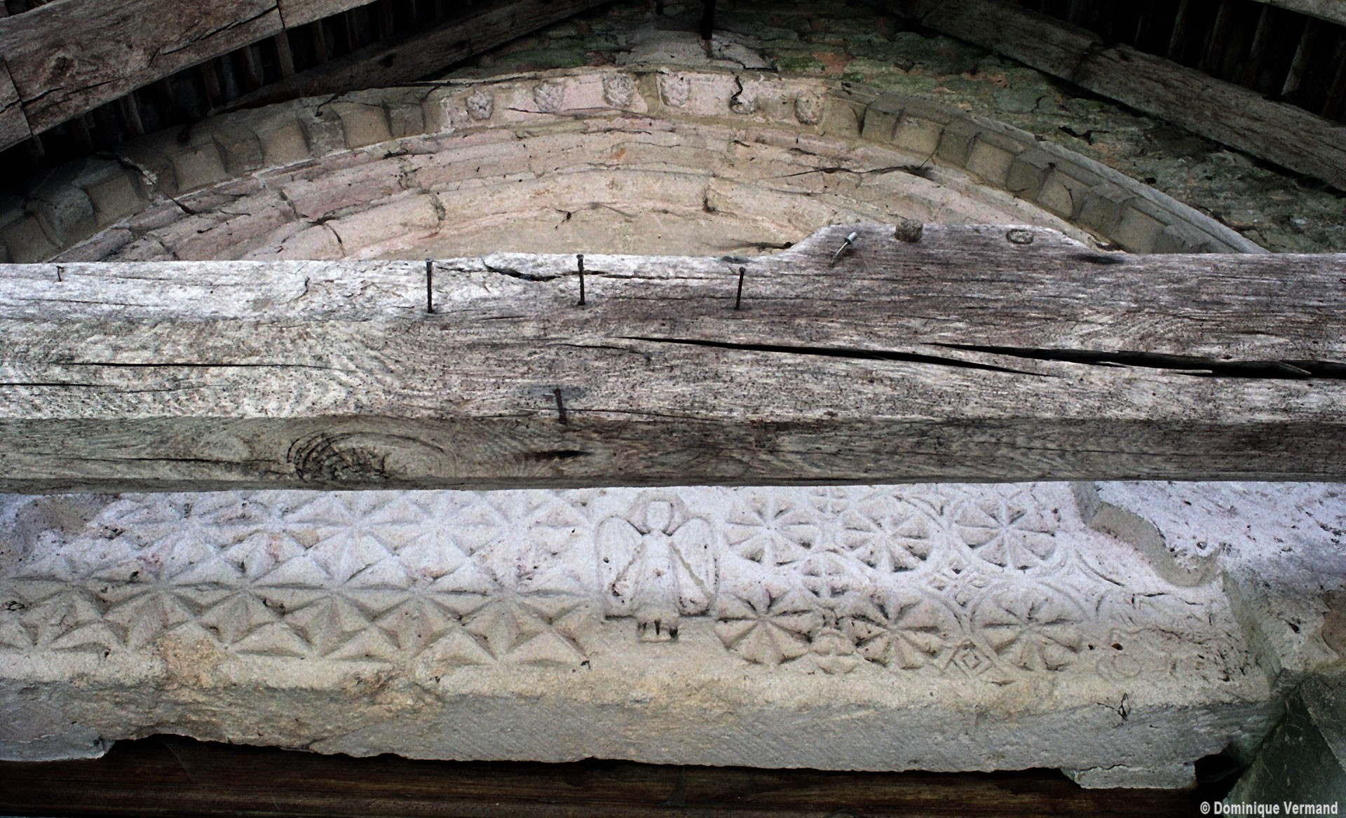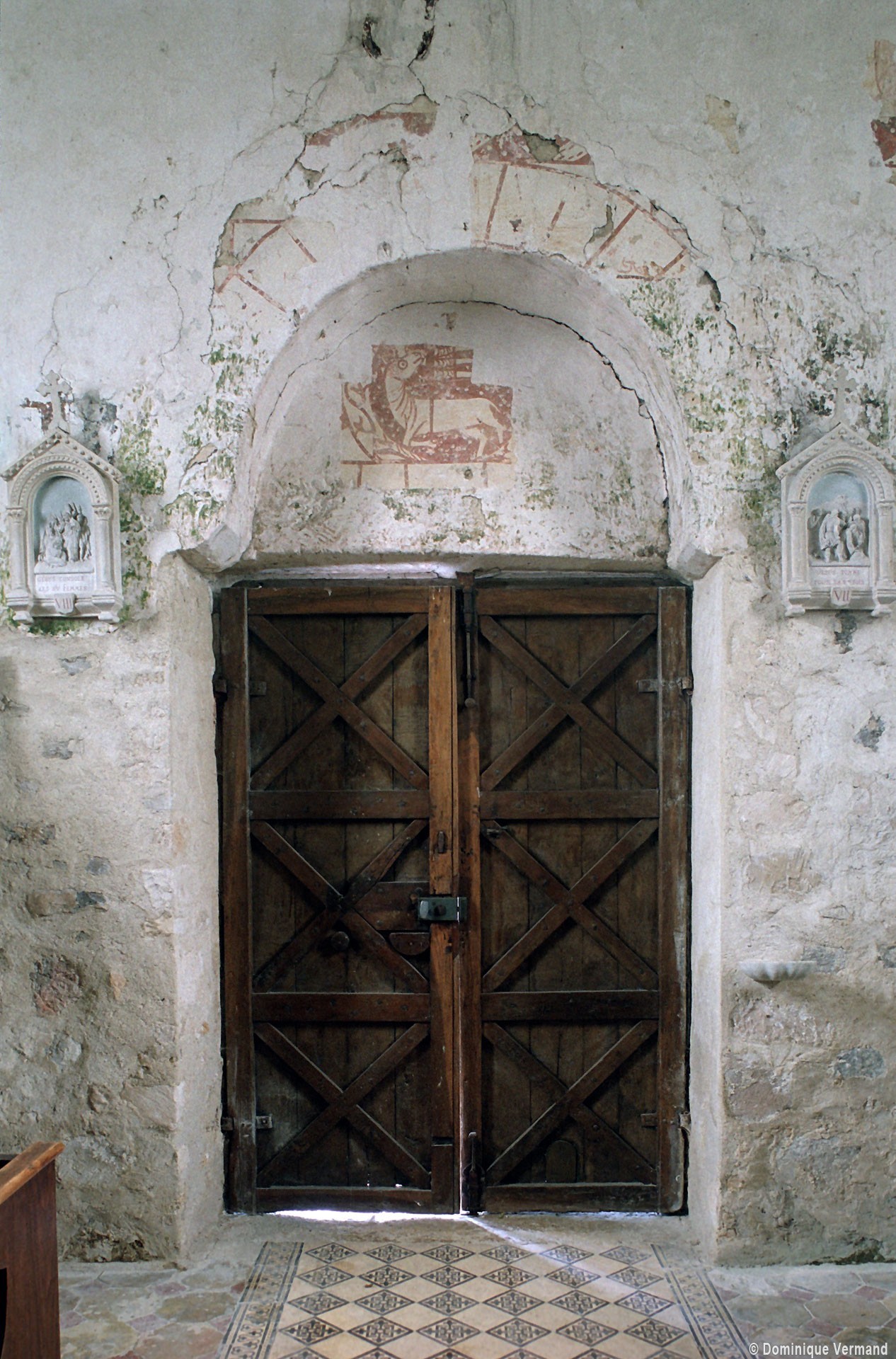 Au sud, la nef a gardé, bien visibles, son appareil en arêtes de poisson et une porte (bouchée) avec arc de décharge en plein cintre. En façade, un petit porche à charpente en carène, du 16ème siècle, masque malheureusement le portail, dont le linteau est décoré d’étoiles gravées et de roues à rayons, le centre étant occupé par la représentation d’un petit ange aux ailes éployées.