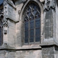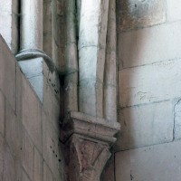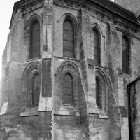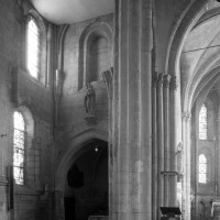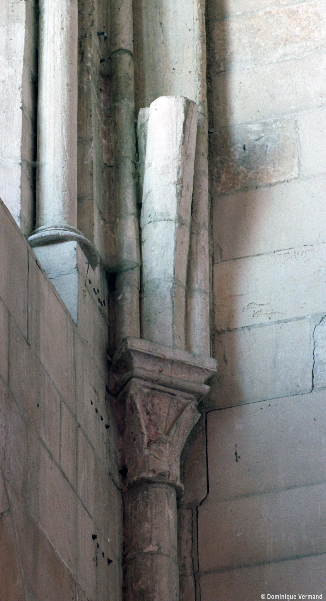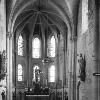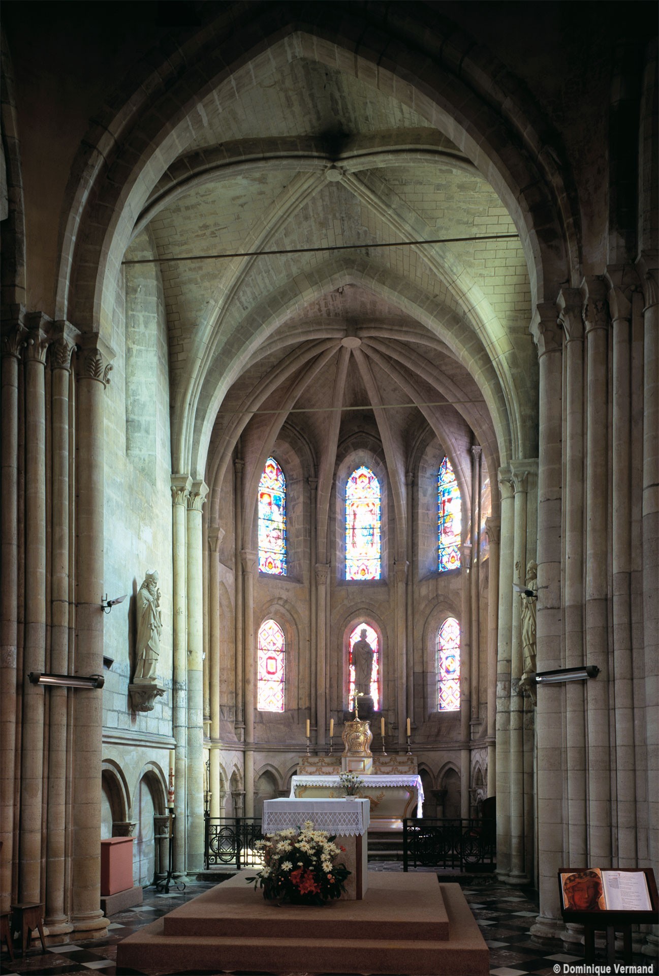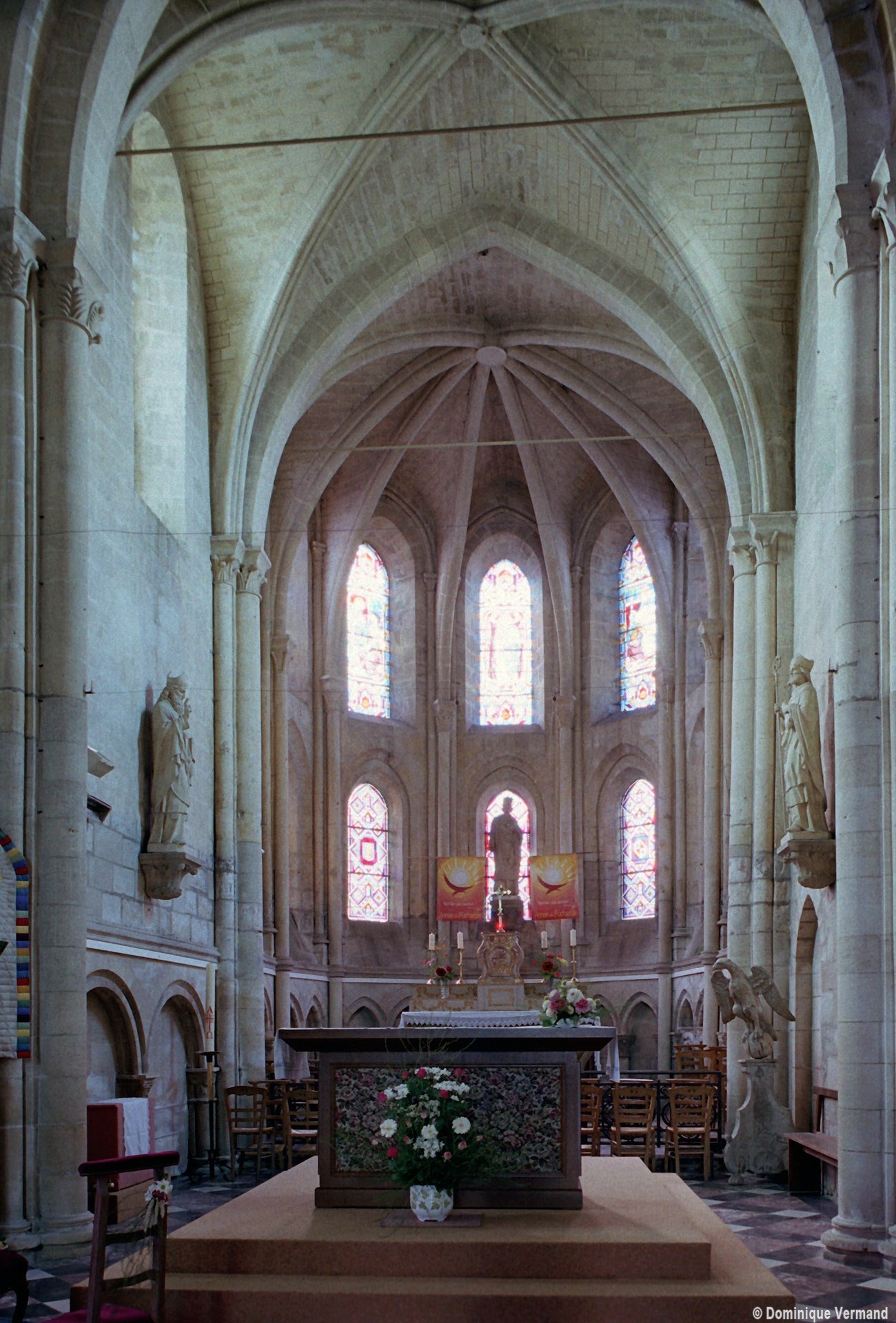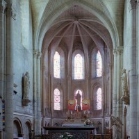 Le choeur est composé d’une travée droite et d’une abside à sept pans. L’élévation de cette dernière comporte trois niveaux. Le premier, qui forme soubassement, est allégé par des arcatures aveugles groupées par deux et reçues sur des colonnettes par l’intermédiaire de chapiteaux qui sont, pour la plupart, authentiques contrairement à tous les autres, qui ont été refaits au 19ème siècle. Les deux niveaux supérieurs sont constitués par deux rangées de fenêtres en forme de simple lancette. Profilées en amande, les ogives de la voûte retombent sur des colonnettes en délit (non appareillées avec les murs). La travée droite qui précède l’abside ne comporte pas de fenêtre au premier niveau en raison de la présence des chapelles greffées sur le transept (seule celle du nord est conservée).