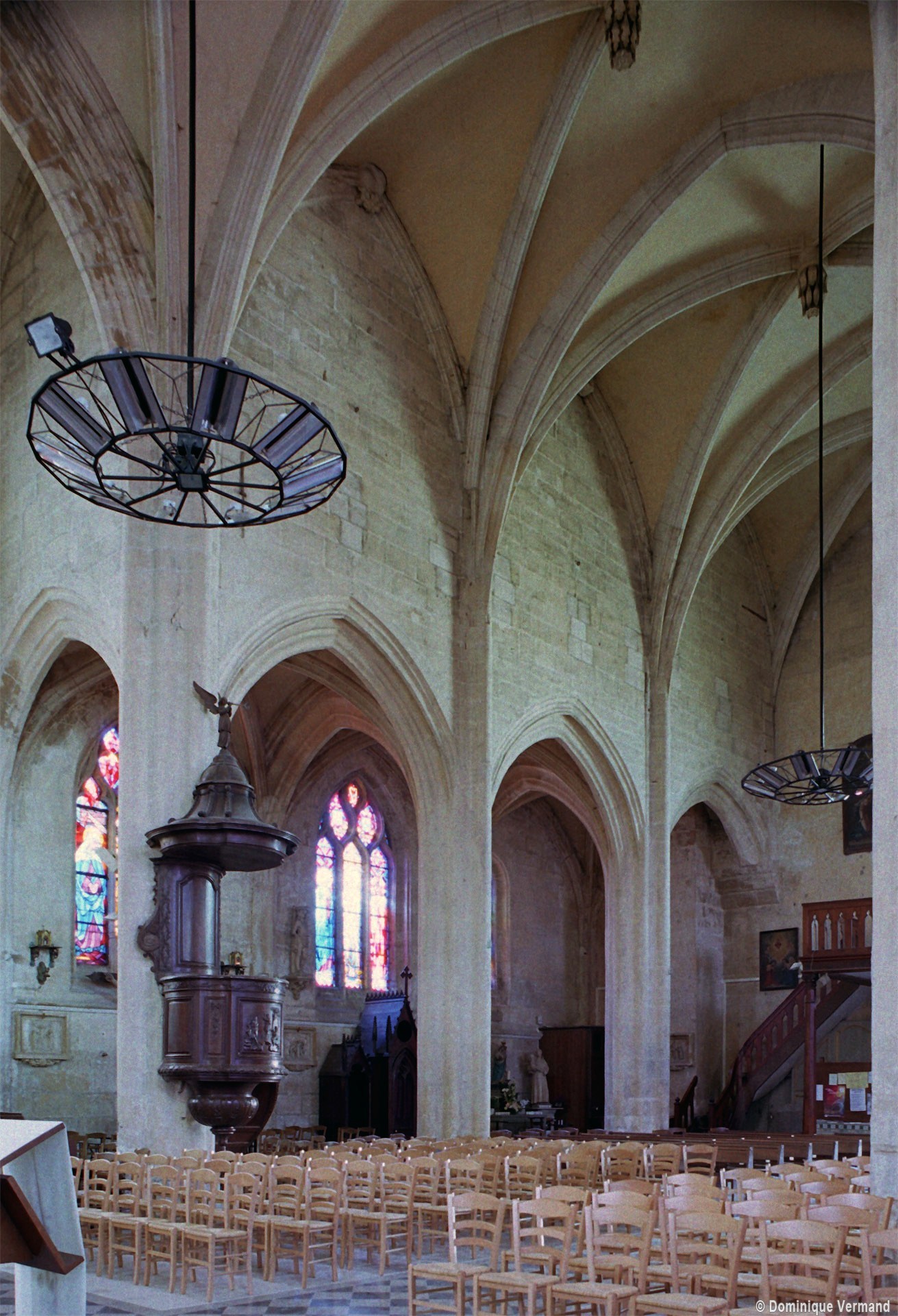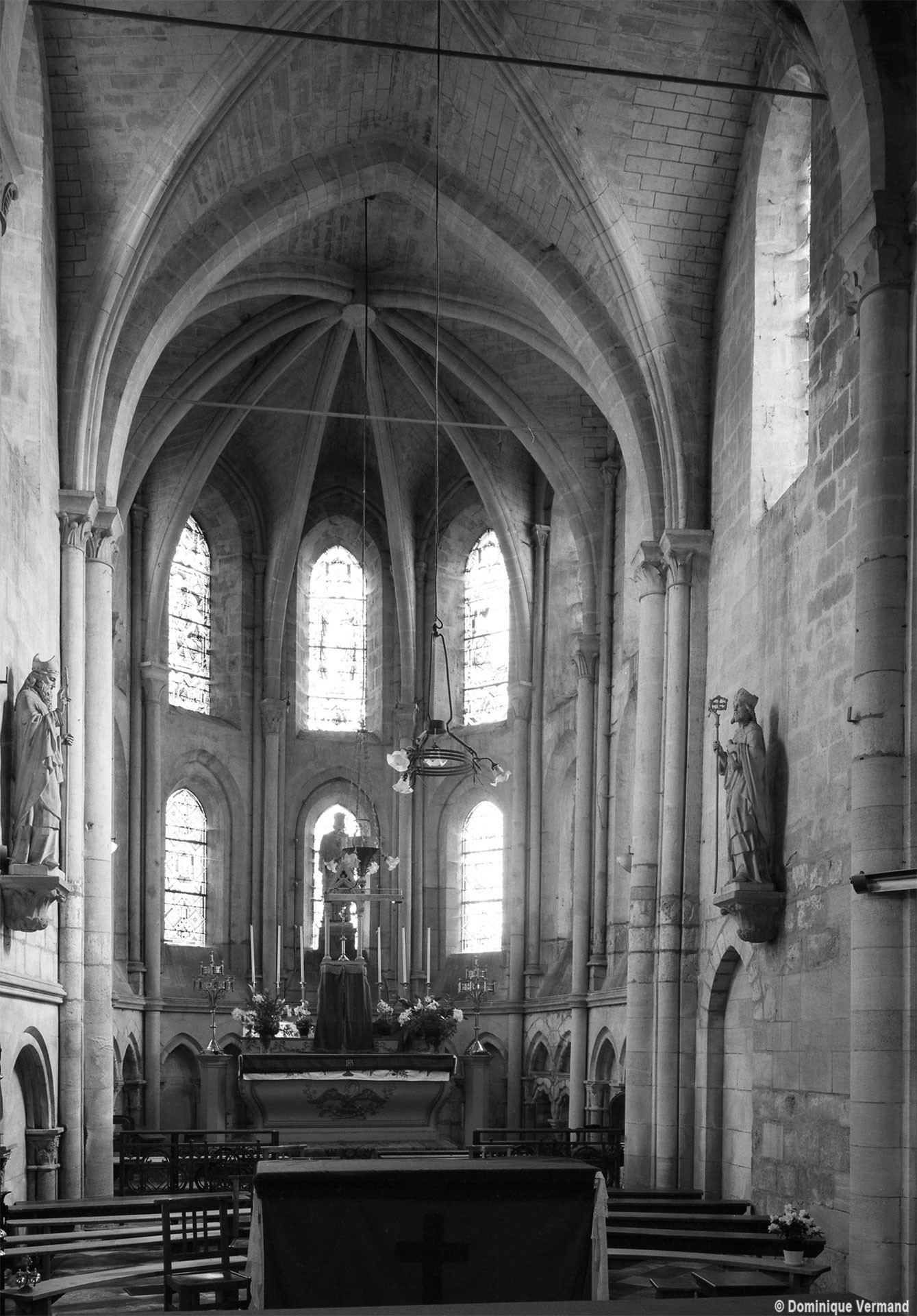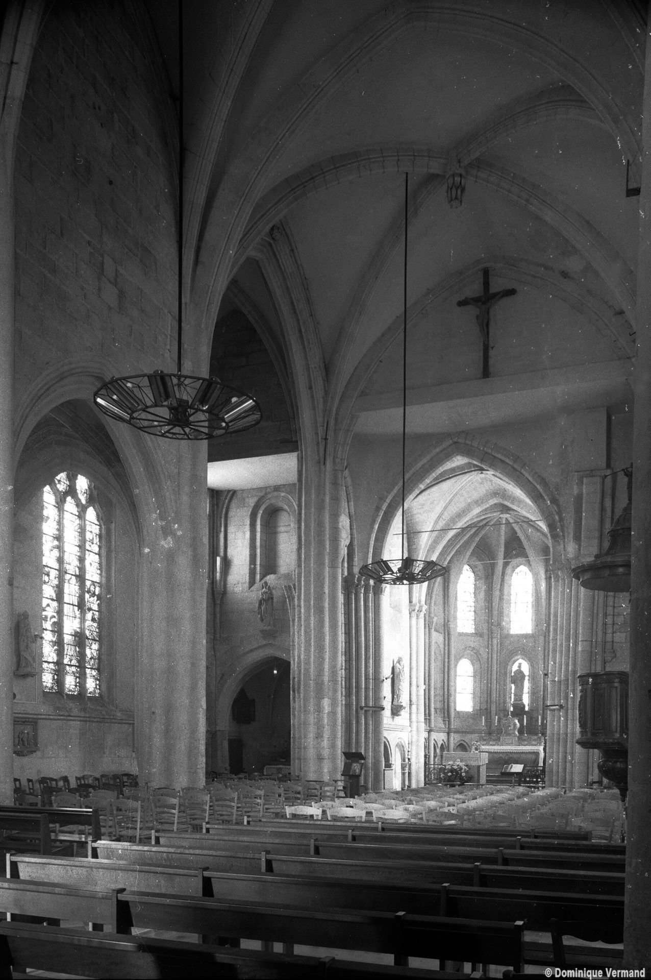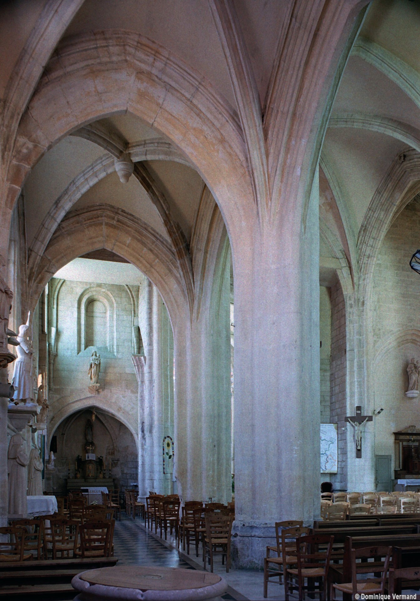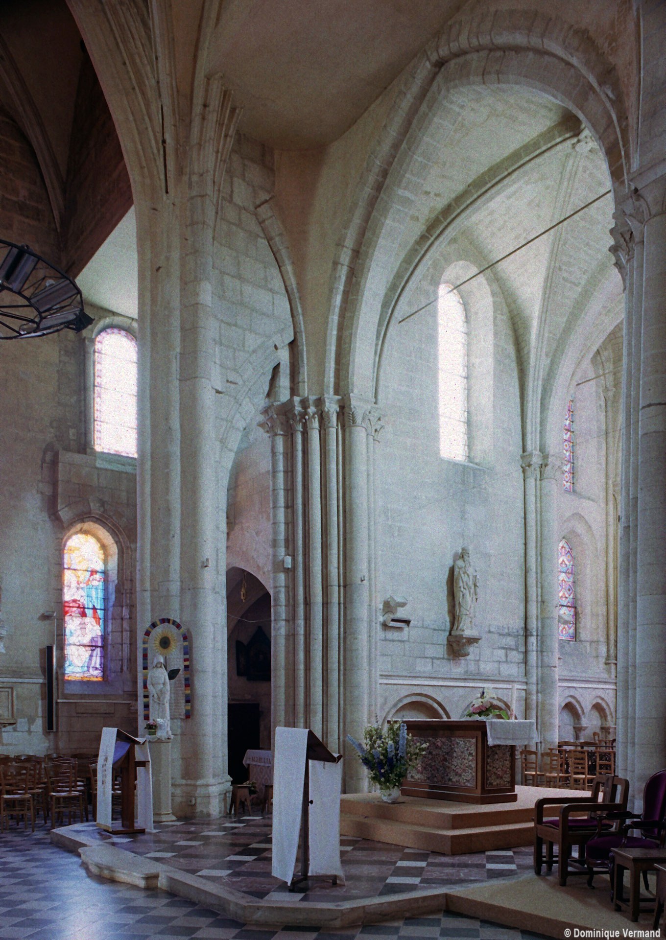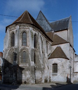 Saint-Nicolas et Saint-Louis (ce dernier vocable n’ayant été introduit qu’en 1709) est un vaste édifice appartenant à la fin du 12ème siècle (choeur) et au 16ème siècle (nef et transept). Bien que malmenées par des restaurations excessives et d’une grande sécheresse, les parties conservées du 12ème siècle permettent de restituer un ensemble oriental de belle ampleur qui se composait du choeur actuel flanqué de deux chapelles en hémicycle, le tout greffé sur un transept dont des témoins subsistent au nord.