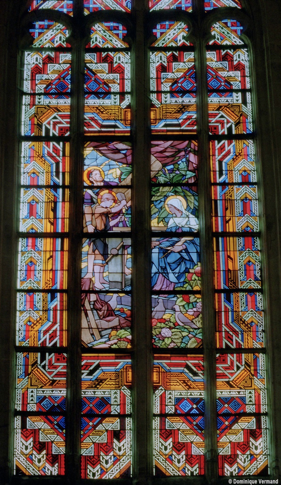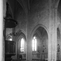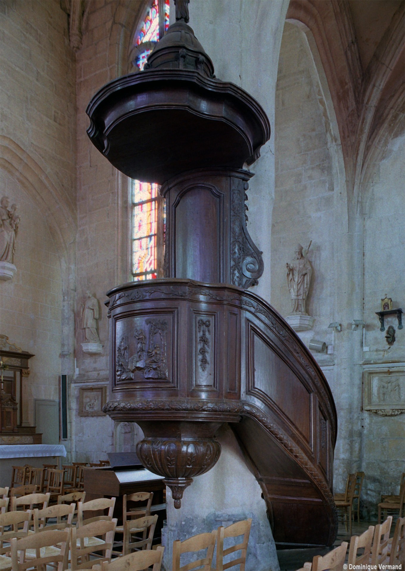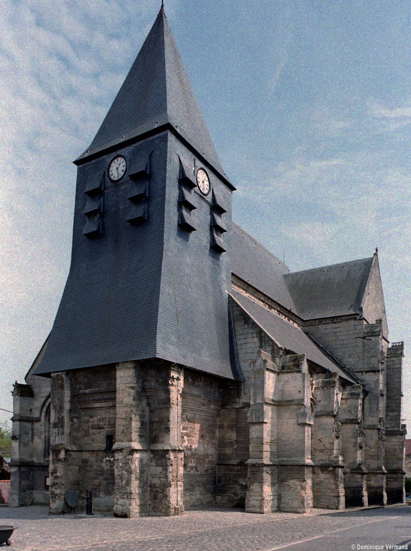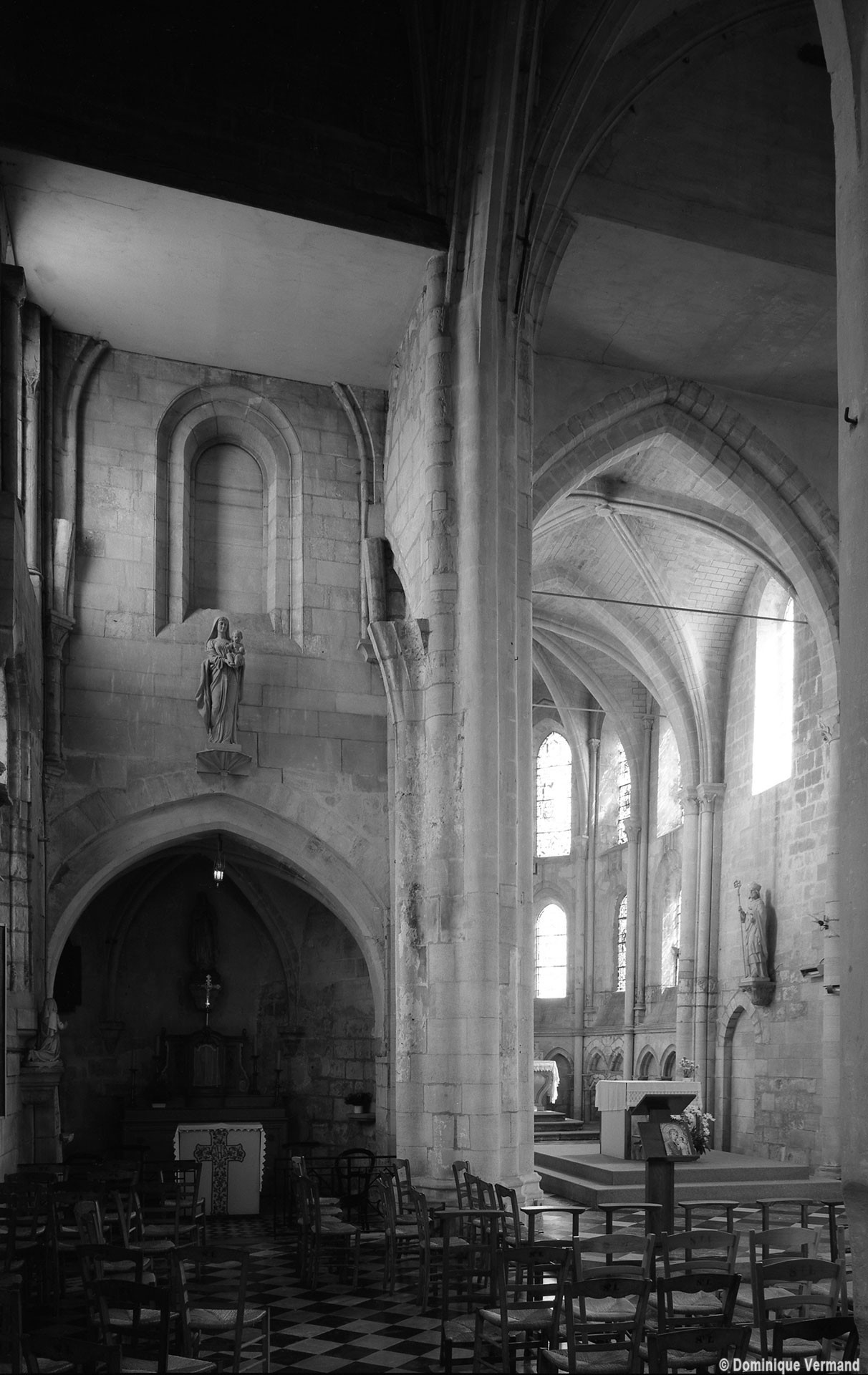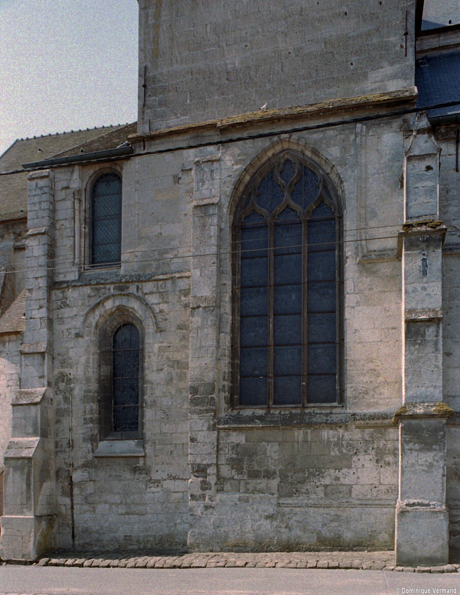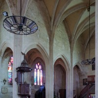 Saint-Nicolas et Saint-Louis (ce dernier vocable n’ayant été introduit qu’en 1709) est un vaste édifice appartenant à la fin du 12ème siècle (choeur) et au 16ème siècle (nef et transept). Bien que malmenées par des restaurations excessives et d’une grande sécheresse, les parties conservées du 12ème siècle permettent de restituer un ensemble oriental de belle ampleur qui se composait du choeur actuel flanqué de deux chapelles en hémicycle, le tout greffé sur un transept dont des témoins subsistent au nord.