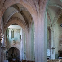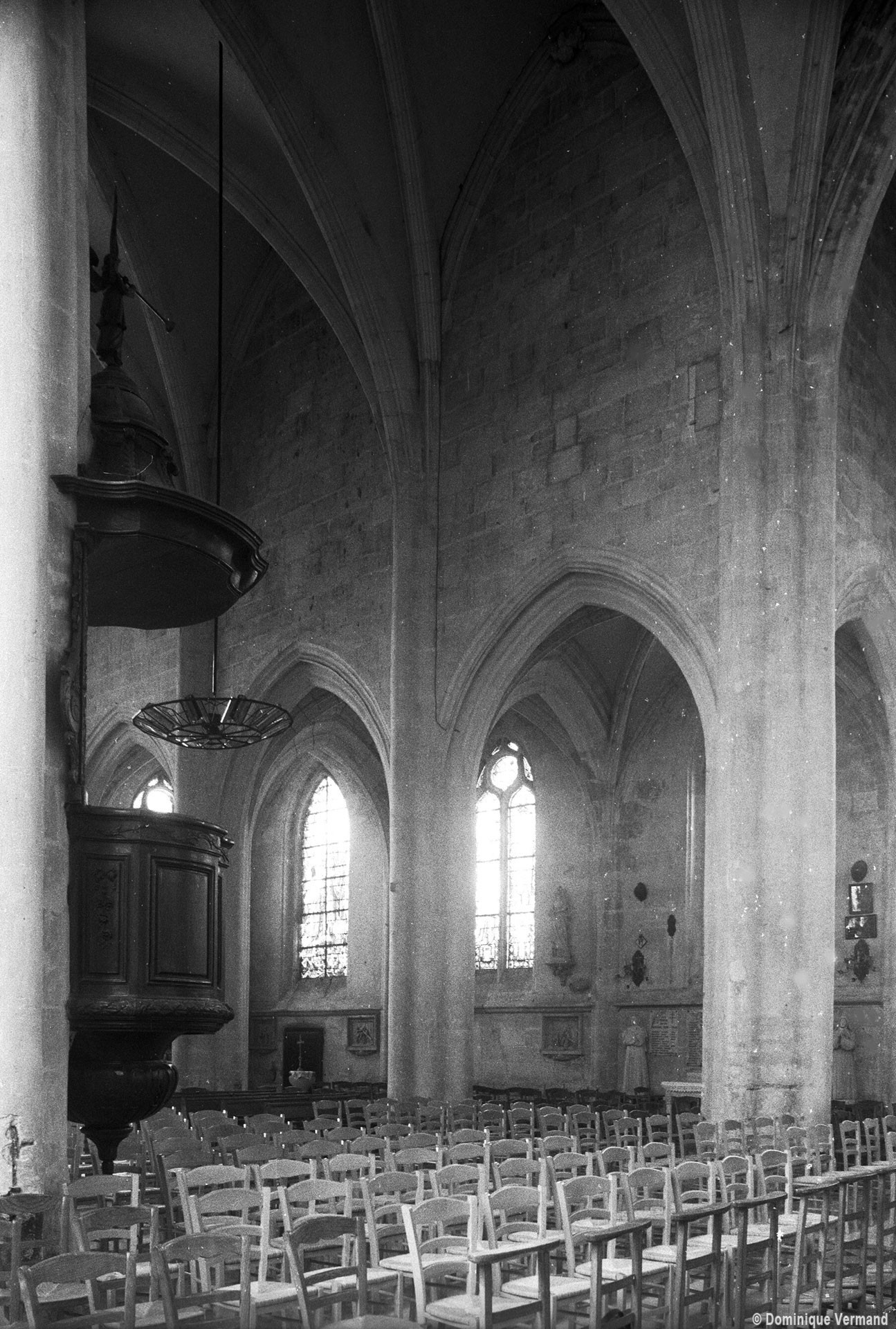 Cruellement éprouvée durant la Guerre de Cent ans, l’église est largement reconstruite au 16ème siècle (un pilier du transept porte les dates de 1549 et 1554). Elle est alors dotée d’une large nef de trois travées avec bas-côtés et d’un transept dont la croisée repose au nord-est sur une pile implantée à peu de distance de l’ancienne pile de croisée du 12ème siècle, disposition insolite qui peut s’expliquer par le non achèvement des travaux de reconstruction sur ce côté. L’ensemble, avec ses piles ondulées et ses fenêtres à réseau flamboyant, est caractéristique de la fin du gothique. Les voûtes du vaisseau central et du transept n’ont été complétées qu’au 19ème siècle. A l’extérieur, le bas-côté sud a reçu une décoration particulièrement soignée, avec dais et pinacles aux contreforts. Inachevé ou partiellement détruit, le clocher, implanté en façade, reçoit une imposante couverture en ardoise.