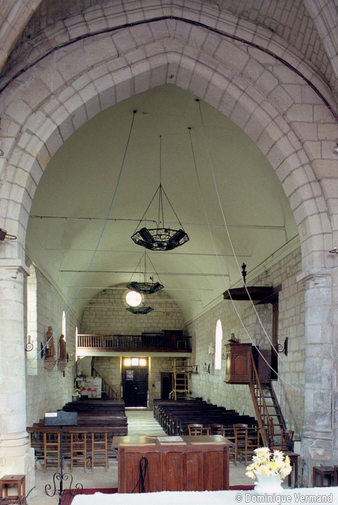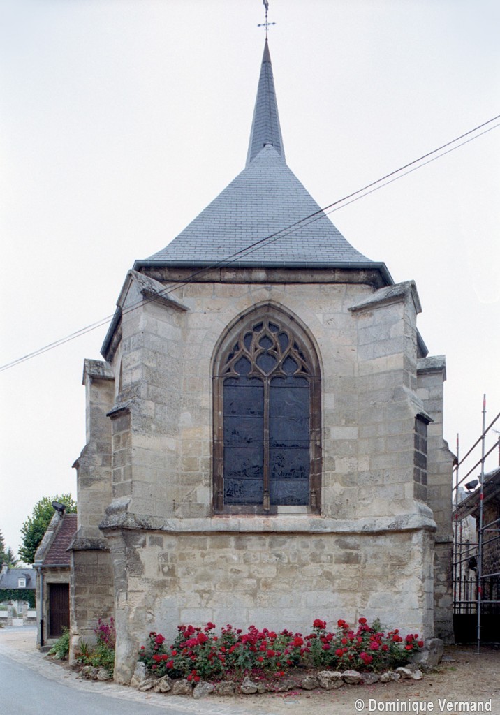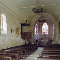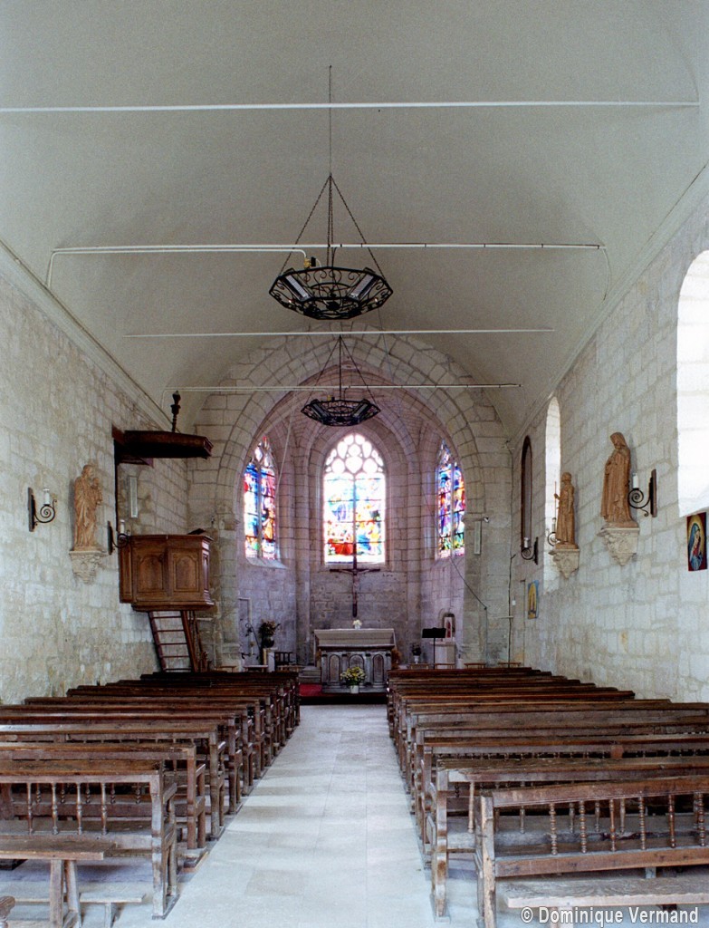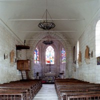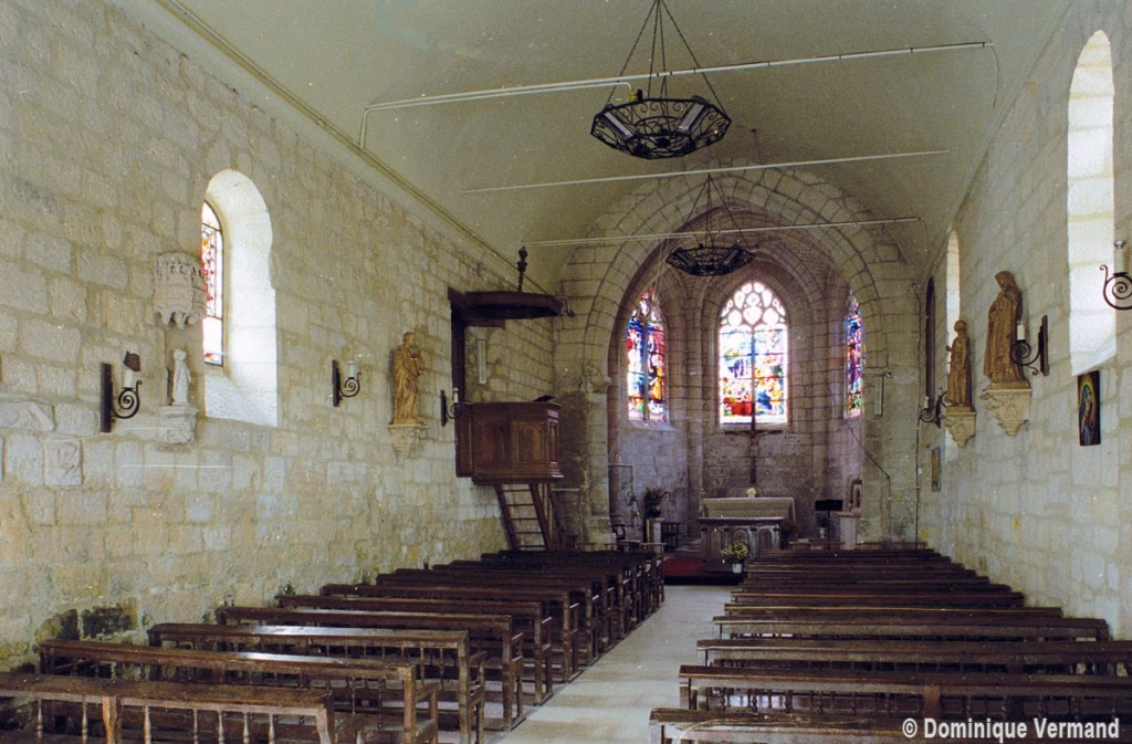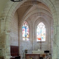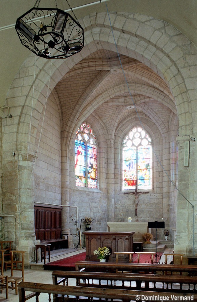 Le chœur est bien mieux caractérisé et appartient au 16ème siècle. Plus haut que la nef comme c’est souvent le cas à cette époque, il communique avec celle-ci par un arc triomphal (arc séparant la nef du chœur) de forme brisée. La retombée s’effectue sur des tailloirs associés, aux angles, à des petites consoles, rappel discret des chapiteaux des époques précédentes. Les nervures des deux voûtes retombent par pénétration dans les supports. Les cinq fenêtres ont un remplage de style gothique flamboyant. A l’extérieur, la stabilité de cette partie de l’église est confiée à des contreforts en forte saillie dont le ressaut inférieur comporte un larmier qui se poursuit tout autour de la construction et se confond avec l’appui des fenêtres.