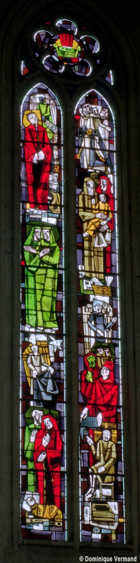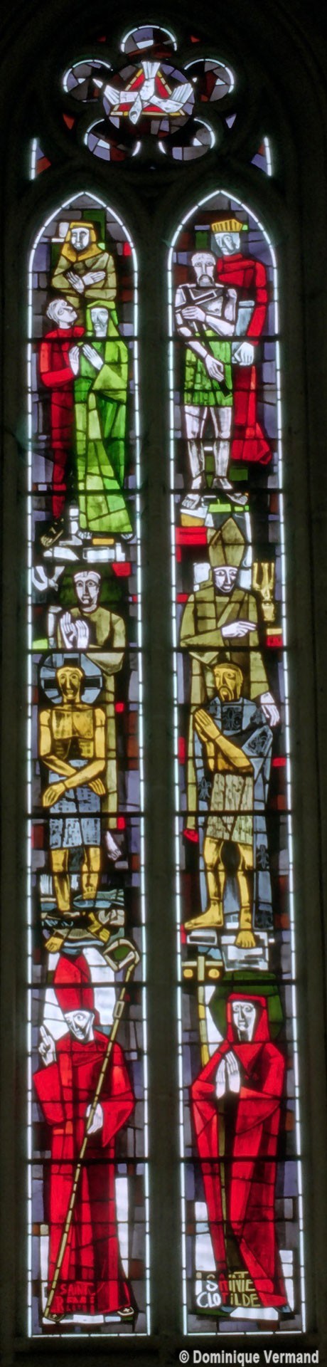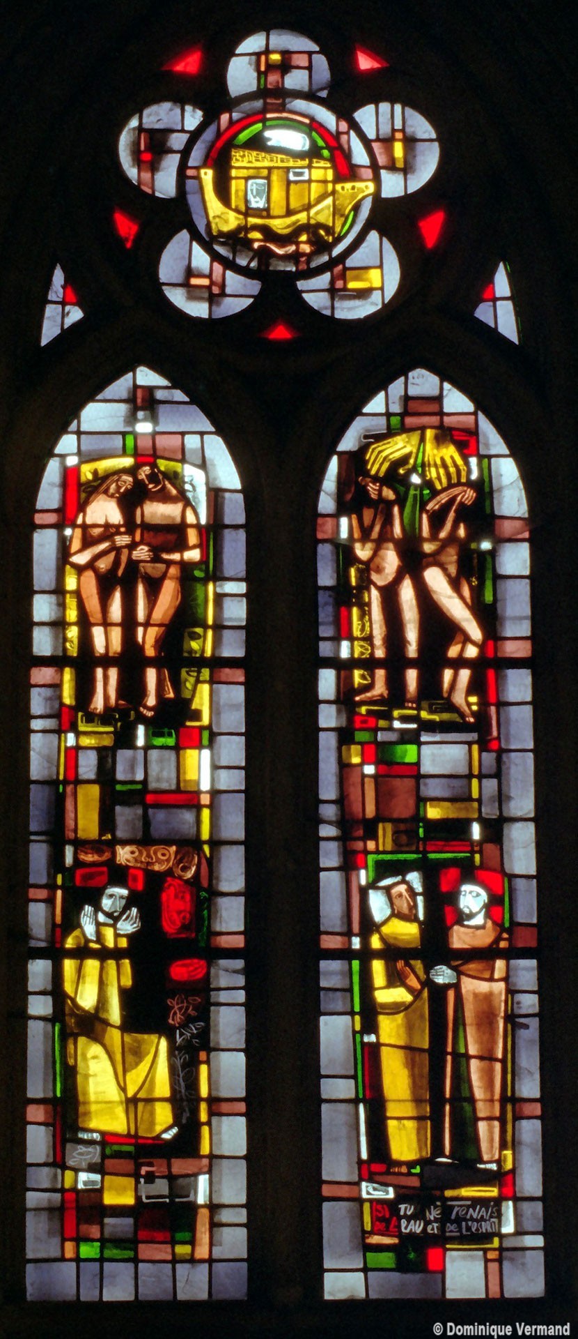 Les deux fenêtres du baptistère et celles des trois pans médians de l’abside sont pourvues de vitraux réalisées en 1954-55, dans un style bien représentatif de l’époque, par le maître verrier Pierre-François Chevalley (2008).