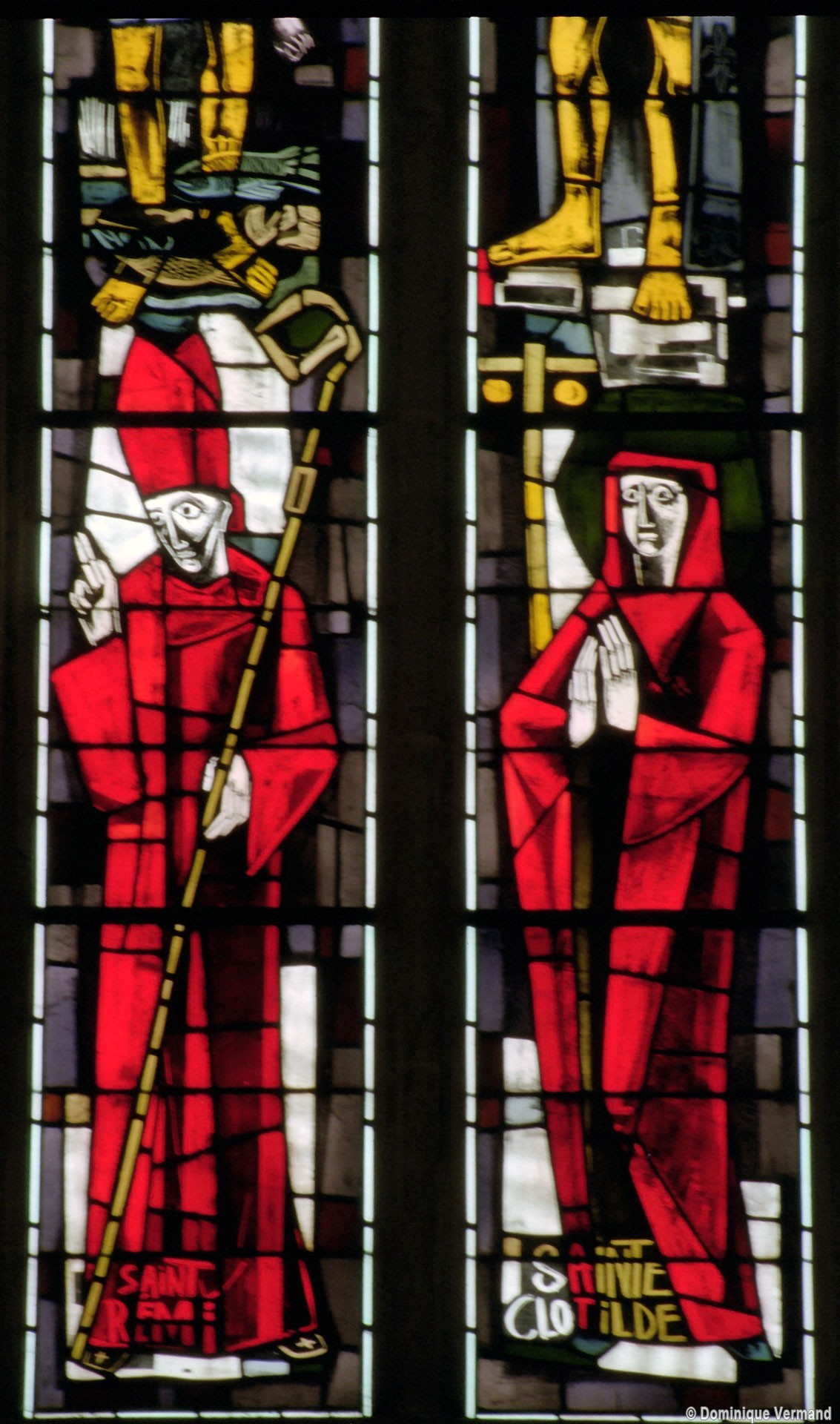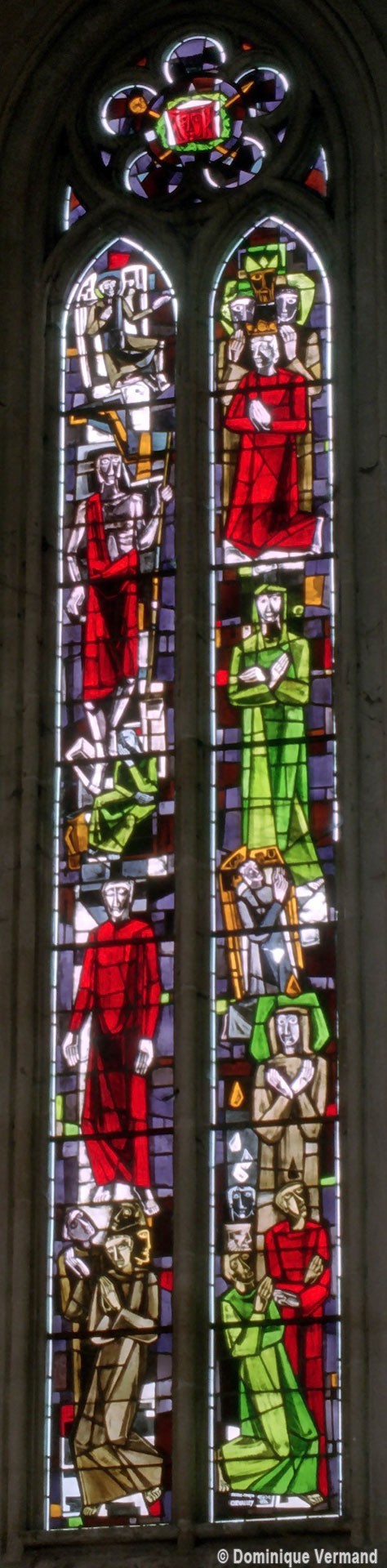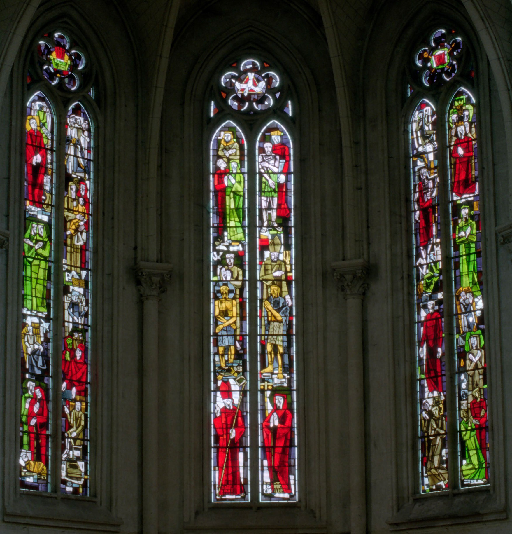 Les deux fenêtres du baptistère et celles des trois pans médians de l’abside sont pourvues de vitraux réalisées en 1954-55, dans un style bien représentatif de l’époque, par le maître verrier Pierre-François Chevalley (2008).