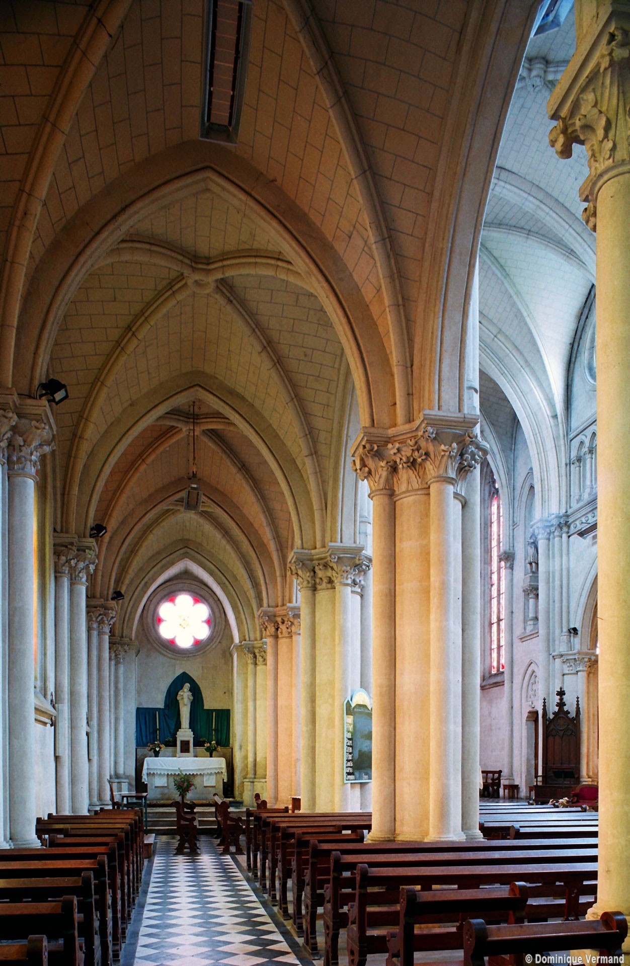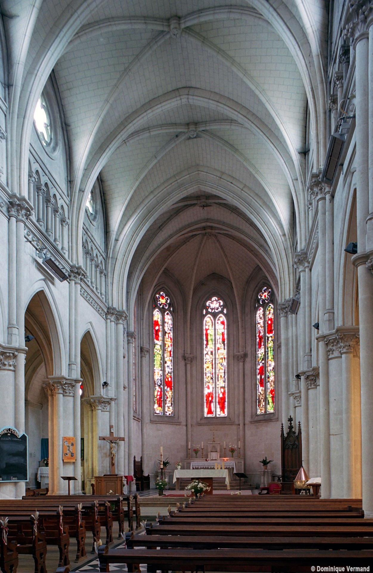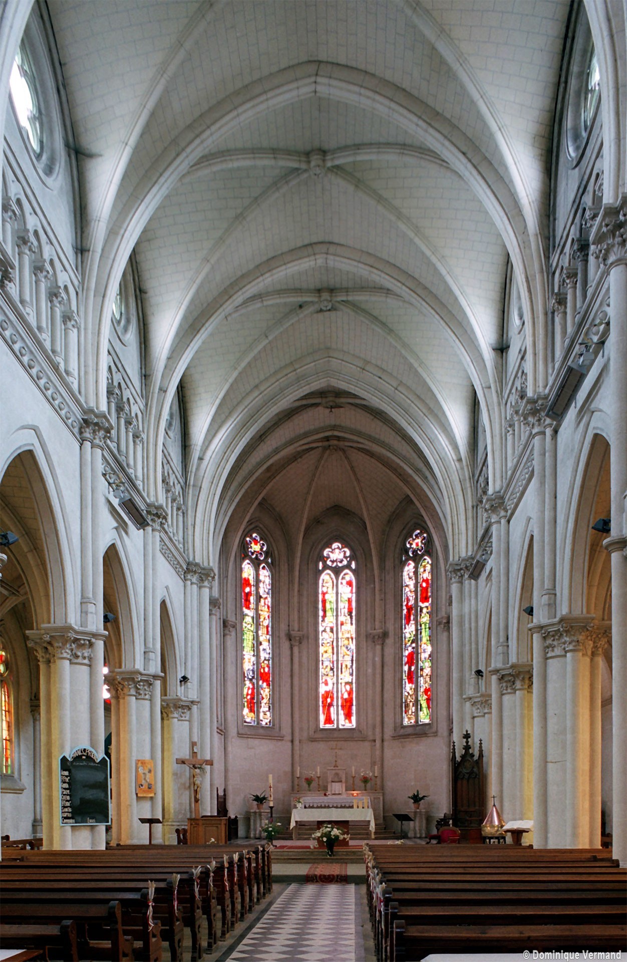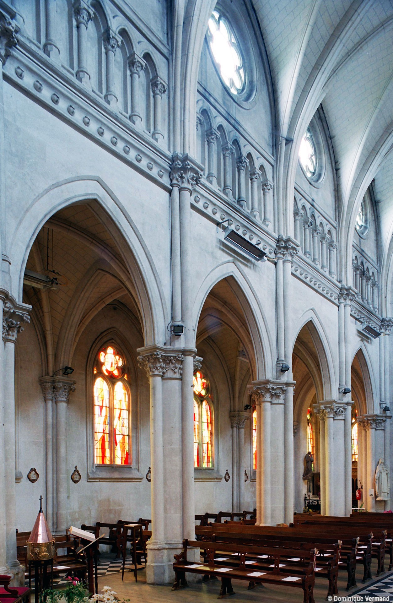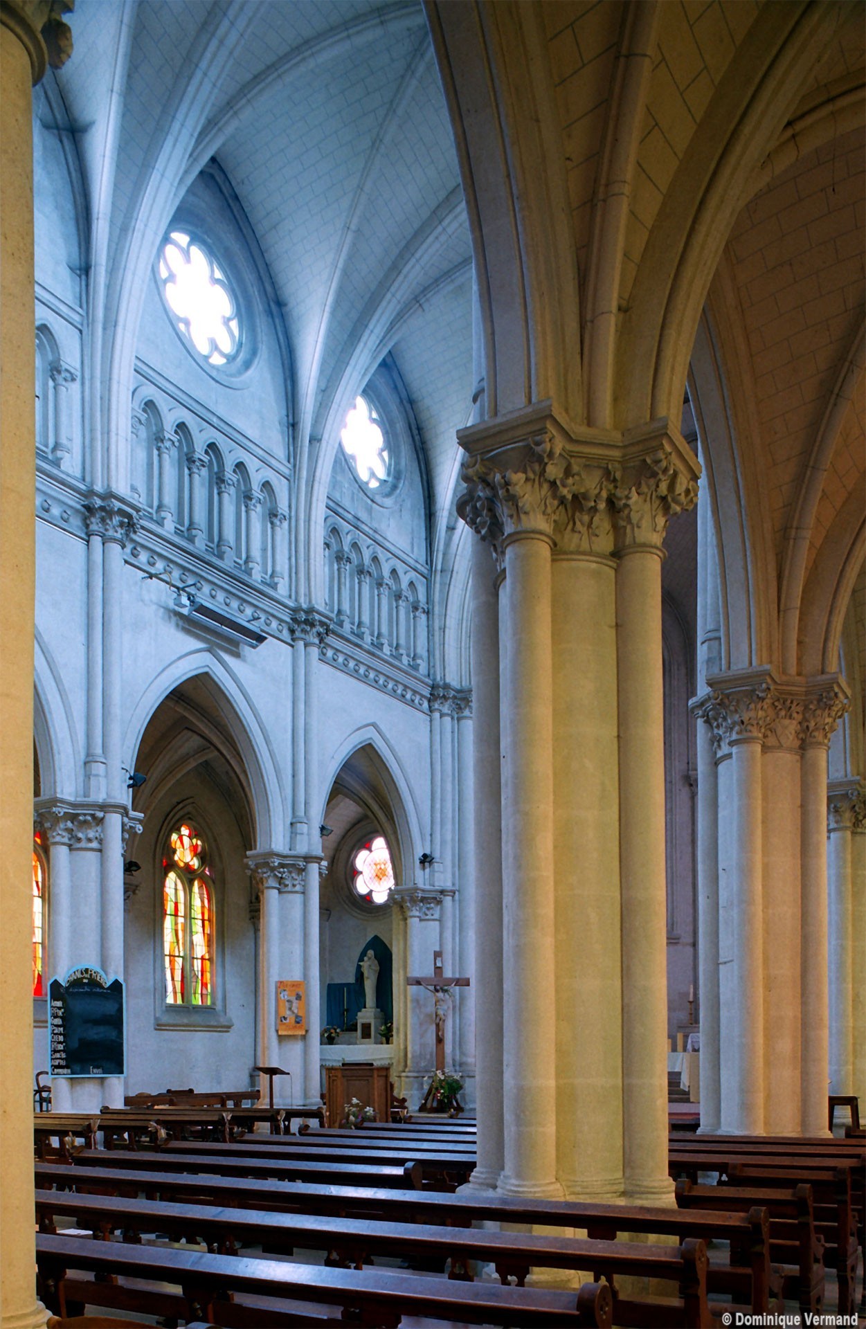 Bien que l’église n’échappe pas à la sécheresse propre à nombre d’édifices religieux du 19ème siècle, elle n’en propose pas moins un répertoire assez précis d’éléments architecturaux caractéristiques du 13ème siècle. Ainsi les piliers cantonnés (un noyau circulaire flanqué de quatre demi-colonnes) de la nef sont-ils ceux des grandes cathédrales de l’époque, dont Amiens fournit le plus proche exemple. Il en est de même de la sculpture des chapiteaux à crochets et des fenêtres à doubles lancettes surmontées d’une rose à cinq lobes.
