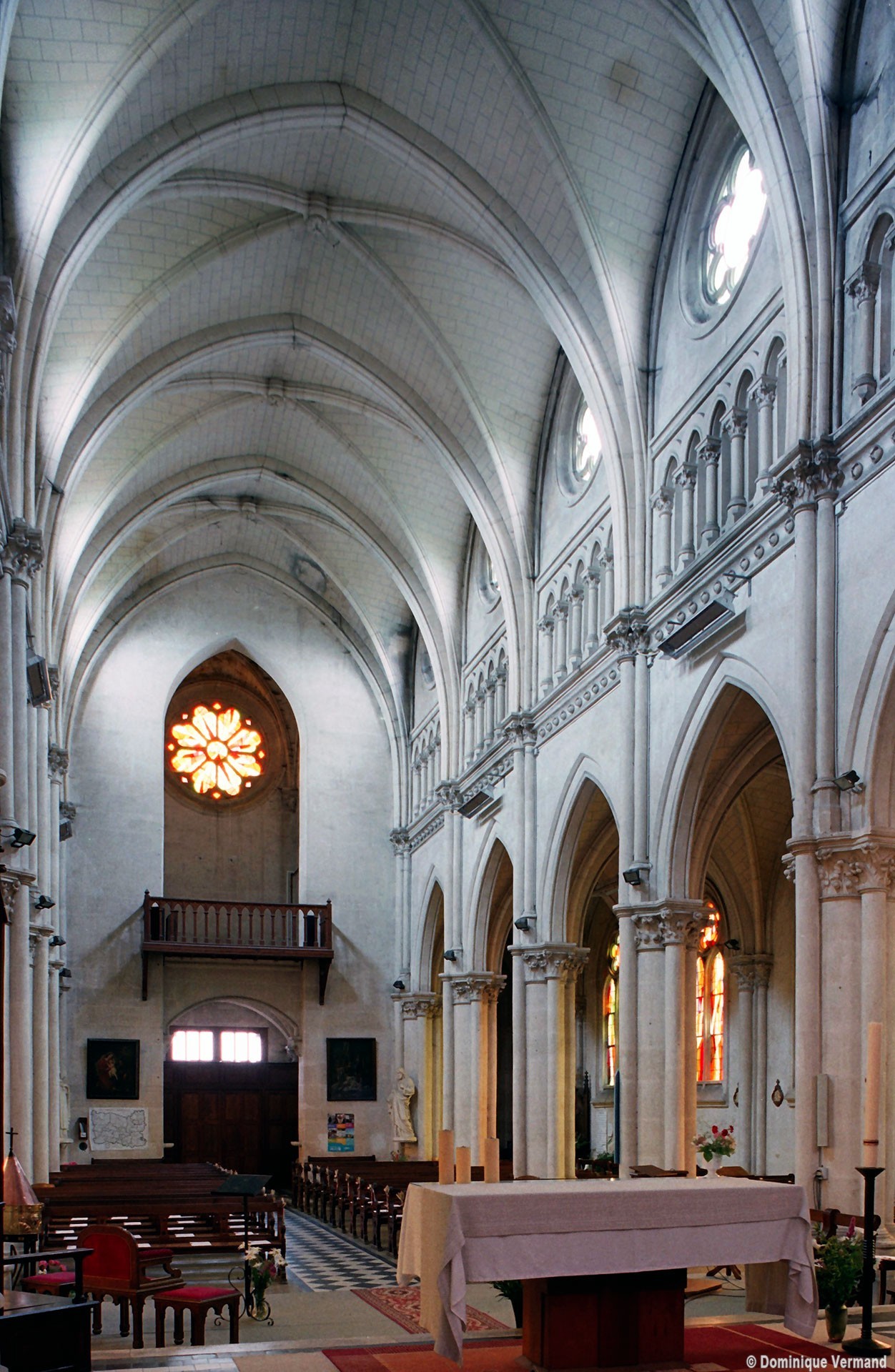Inscrit entre la lunette des voûtes et le bandeau sculpté qui court au-dessus des grandes arcades, l’étage supérieur associe un triforium composé de cinq arcatures aveugles et une rose polylobée qui font clairement référence à l’architecture de l’époque en Ile-de-France. En façade, le portail à gâble et la rose qui le surmonte s’inscrivent dans la même veine.