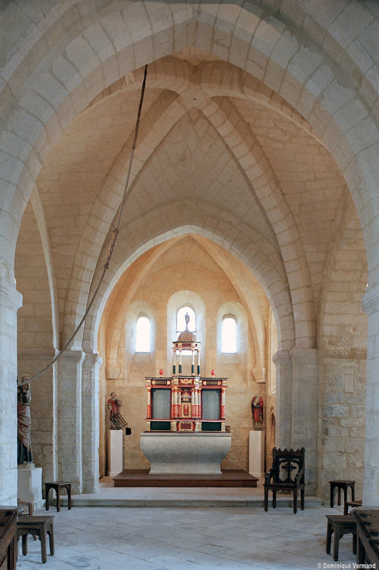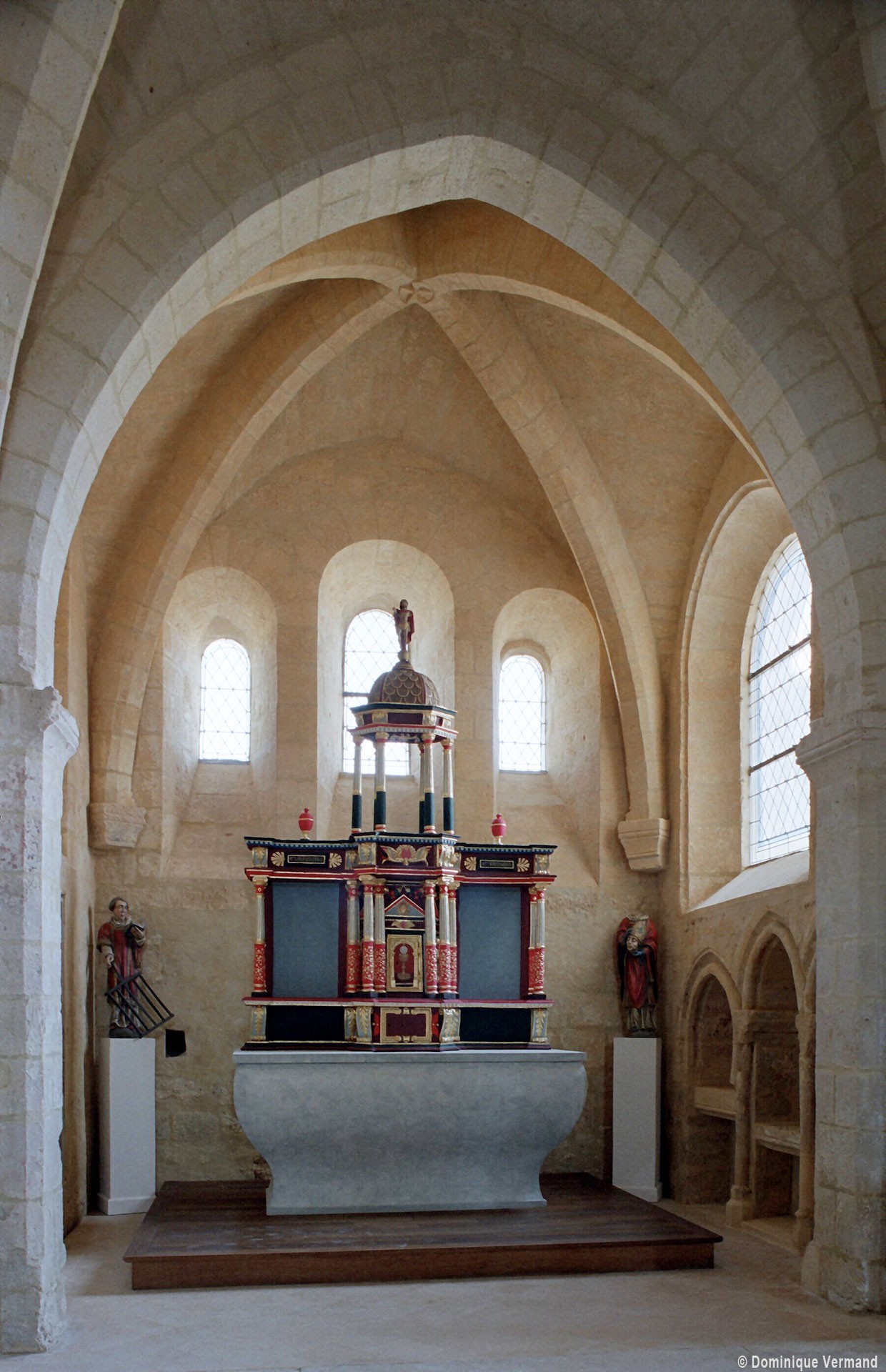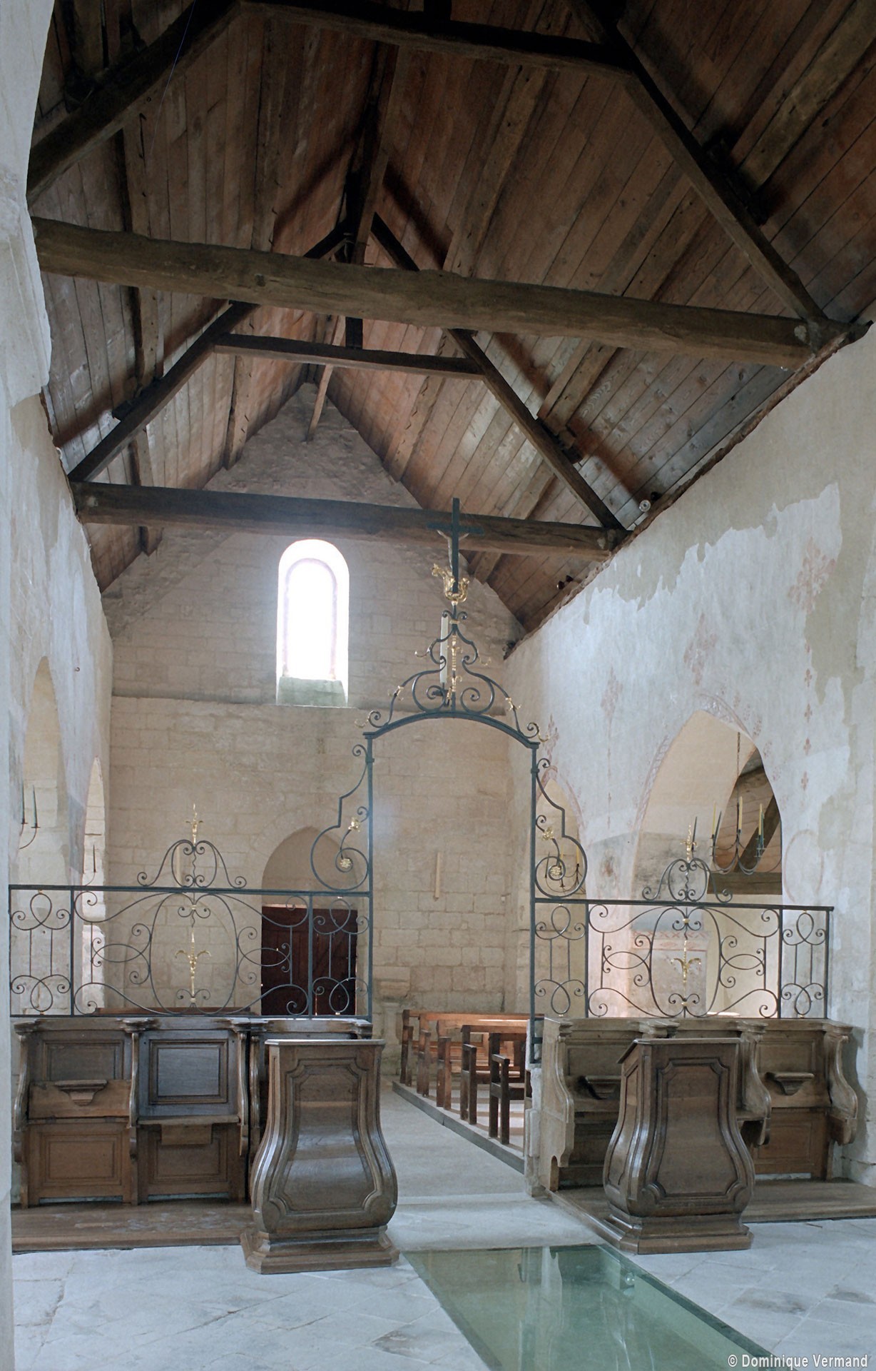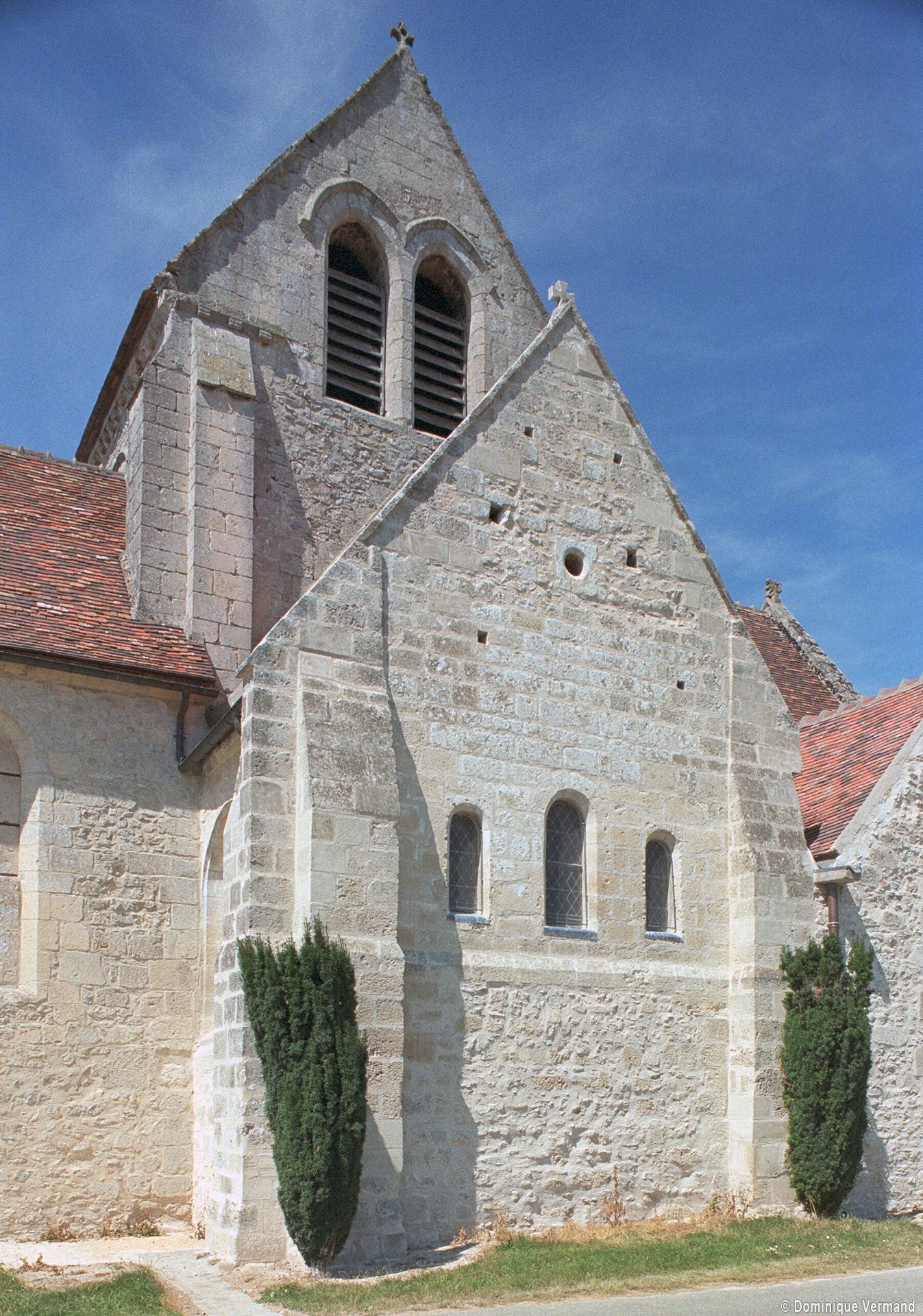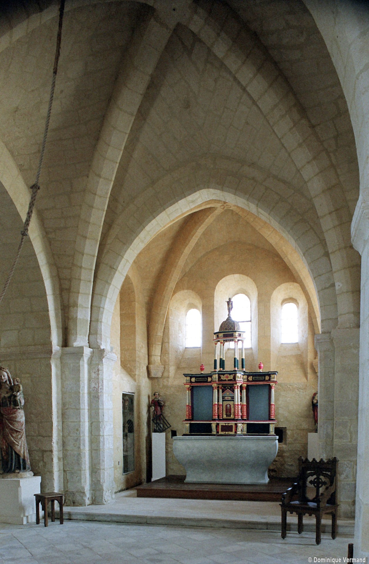 Le chœur est d’un grand intérêt en raison des deux voûtes d’ogives qu’il conserve et qui sont contemporaines de celles de Morienval. Les ogives adoptent un profil carré à arêtes chanfreinées, comme dans plusieurs voûtes d’ogives du Beauvaisis de la première moitié du 12ème siècle. Les retombées se font, soit sur des consoles nues, soit sur des dosserets. Le fait que ceux-ci ne soient pas disposés dans l’axe des ogives mais parallèlement aux murs; que les voûtains soient très bombés et que leur appareillage soit réalisé perpendiculairement aux ogives et non aux arcs encadrant la voûte plaide en faveur d’une date de construction dans les années 1130 au plus tard. Le chevet est classiquement percé d’un triplet, d’un très bel effet depuis l’intérieur de l’église.